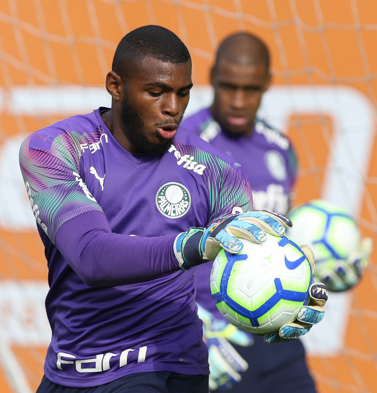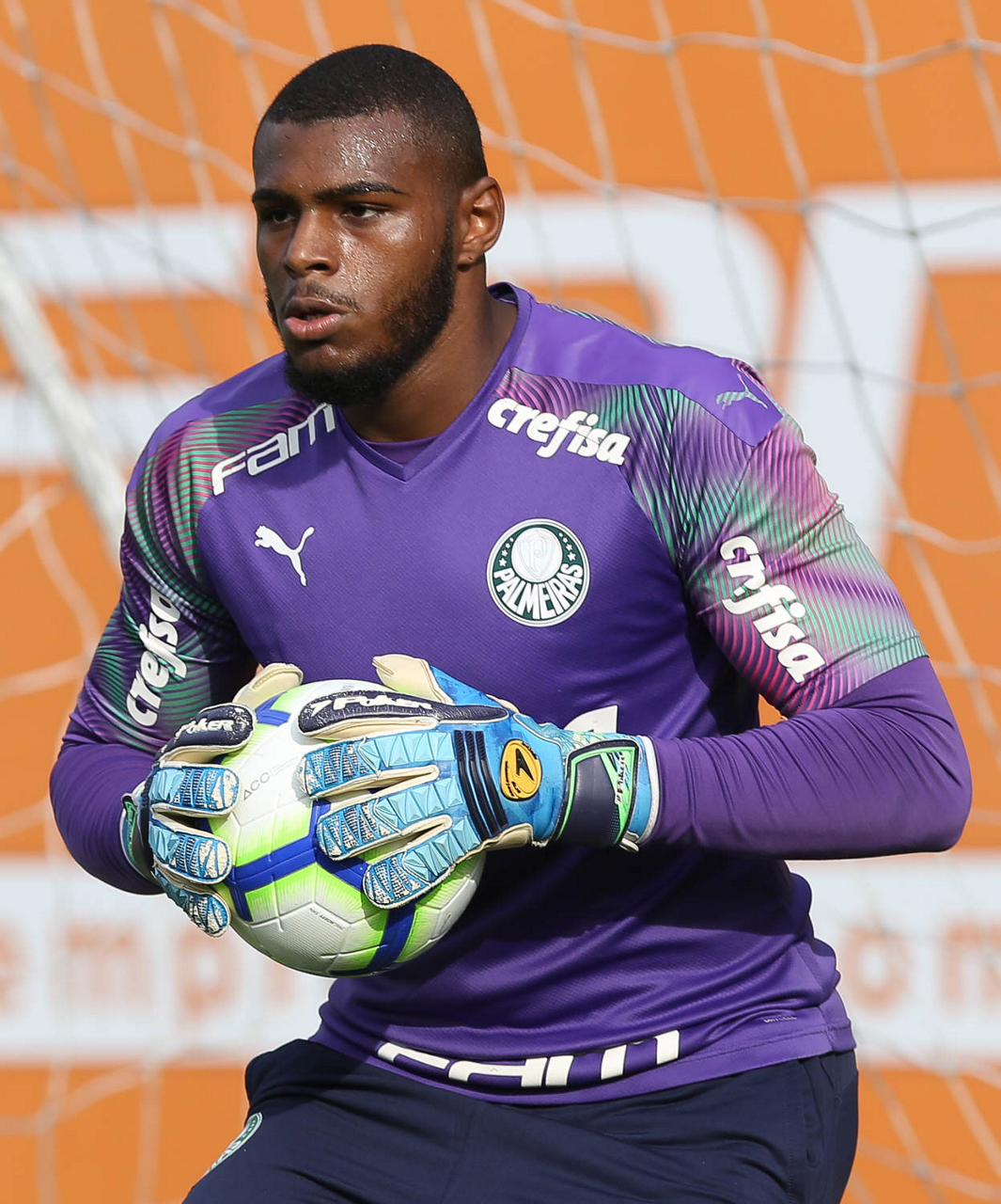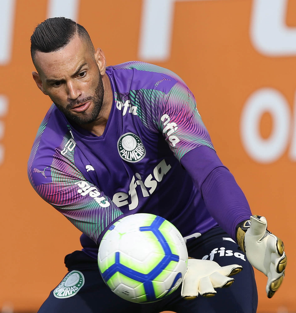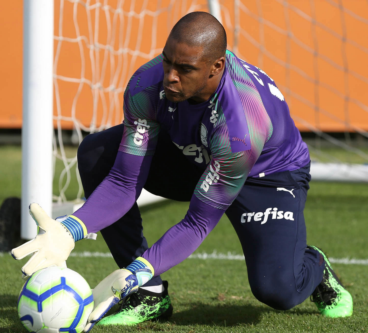 O goleiro Weverton, da SE Palmeiras, durante treinamento, na Academia de Futebol.