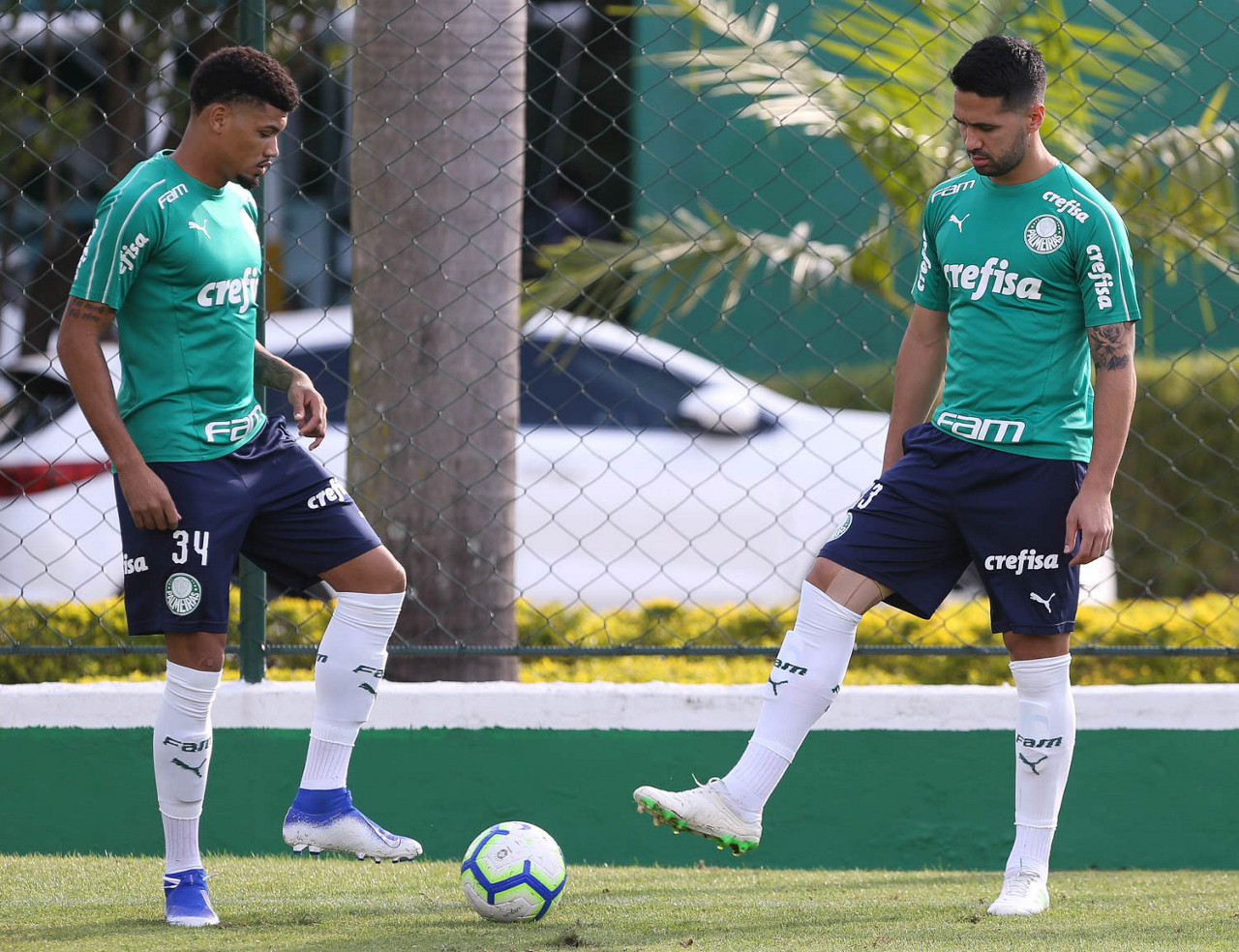 Os jogadores Juninho e Luan (D), da SE Palmeiras, durante treinamento, na Academia de Futebol.