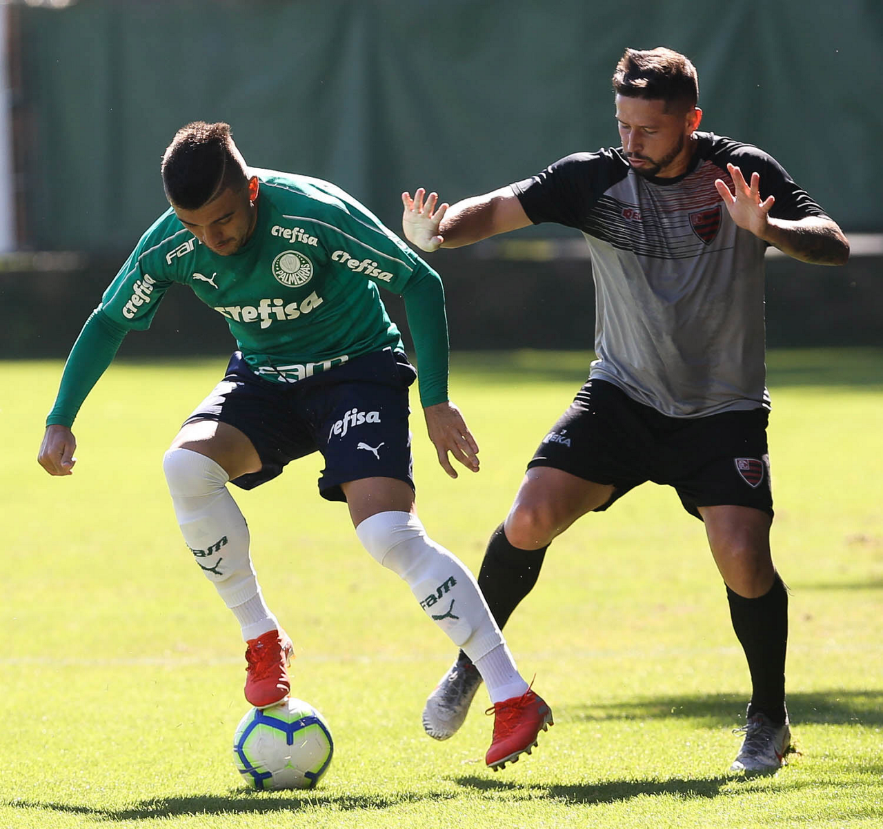 Os jogadores Deyverson e Diogo Barbosa (D), da SE Palmeiras, durante jogo-treino contra a equipe do Oeste, na Academia de Futebol.