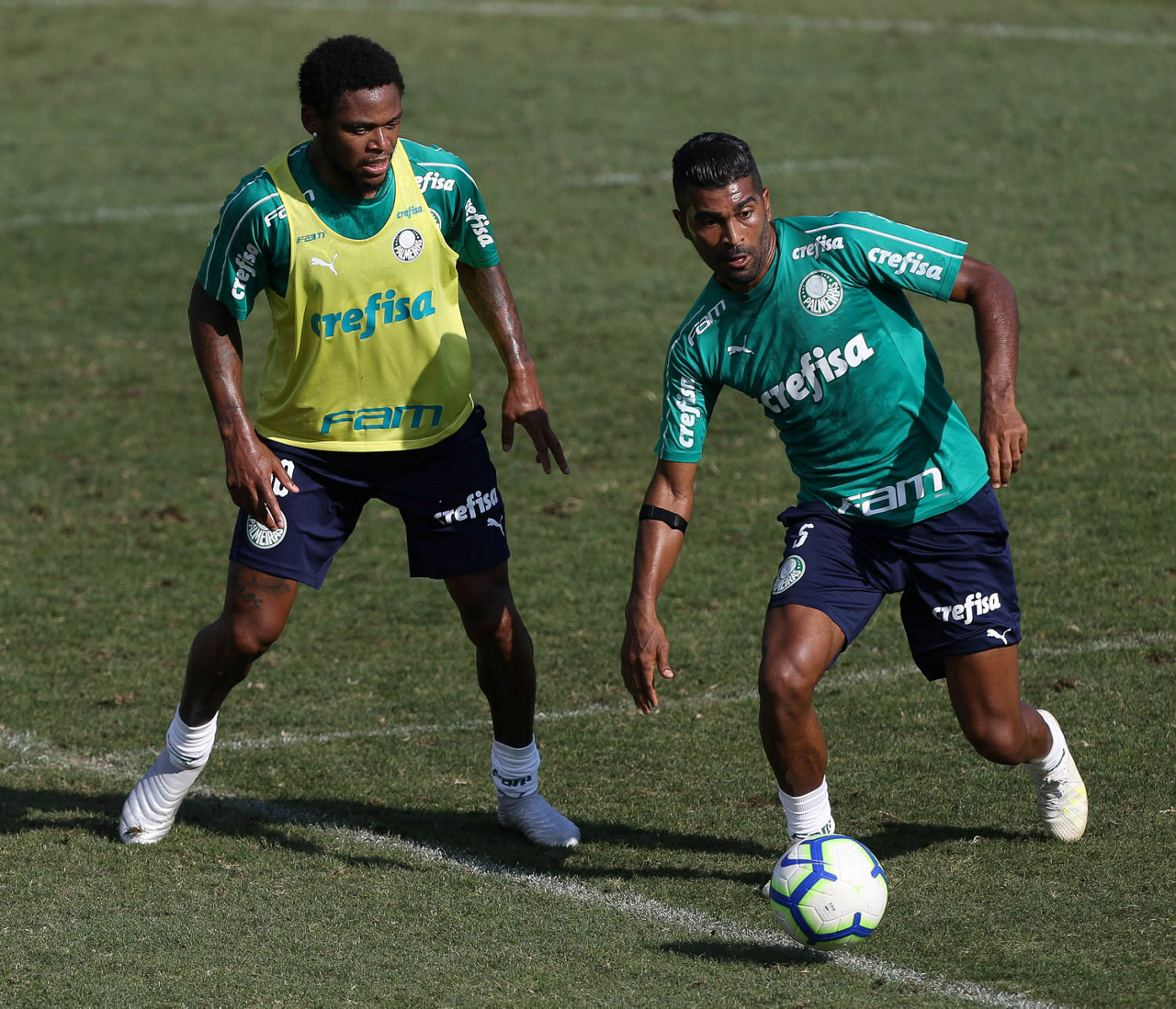 Os jogadores Thiago Santos e Raphael Veiga (D), da SE Palmeiras, durante treinamento, na Academia de Futebol.