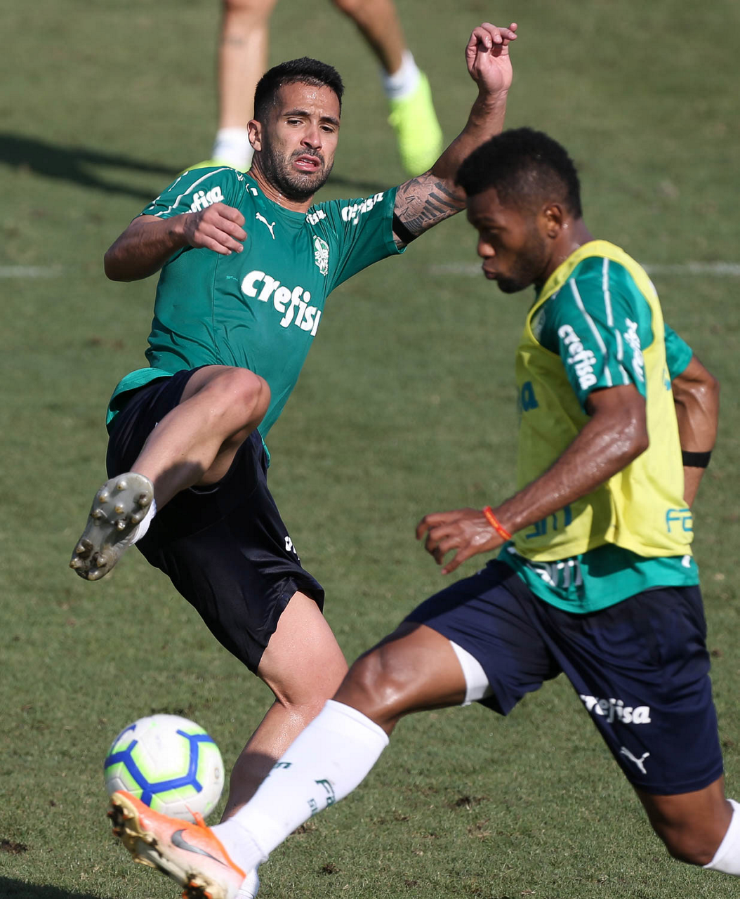 Os jogadores Borja e Thiago Santos (D), da SE Palmeiras, durante treinamento, na Academia de Futebol.
