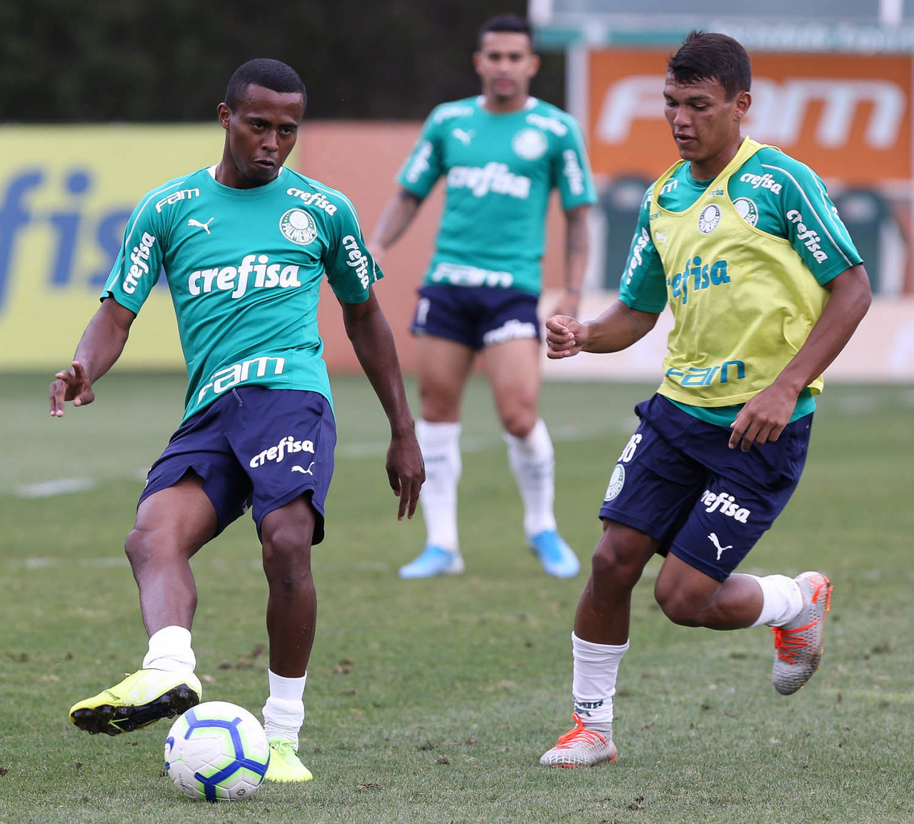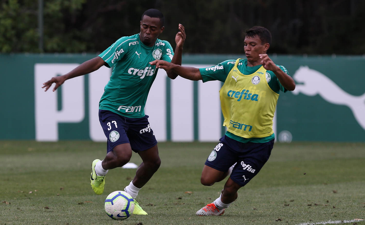 Os jogadores Borja e Gabriel Veron (D), da SE Palmeiras, durante treinamento, na Academia de Futebol.
