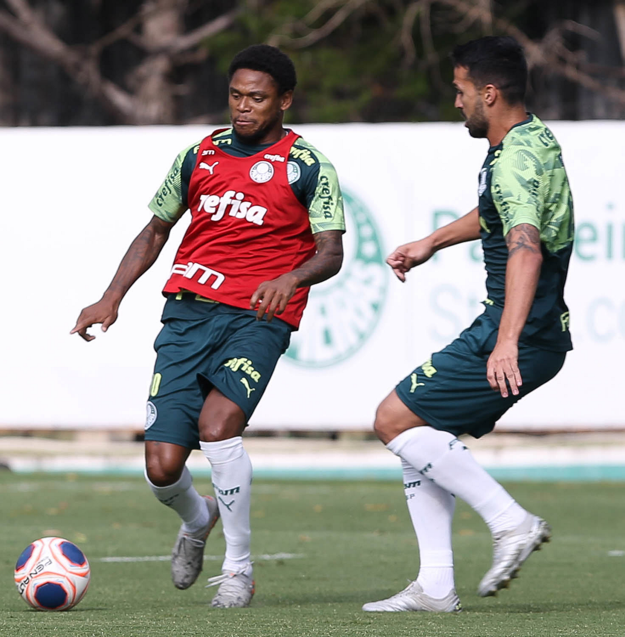 Os jogadores Luiz Adriano e Luan (D), da SE Palmeiras, durante treinamento, na Academia de Futebol. (Foto: Cesar Greco)