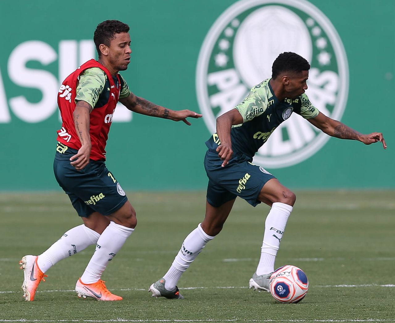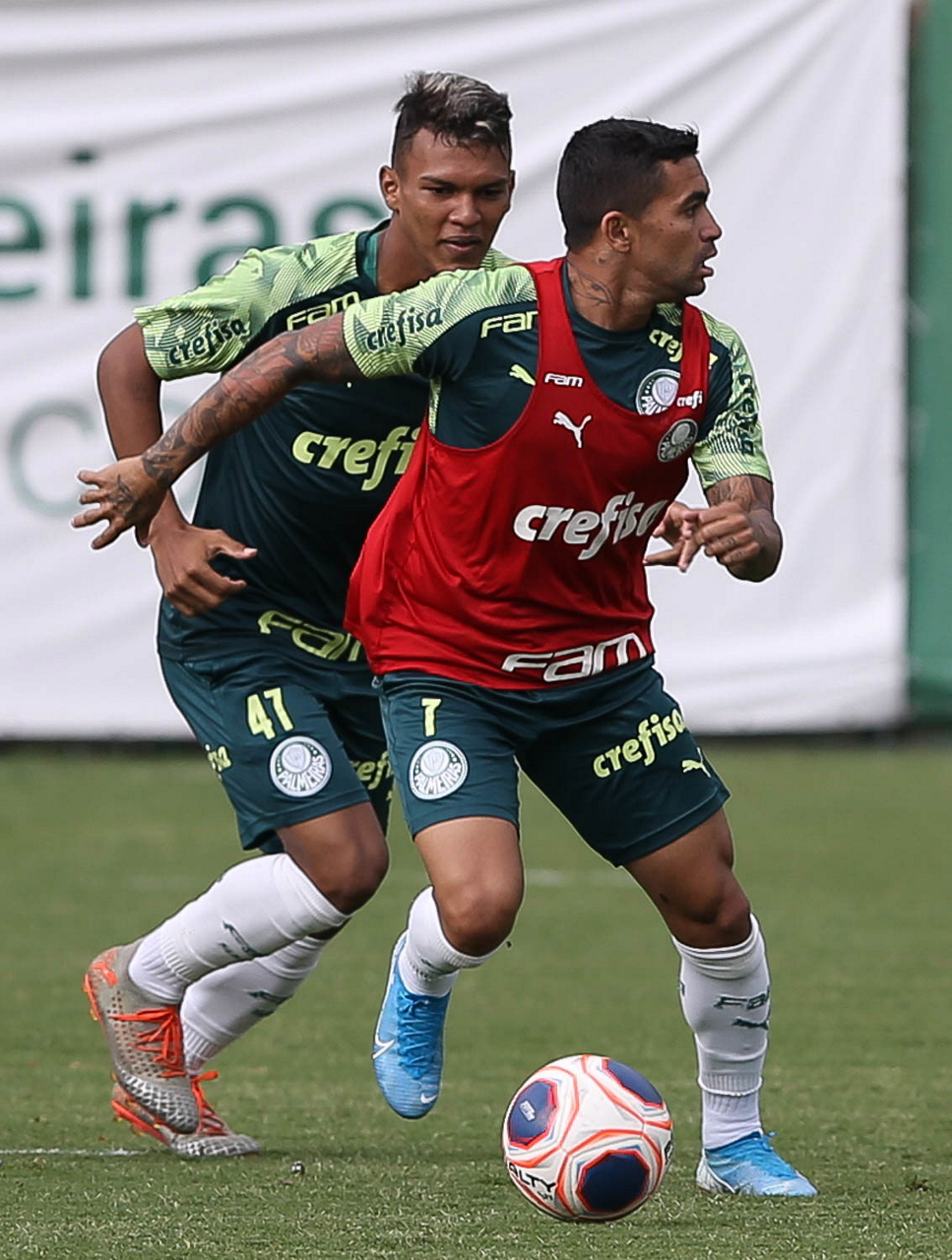 Os jogadores Gabriel Veron e Dudu (D), da SE Palmeiras, durante treinamento, na Academia de Futebol. (Foto: Cesar Greco)