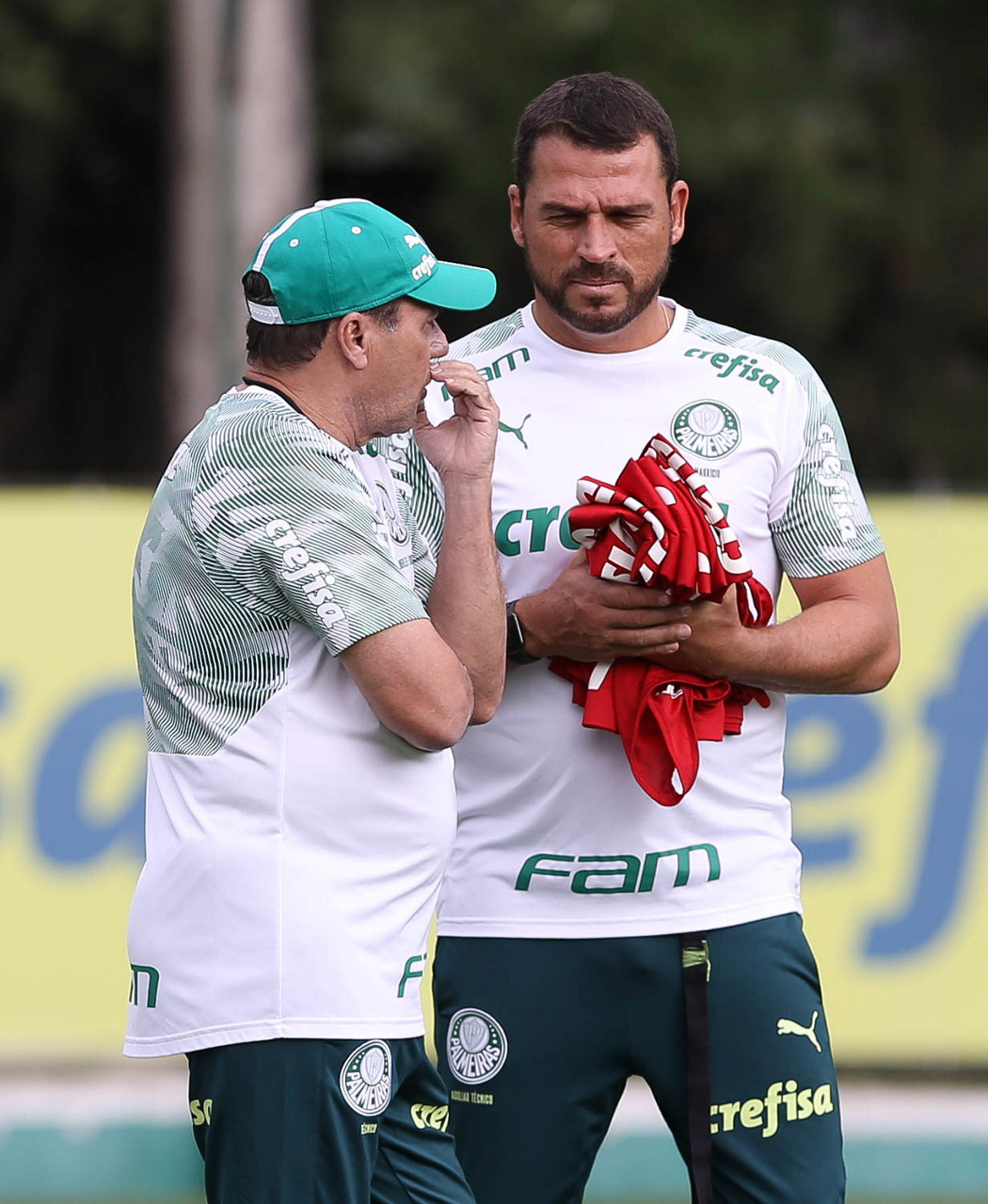 O técnico Vanderlei Luxemburgo e o auxiliar técnico Maurício Copertino (D), da SE Palmeiras, durante treinamento, na Academia de Futebol. (Foto: Cesar Greco)