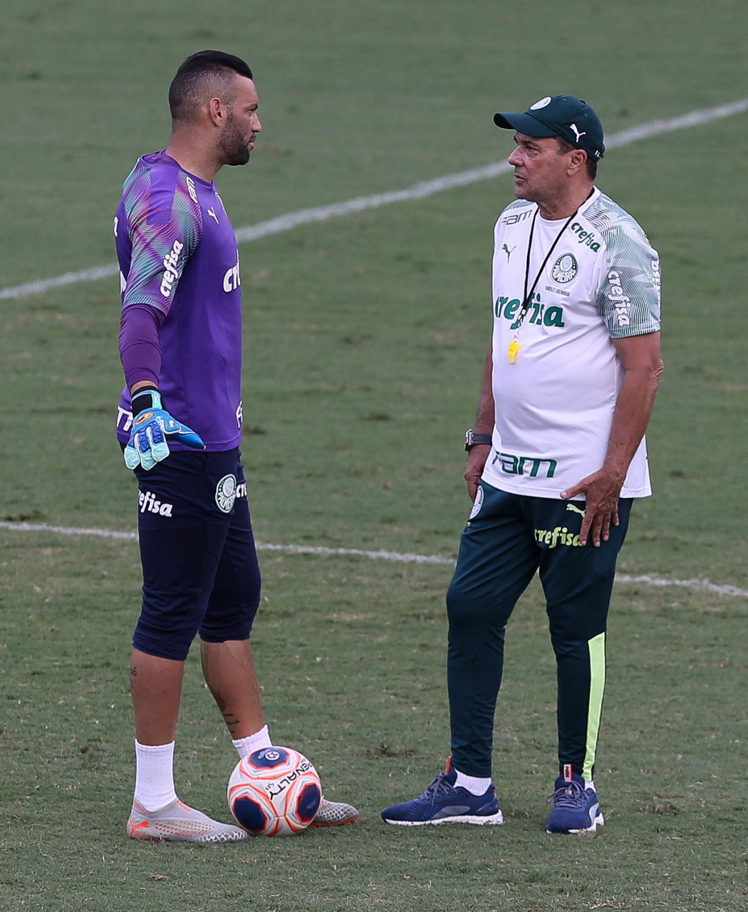 O técnico Vanderlei Luxemburgo e o goleiro Weverton (E), da SE Palmeiras, durante treinamento, na Academia de Futebol. (Foto: Cesar Greco)