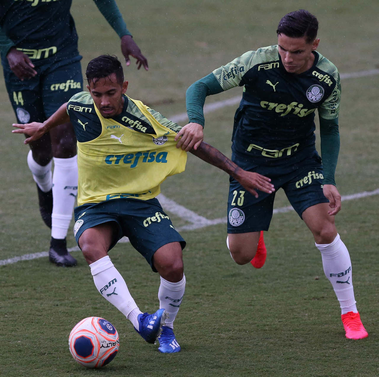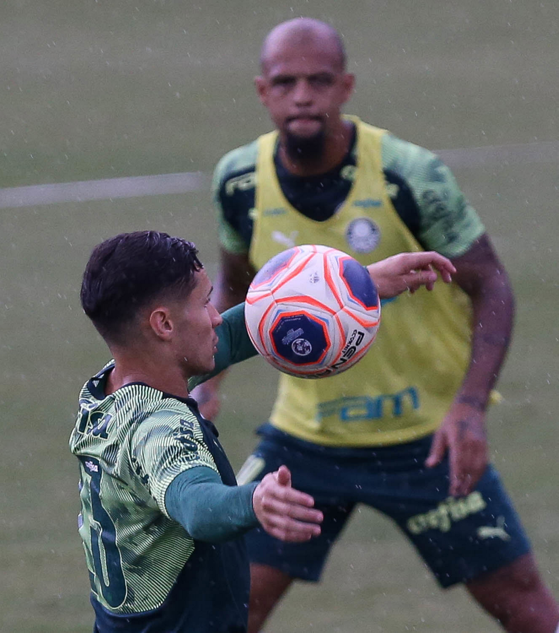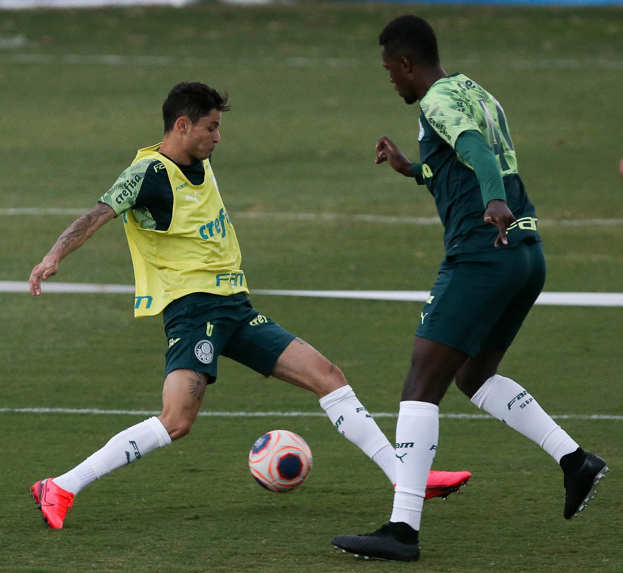 Os jogadores Alan e Raphael Veiga (D), da SE Palmeiras, durante treinamento, na Academia de Futebol. (Foto: Cesar Greco)
