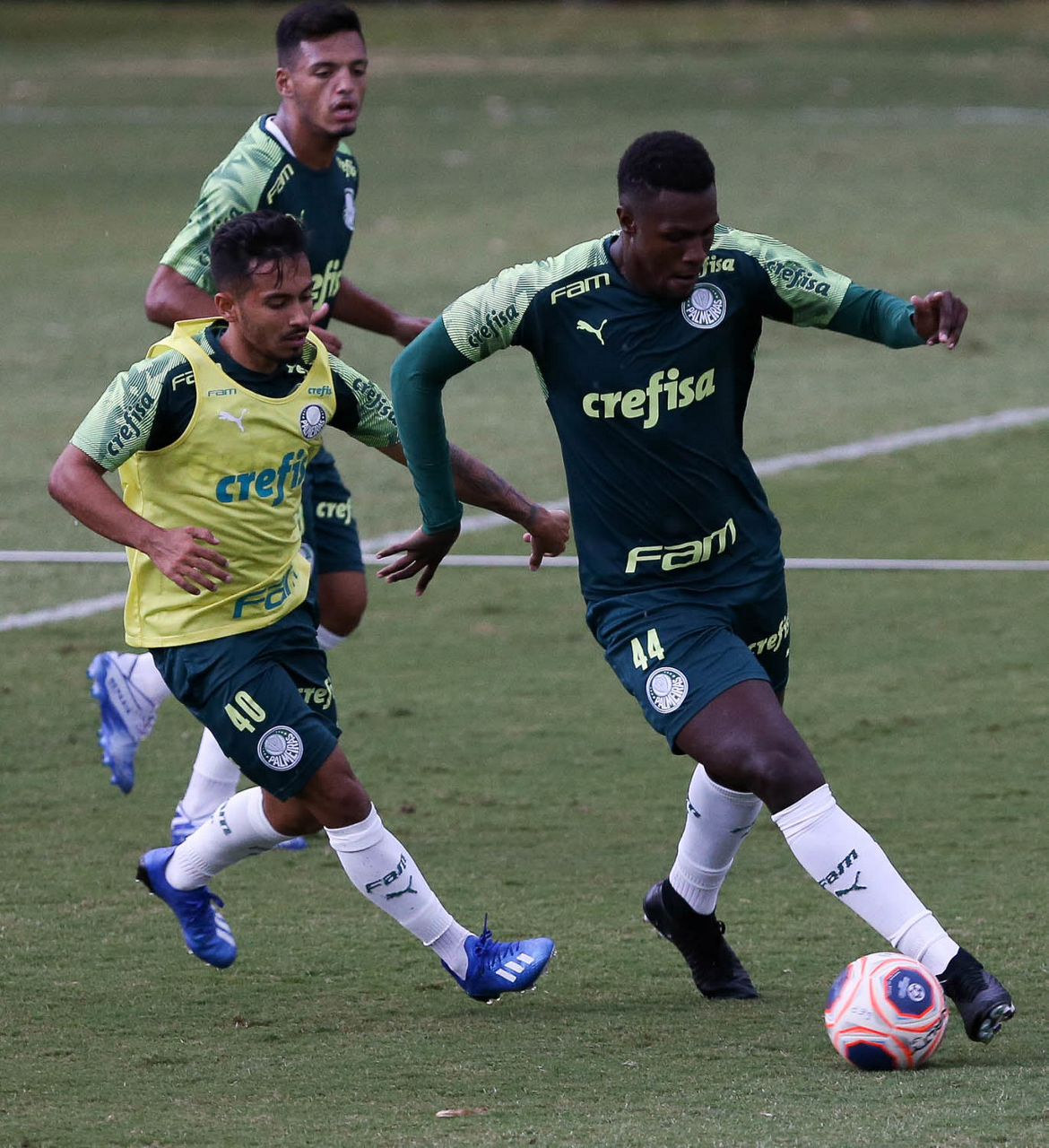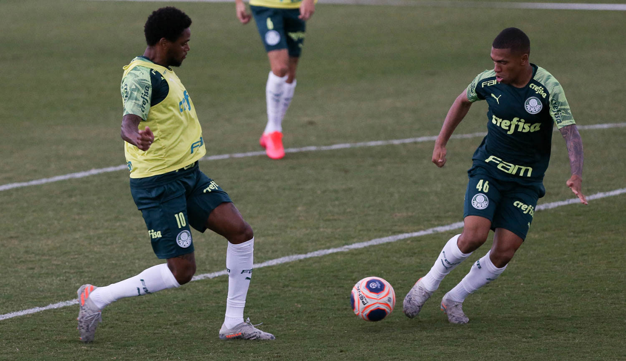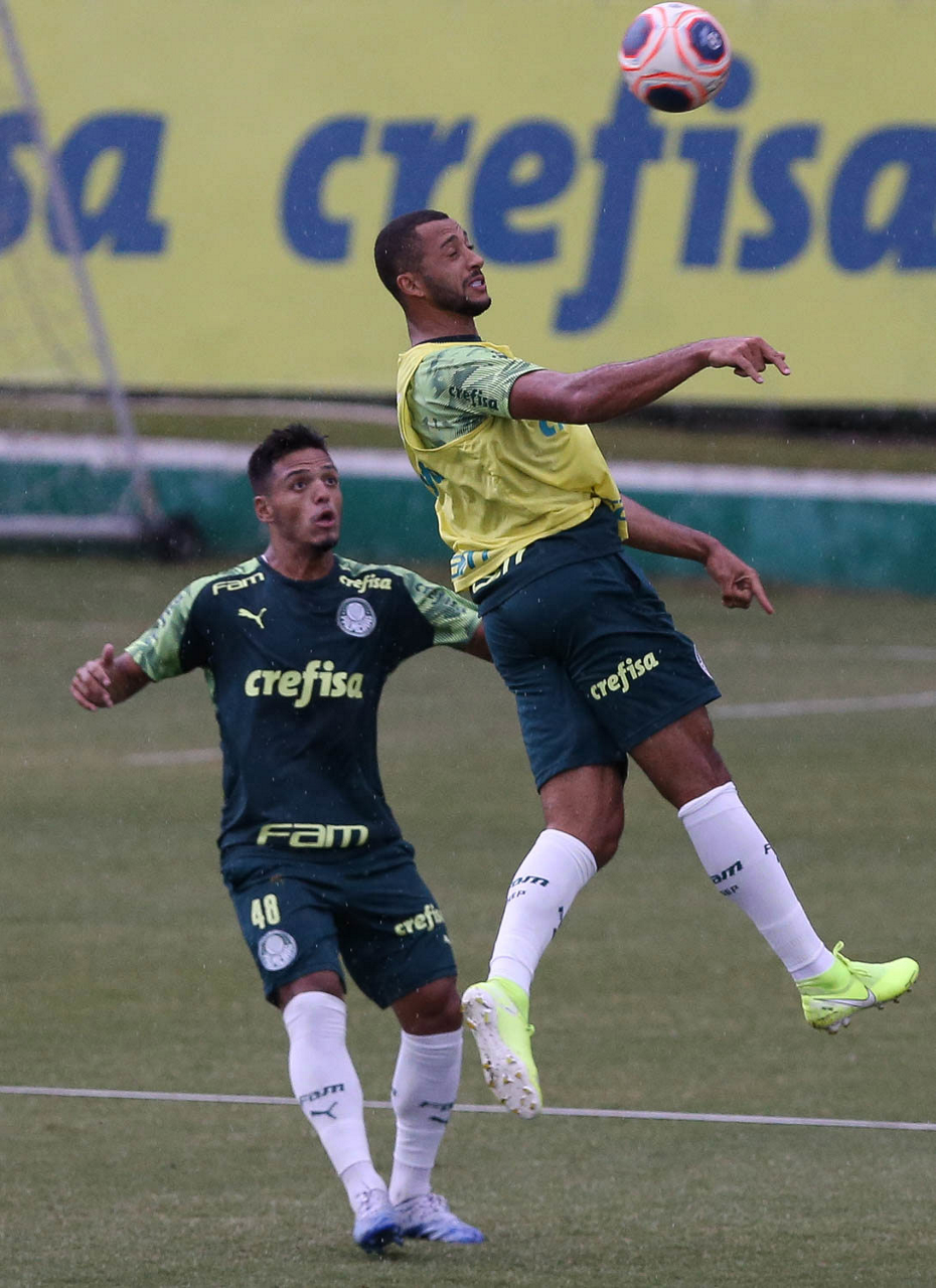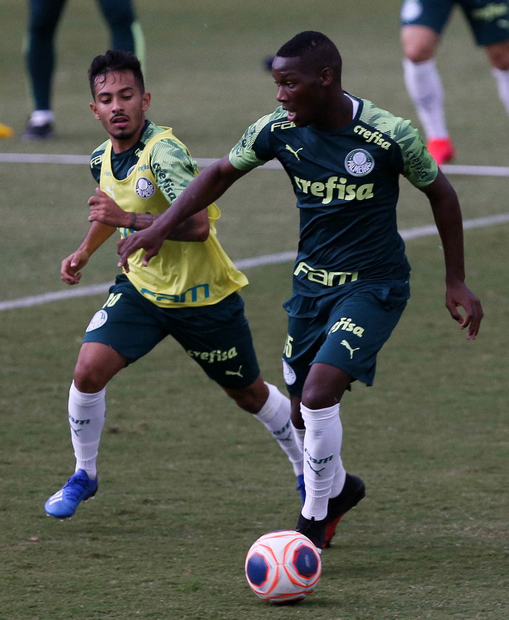Os jogadores Gabriel Menino e Vitor Hugo (D), da SE Palmeiras, durante treinamento, na Academia de Futebol. (Foto: Cesar Greco)