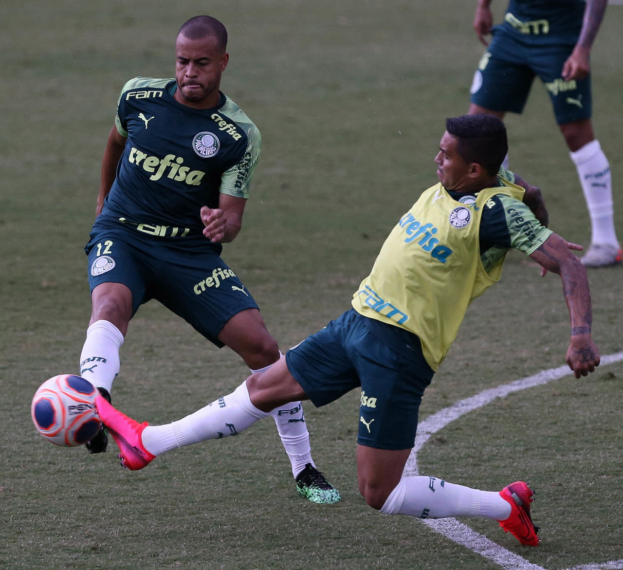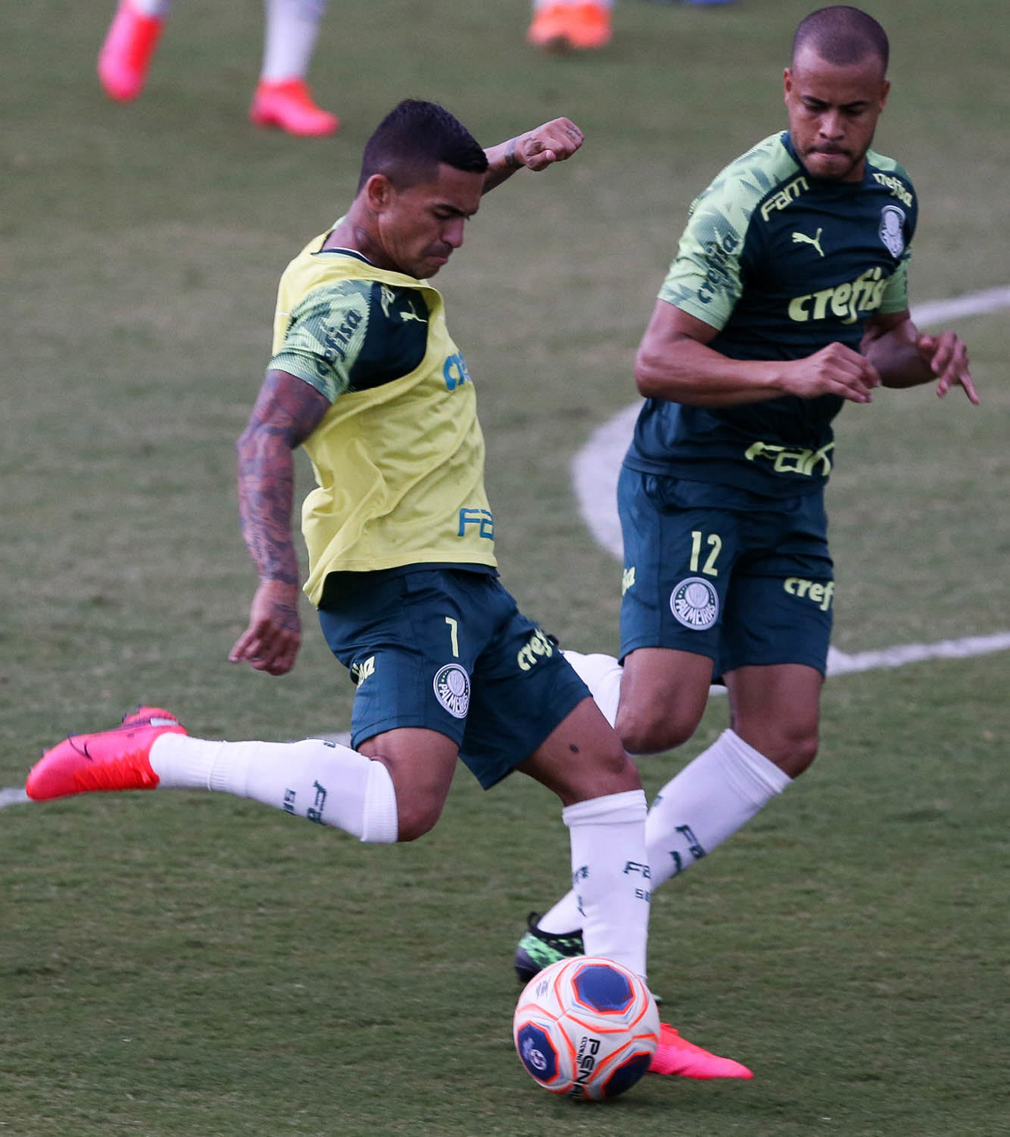 Os jogadores Dudu e Mayke (D), da SE Palmeiras, durante treinamento, na Academia de Futebol. (Foto: Cesar Greco)