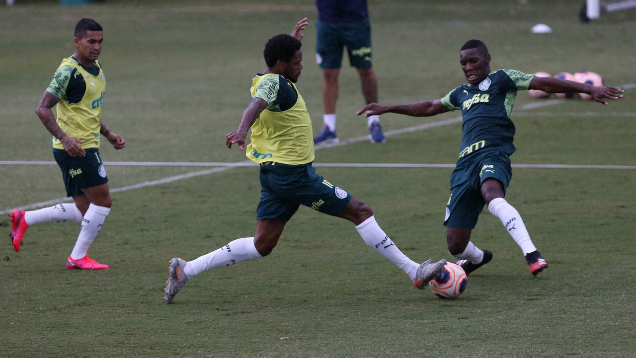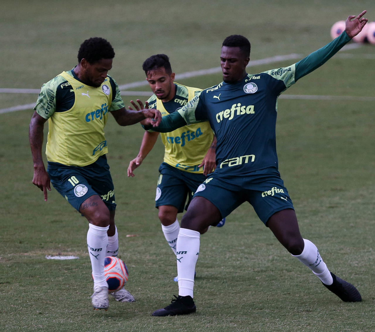 Os jogadores Luiz Adriano e Mayke e o goleiro Vinicius (E/D), da SE Palmeiras, durante treinamento, na Academia de Futebol. (Foto: Cesar Greco)