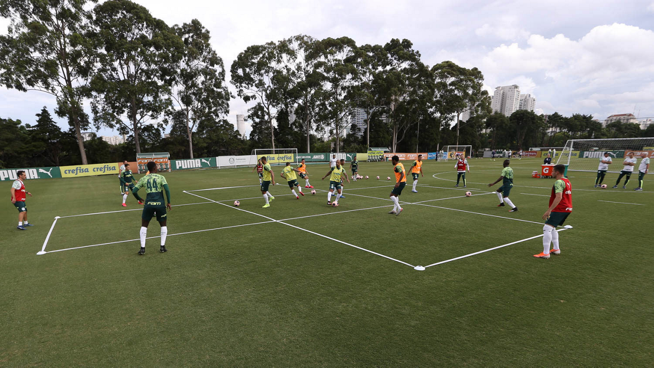 Os jogadores da SE Palmeiras, durante treinamento, na Academia de Futebol. (Foto: Cesar Greco)