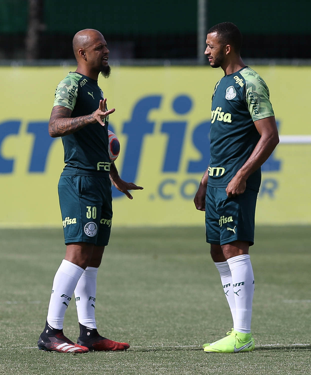 Os jogadores Felipe Melo e Vitor Hugo (D), da SE Palmeiras, durante treinamento, na Academia de Futebol. (Foto: Cesar Greco)