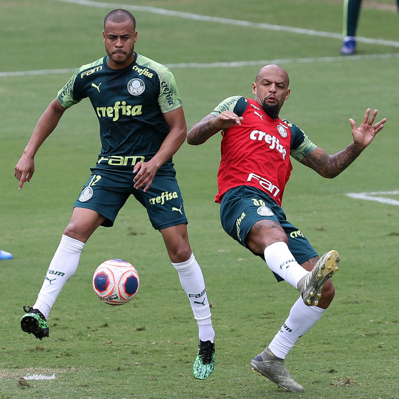 Os jogadores Mayke e Felipe Melo (D), da SE Palmeiras, durante treinamento, na Academia de Futebol. (Foto: Cesar Greco)