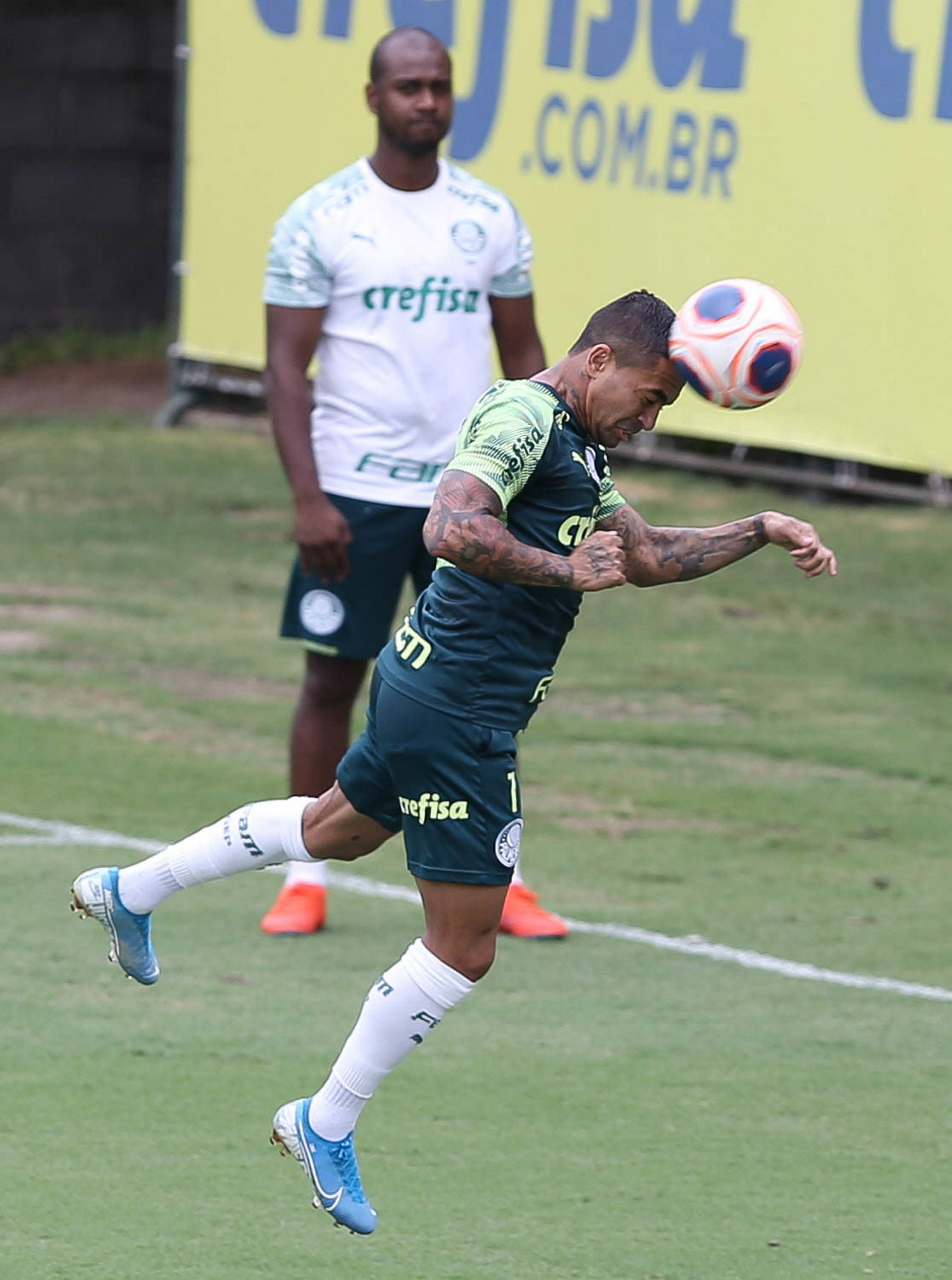 Os jogadores Dudu e Mayke (D), da SE Palmeiras, durante treinamento, na Academia de Futebol. (Foto: Cesar Greco)