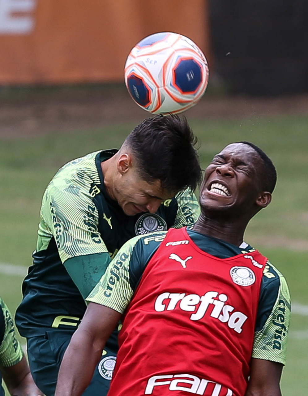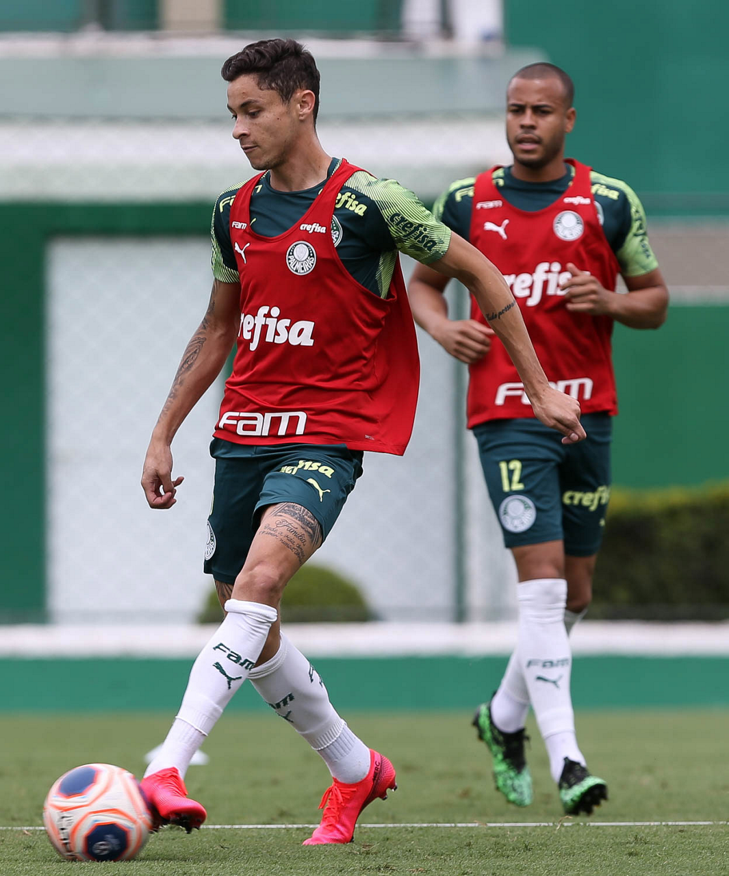 Os jogadores Raphael Veiga e Patrick de Paula (D), da SE Palmeiras, durante treinamento, na Academia de Futebol. (Foto: Cesar Greco)