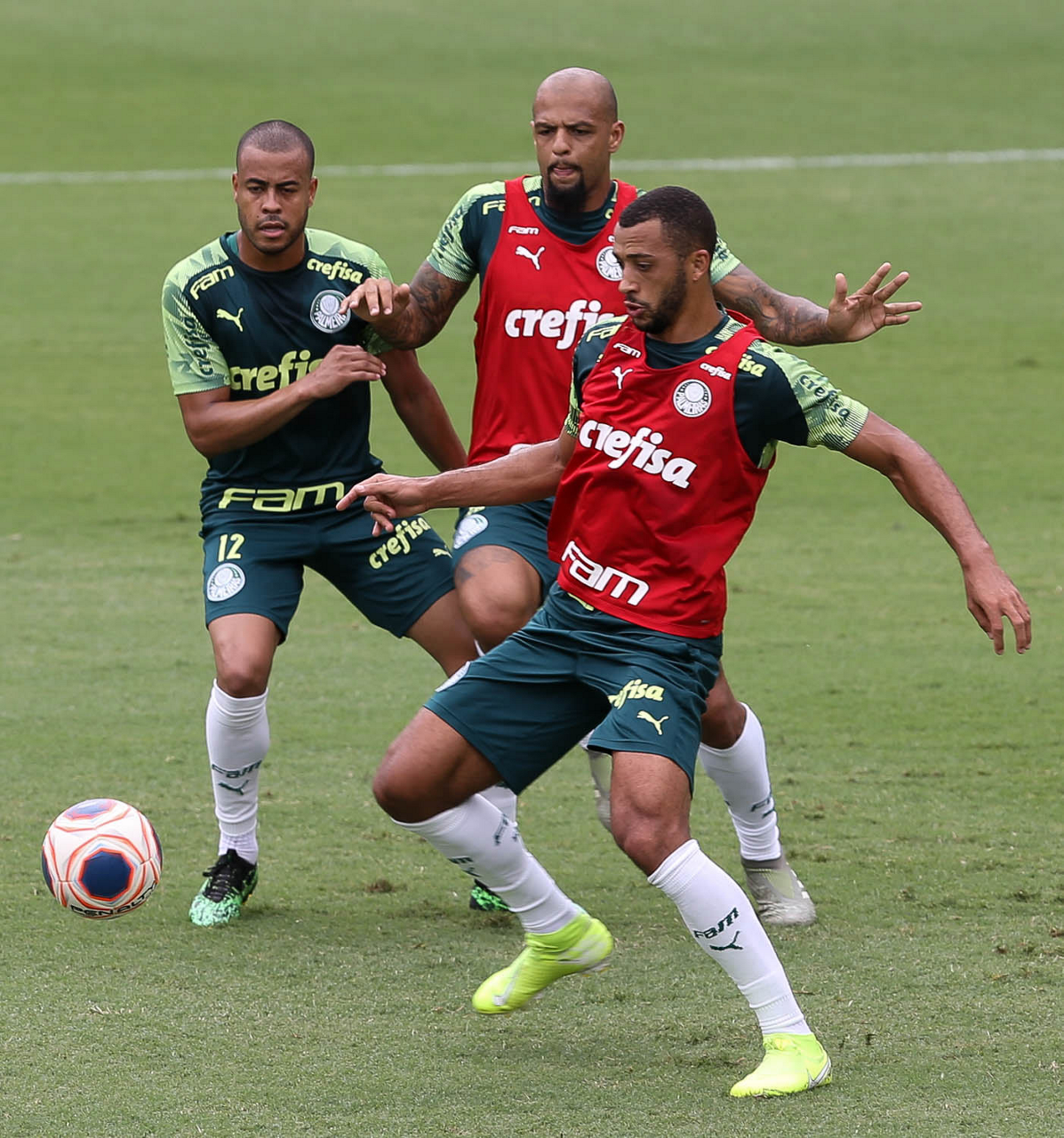Os jogadores Diogo Barbosa, Dudu e Luan (E/D), da SE Palmeiras, durante treinamento, na Academia de Futebol. (Foto: Cesar Greco)