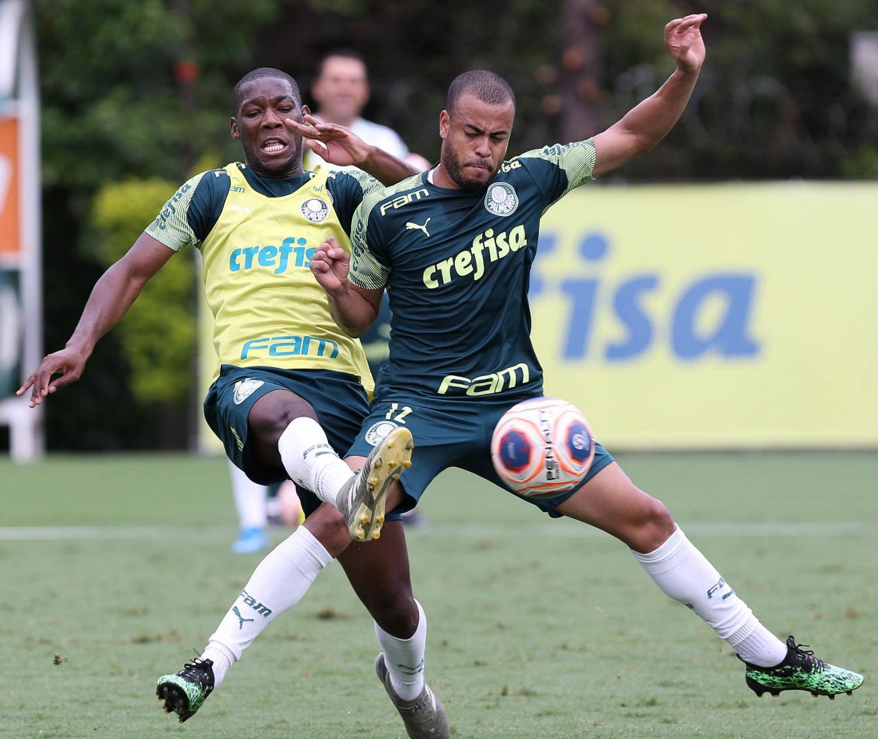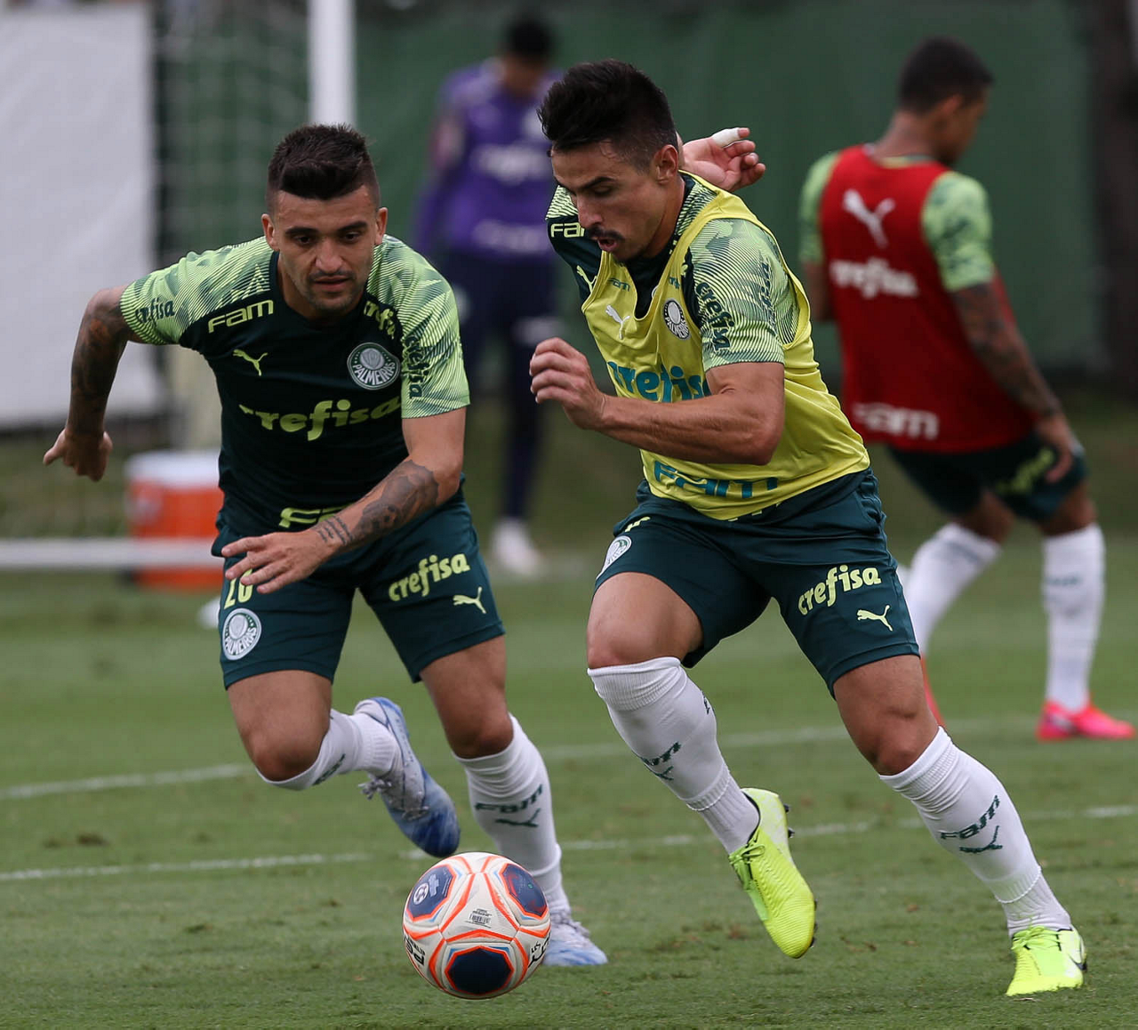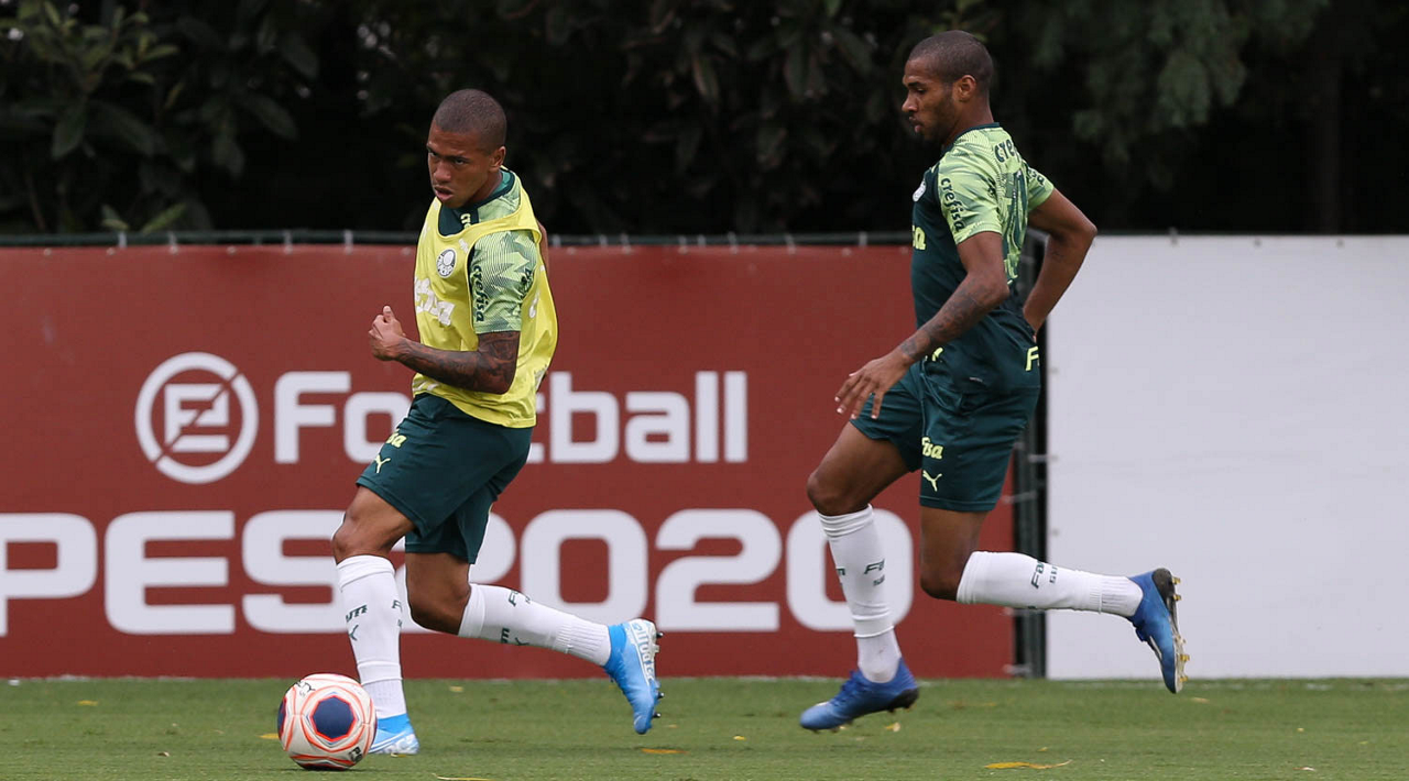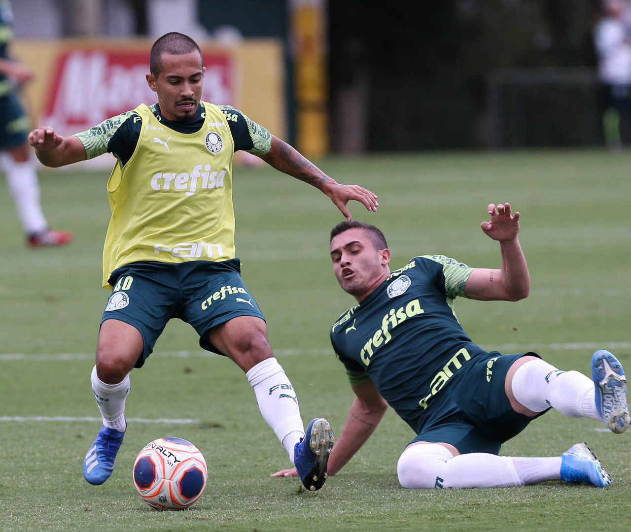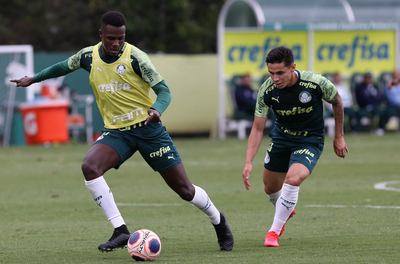 Os jogadores Pedrão e Raphael Veiga (D), da SE Palmeiras, durante treinamento, na Academia de Futebol. (Foto: Cesar Greco)