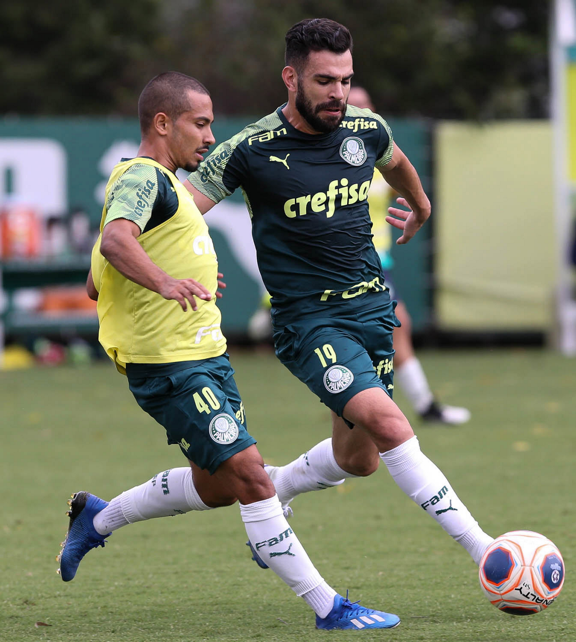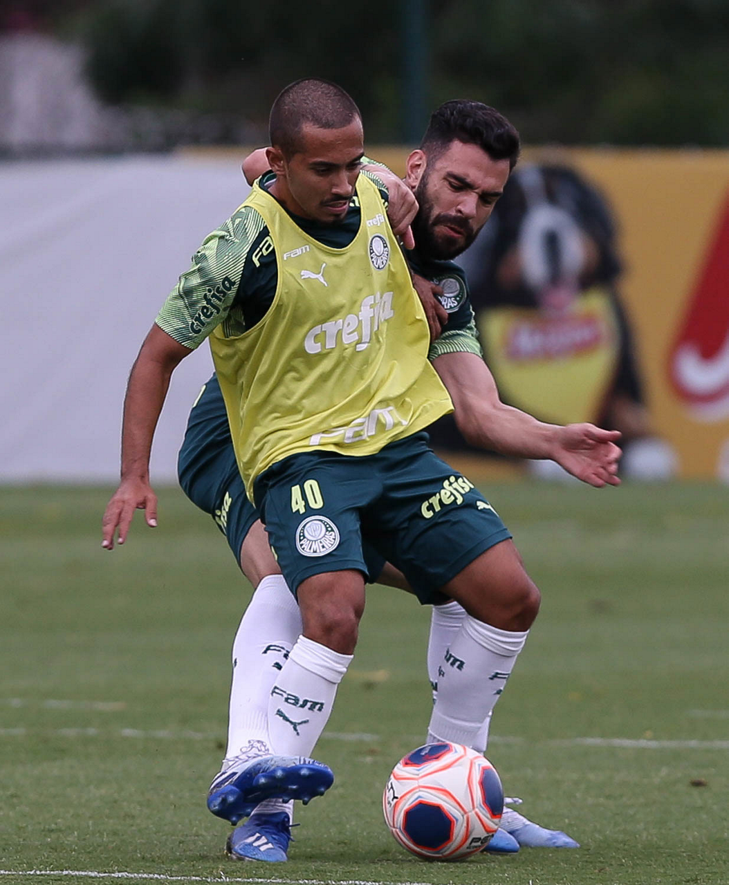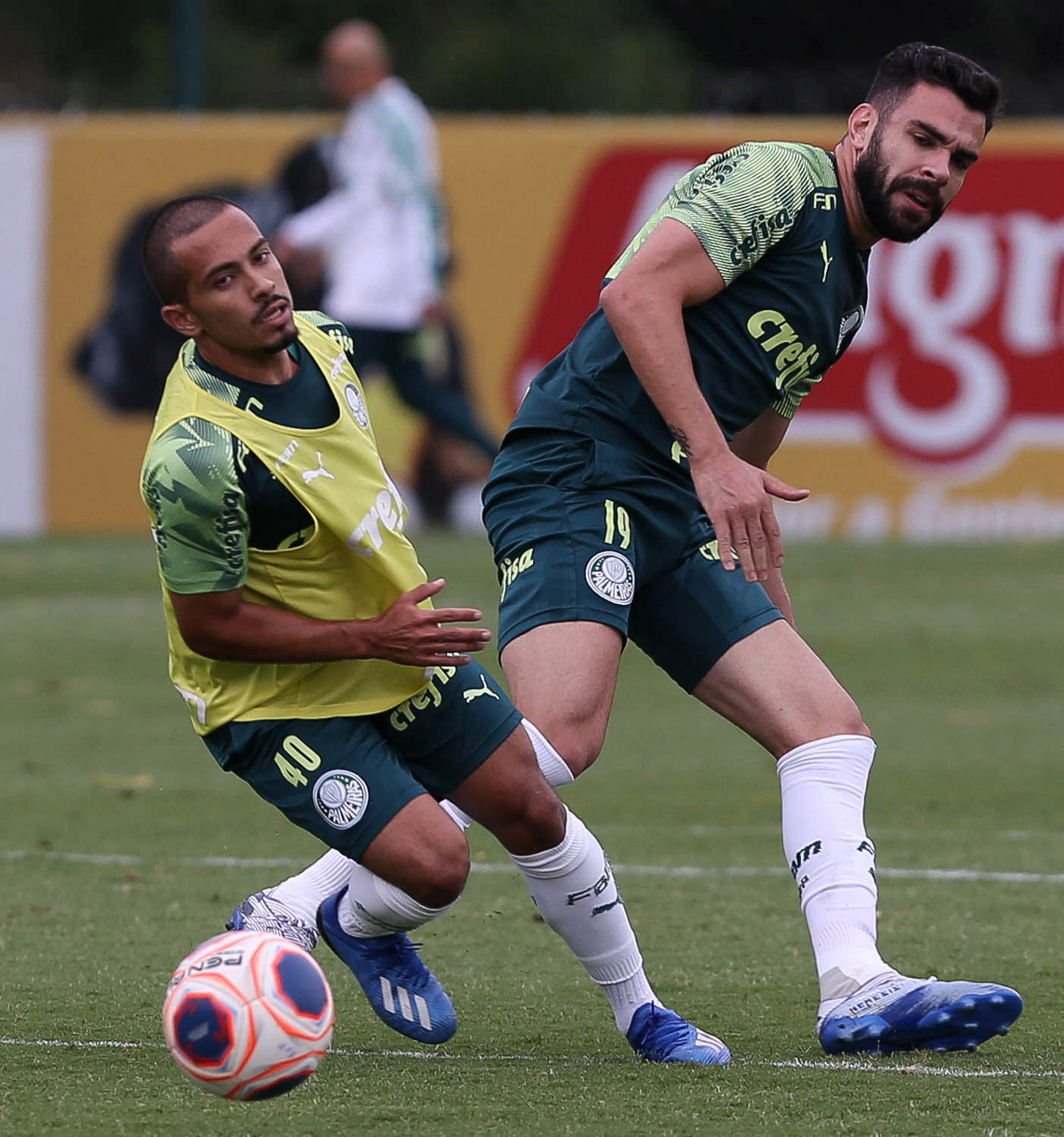 Os jogadores Patrick de Paula e Mayke (D), da SE Palmeiras, durante treinamento, na Academia de Futebol. (Foto: Cesar Greco)