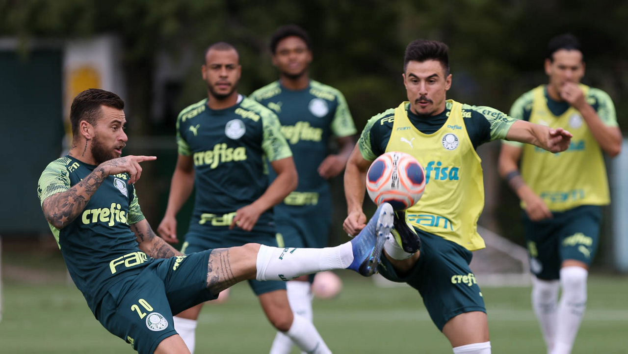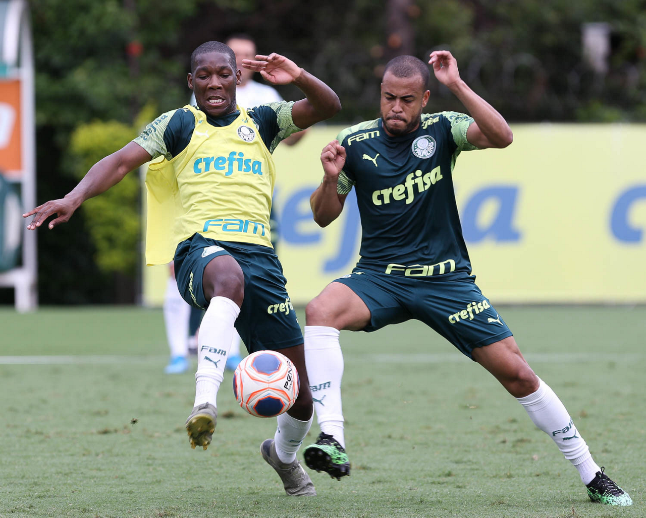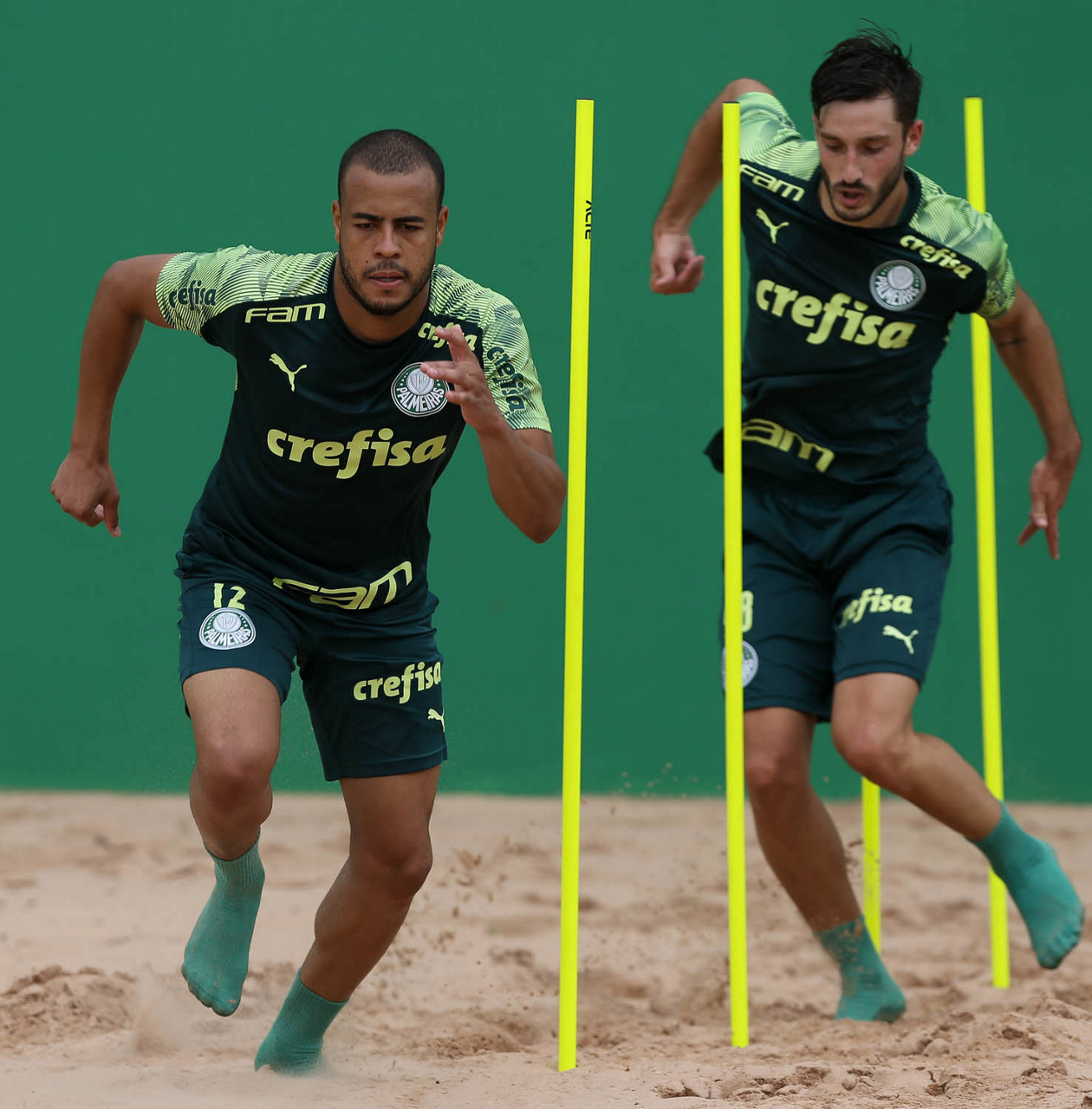 Os jogadores Patrick de Paula e Mayke (D), da SE Palmeiras, durante treinamento, na Academia de Futebol. (Foto: Cesar Greco)