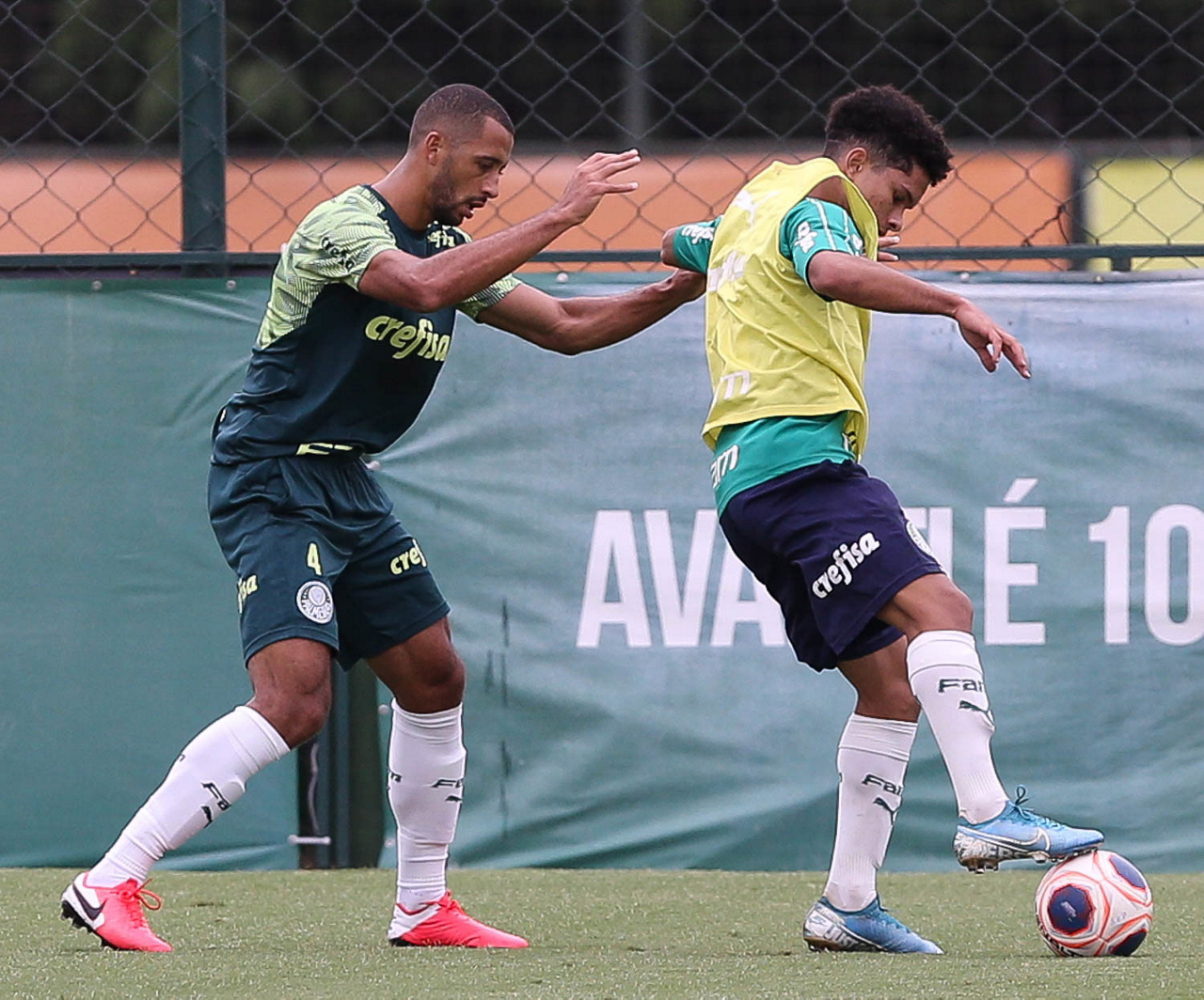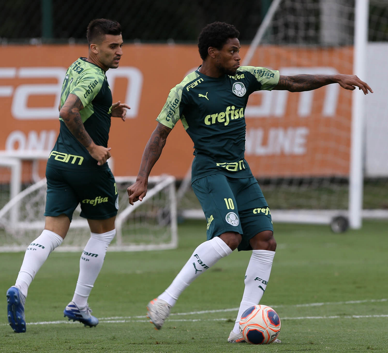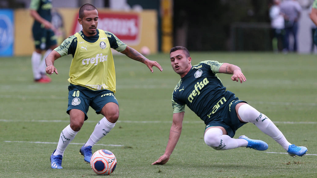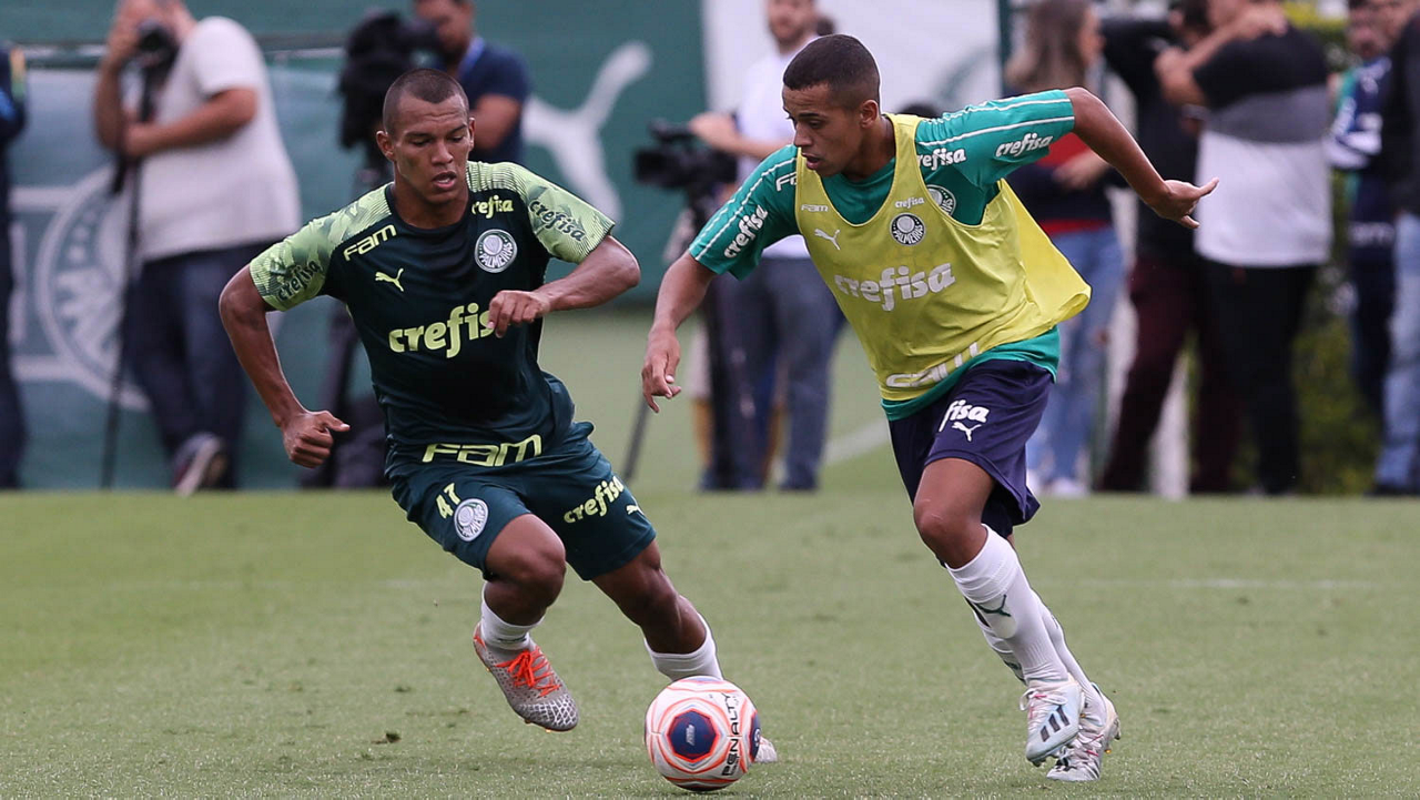Os jogadores Gabriel e Luan (D), da SE Palmeiras, durante treinamento, na Academia de Futebol. (Foto: Cesar Greco)