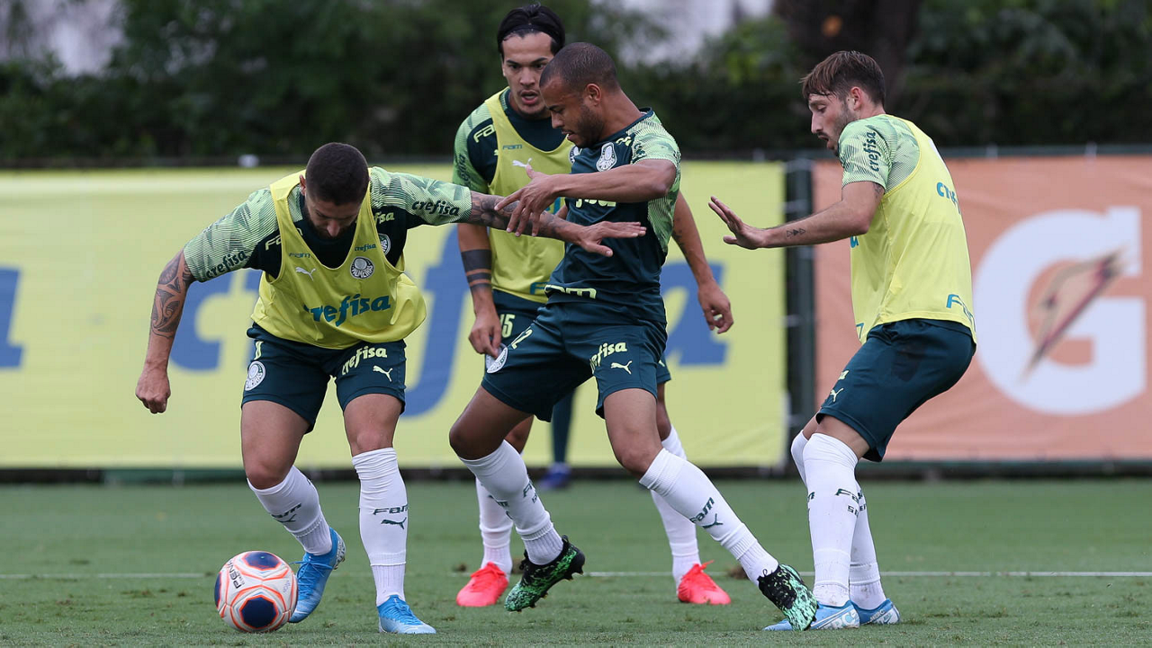 Os jogadores Zé Rafael, Gustavo Gómez, Mayke e Matías Viña (E/D), da SE Palmeiras, durante treinamento, na Academia de Futebol. (Foto: Cesar Greco)