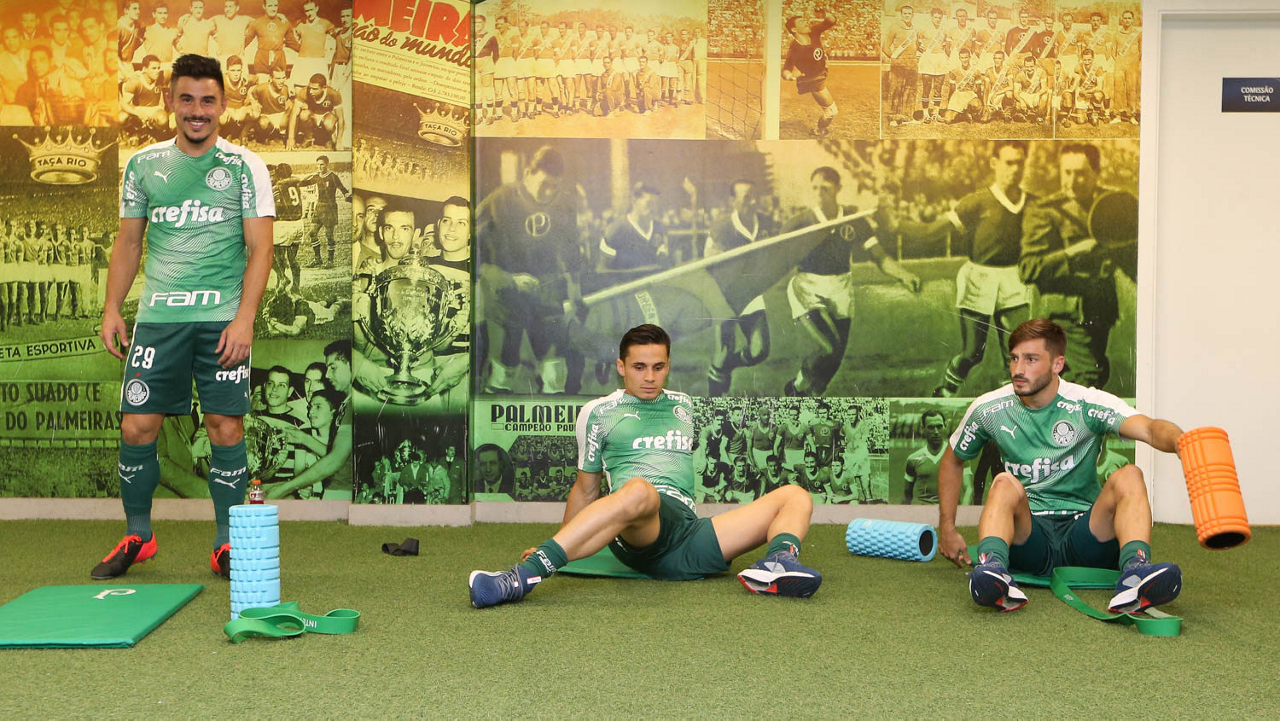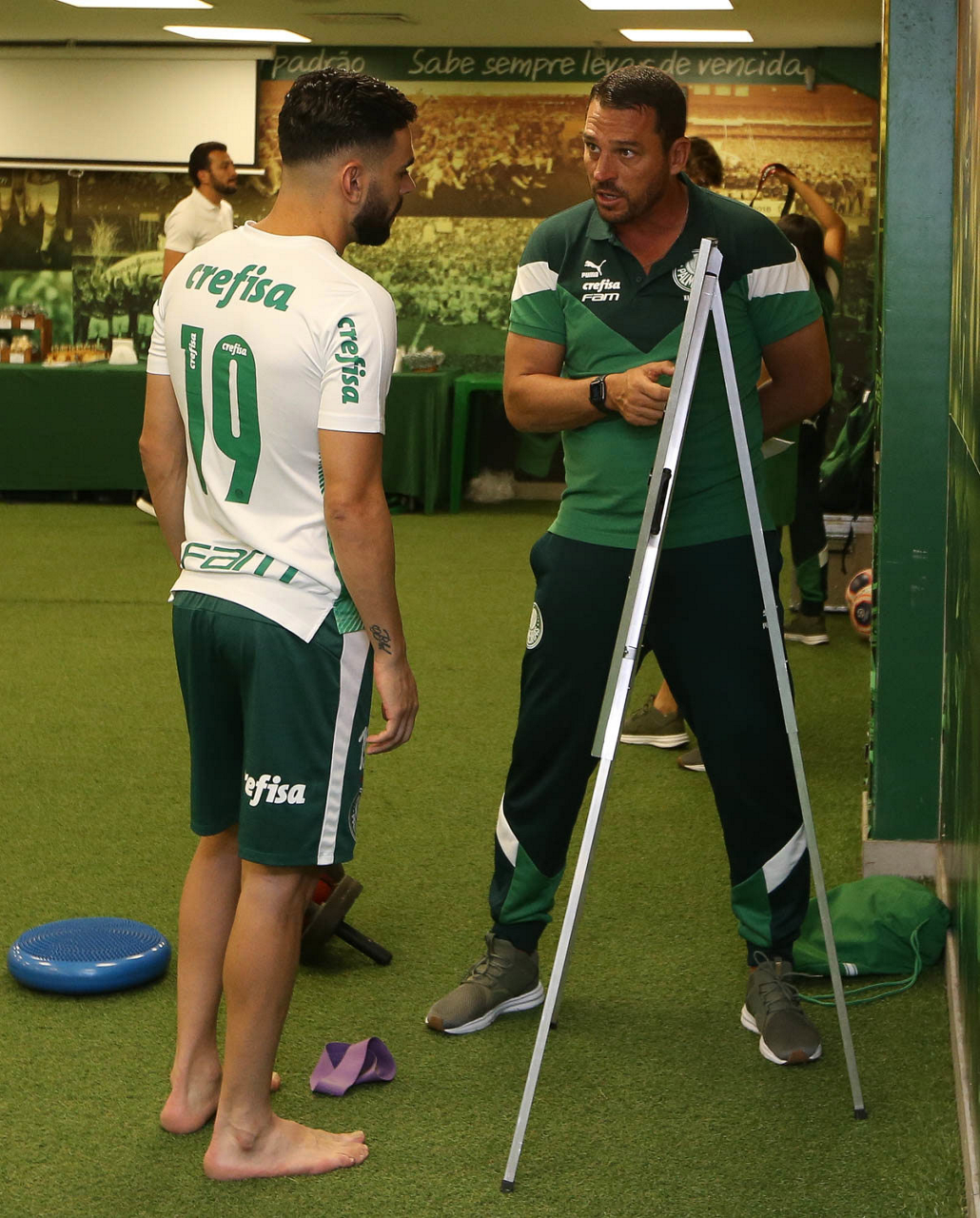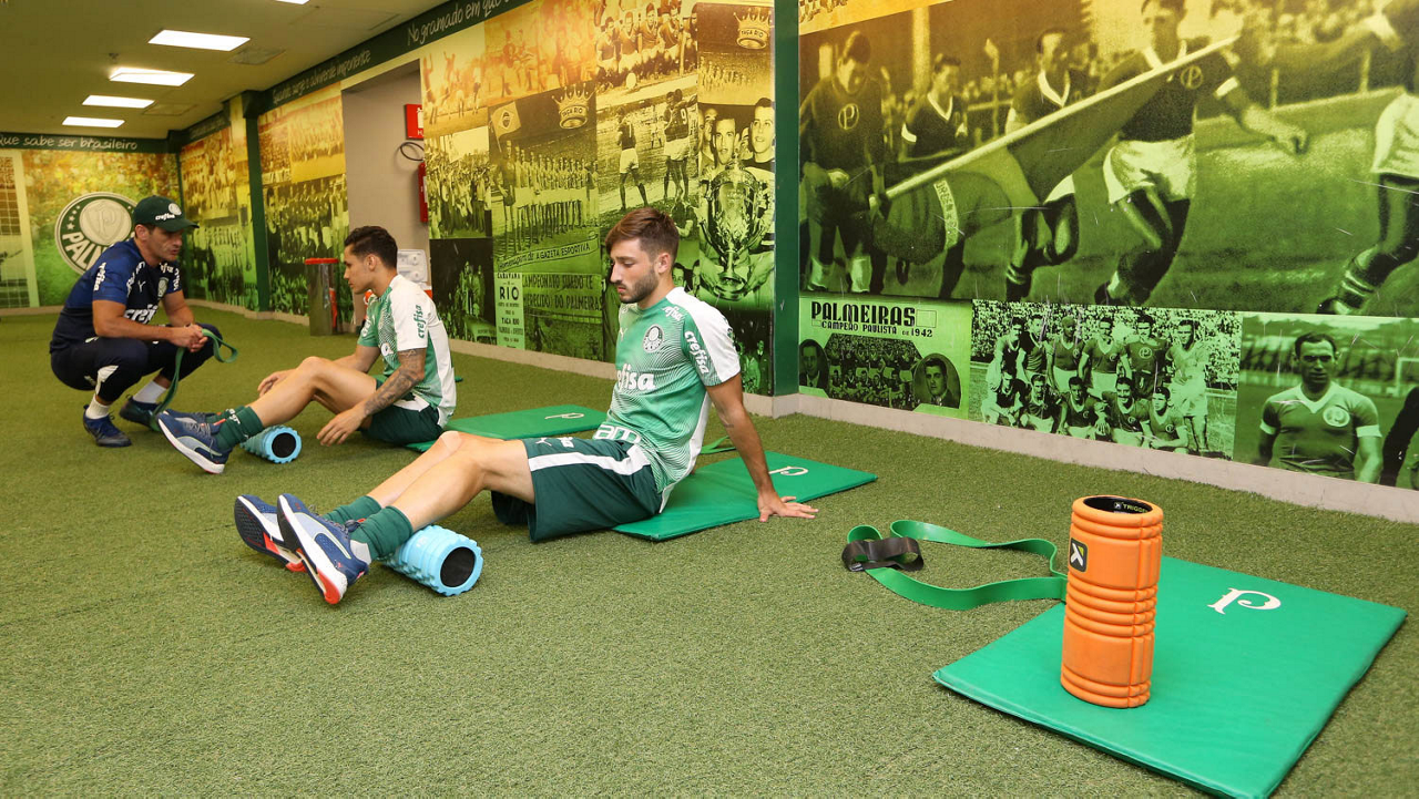 Os jogadores da SE Palmeiras, preparam-se para o jogo contra a equipe do Guarani FC, durante partida válida pela sétima rodada, do Campeonato Paulista, Série A1, na arena Allianz Parque.