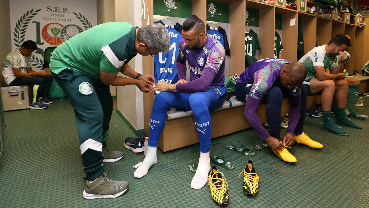 O goleiro Weverton, da SE Palmeiras, prepara-se para o jogo contra a equipe do Guarani FC, durante partida válida pela sétima rodada, do Campeonato Paulista, Série A1, na arena Allianz Parque.