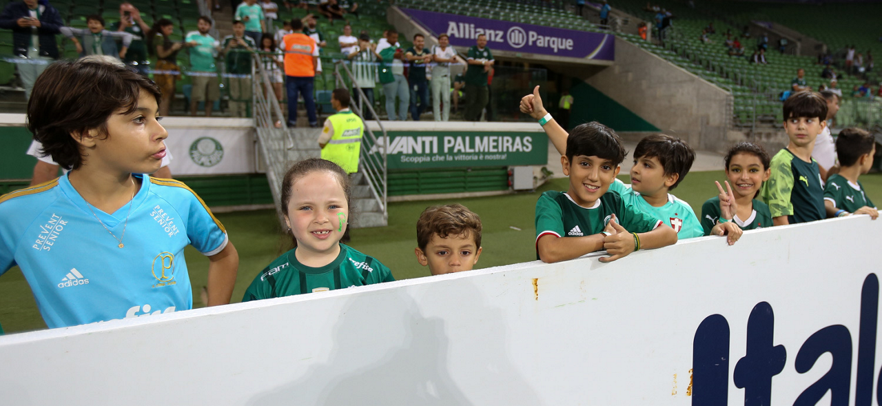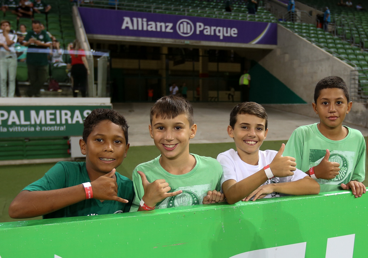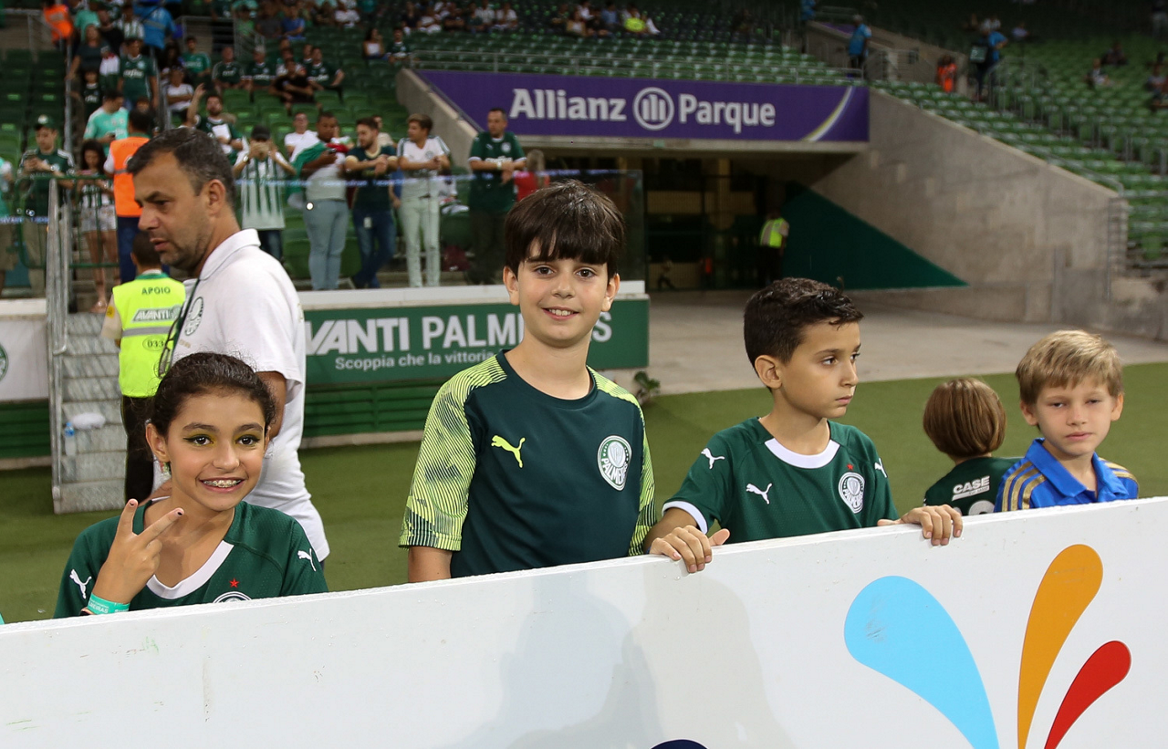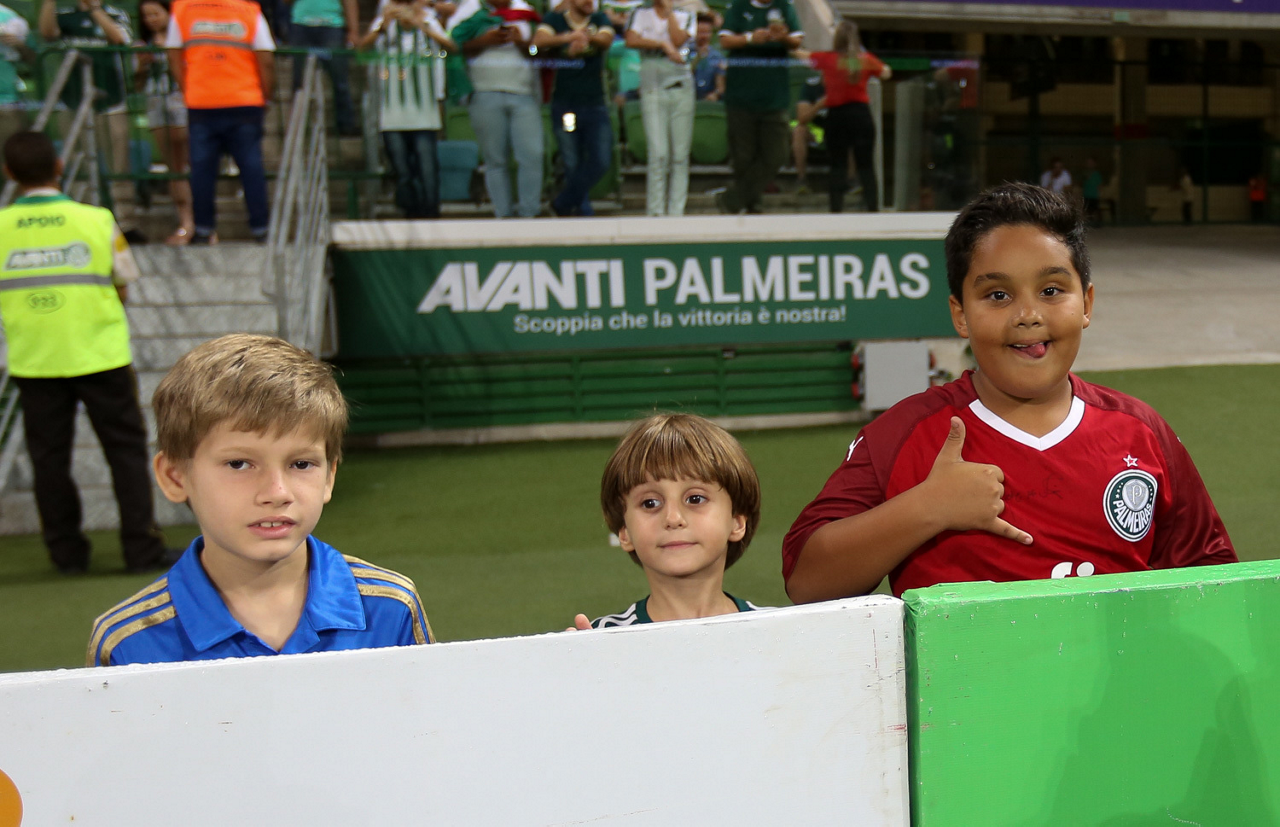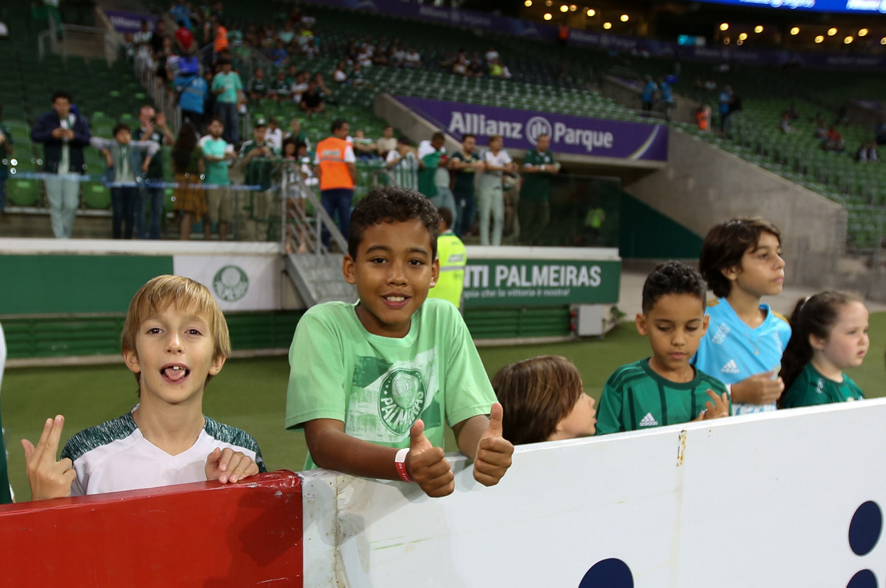 Crianças em campo antes do início do jogo entre Palmeiras e Guaranil, no Allianz Parque, em São Paulo. (Foto: Fabio Menotti)