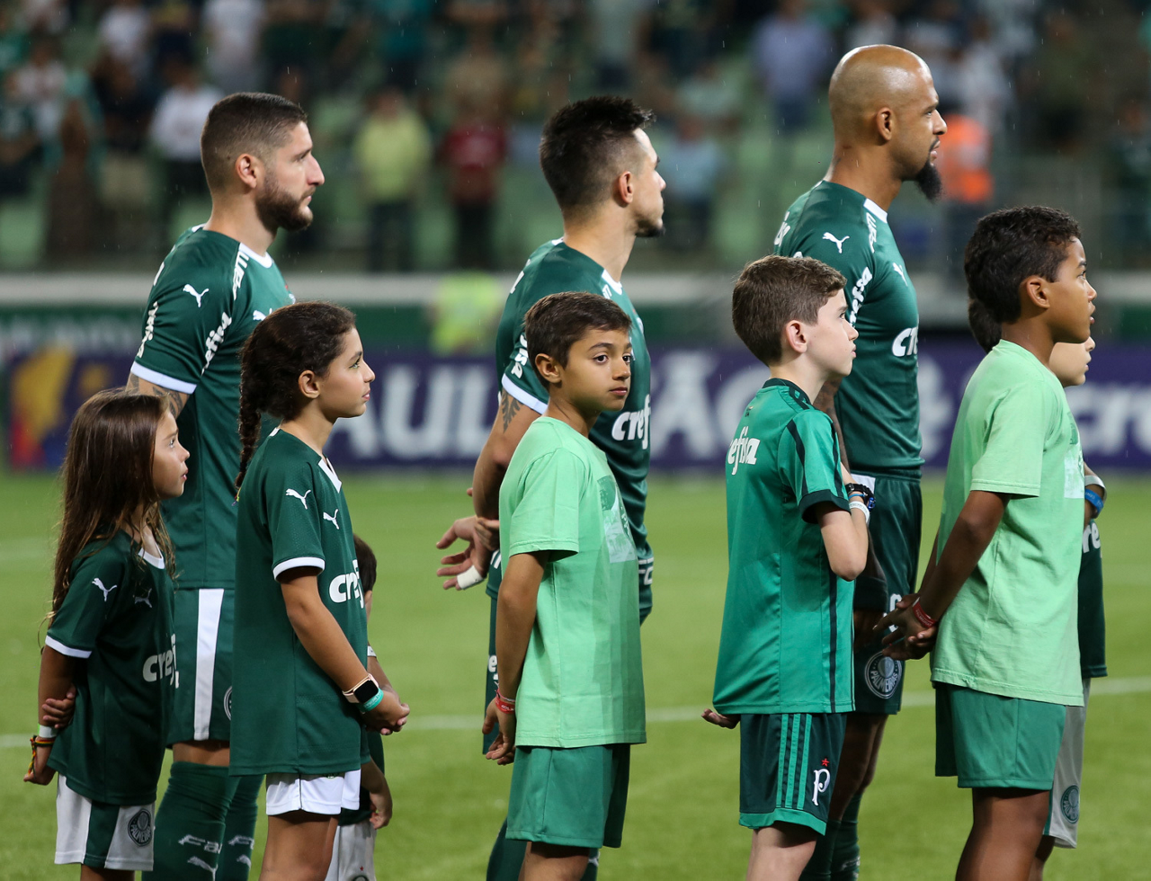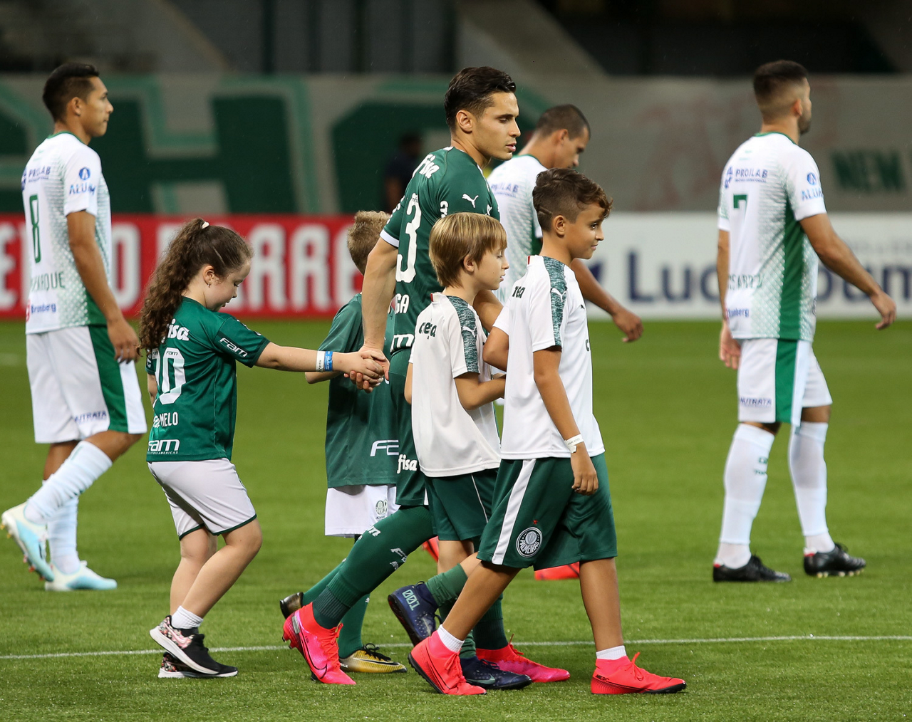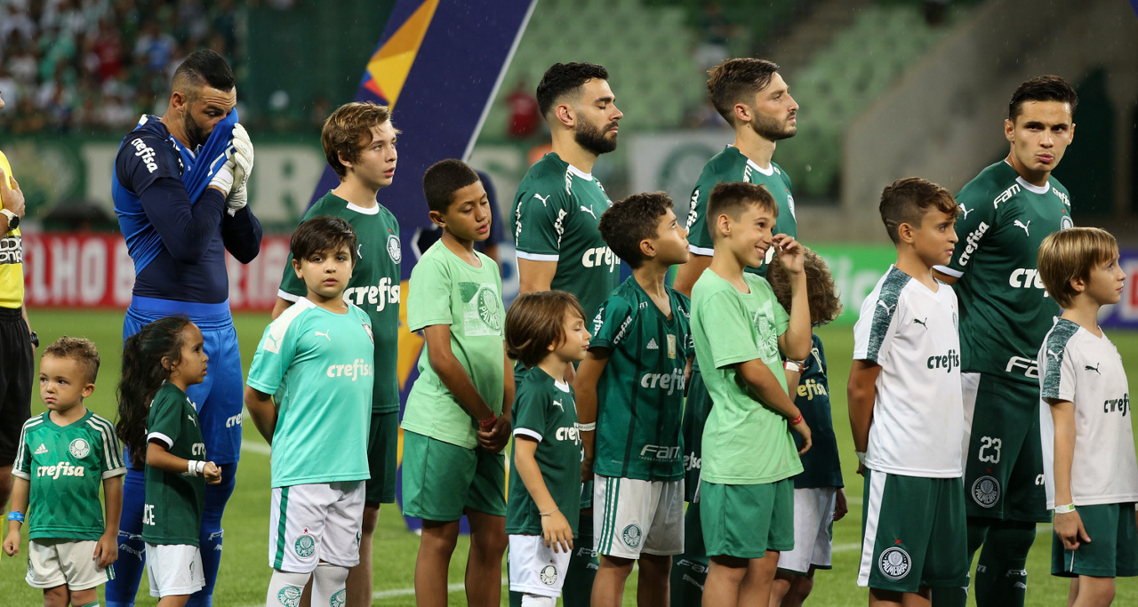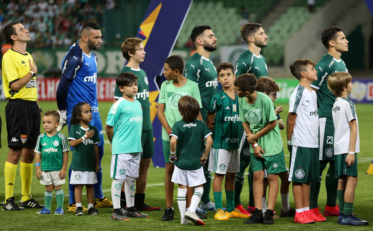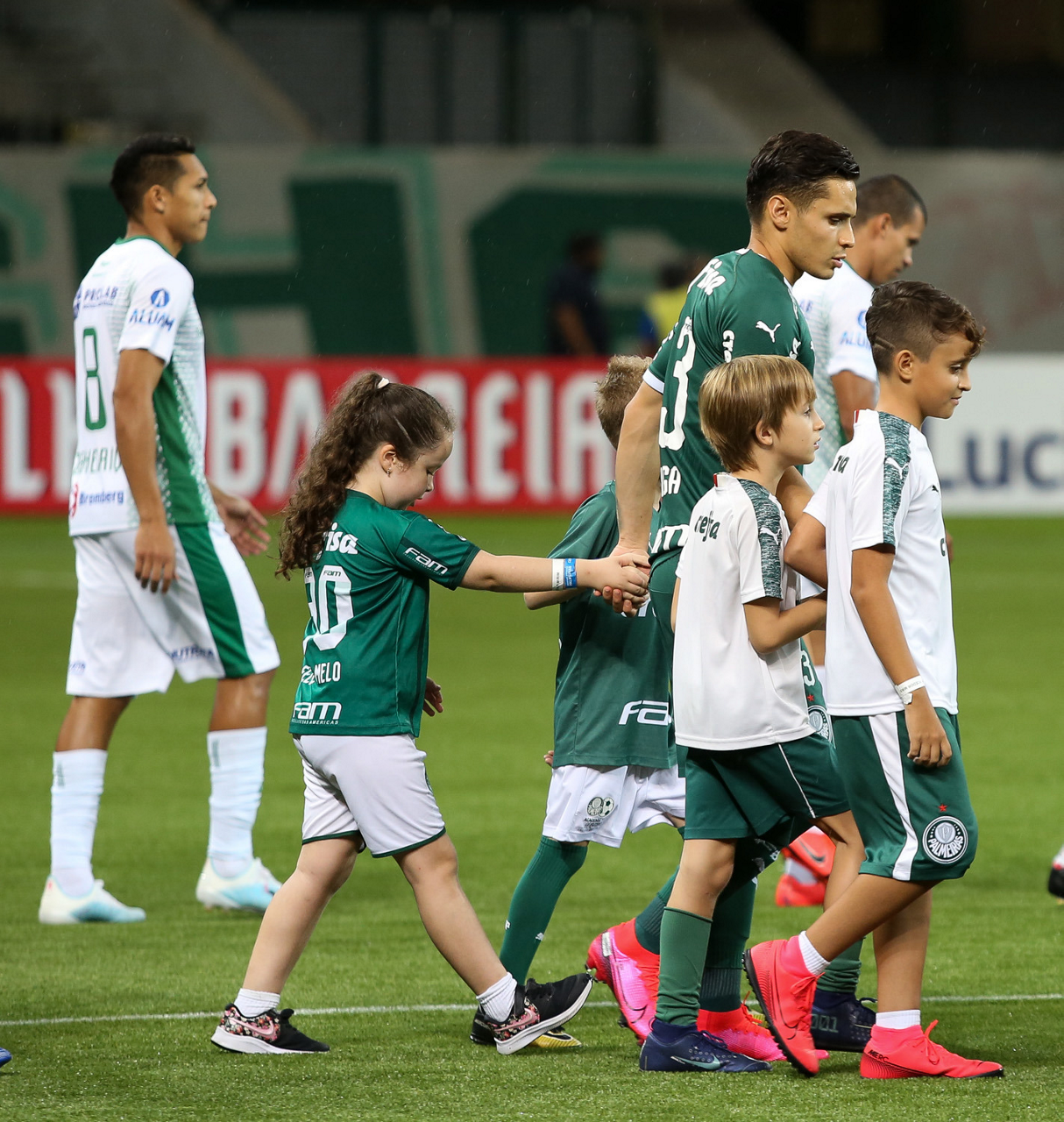 Crianças em campo antes do início do jogo entre Palmeiras e Guaranil, no Allianz Parque, em São Paulo. (Foto: Fabio Menotti)
