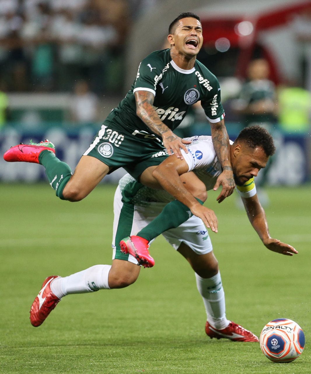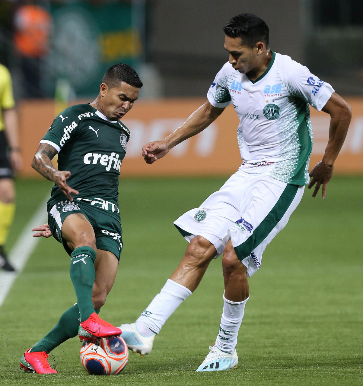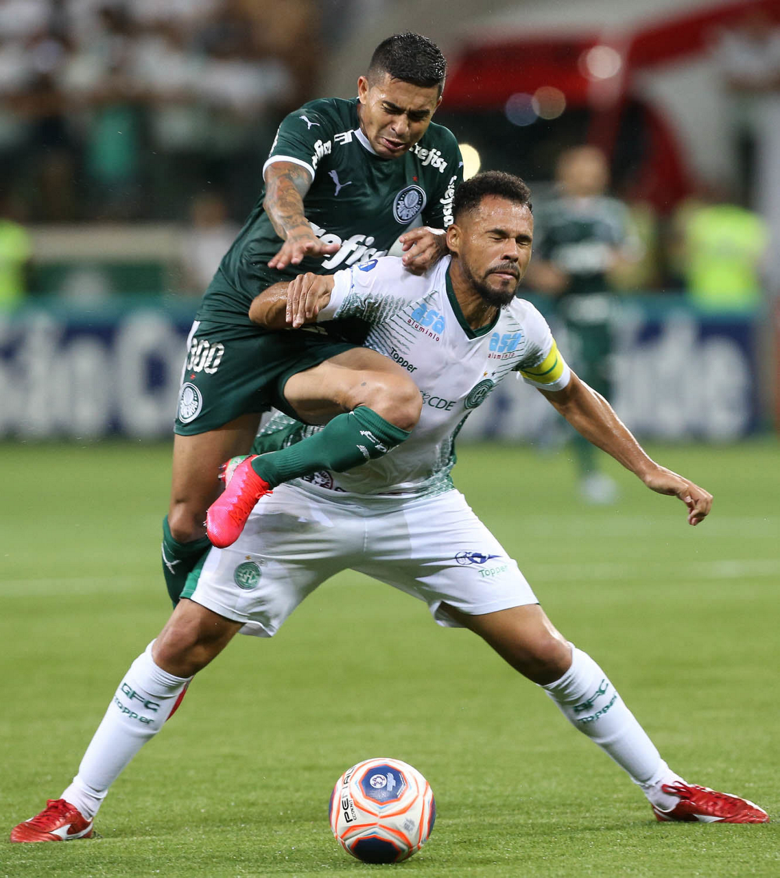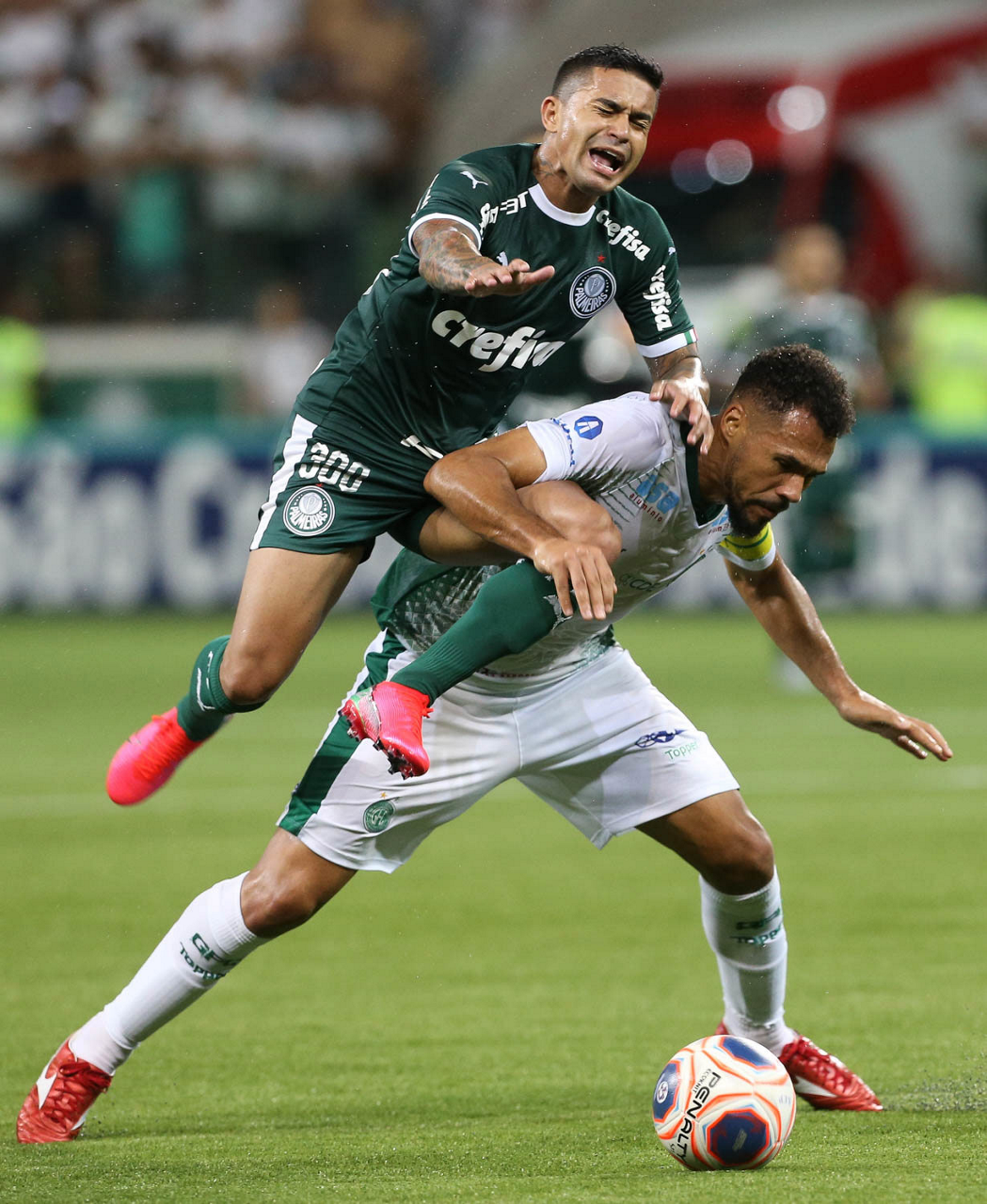 O jogador Dudu, da SE Palmeiras, disputa bola com o jogador Deivid, do Guarani FC, durante partida válida pela sétima rodada, do Campeonato Paulista, Série A1, na arena Allianz Parque. (Foto: Cesar Greco)