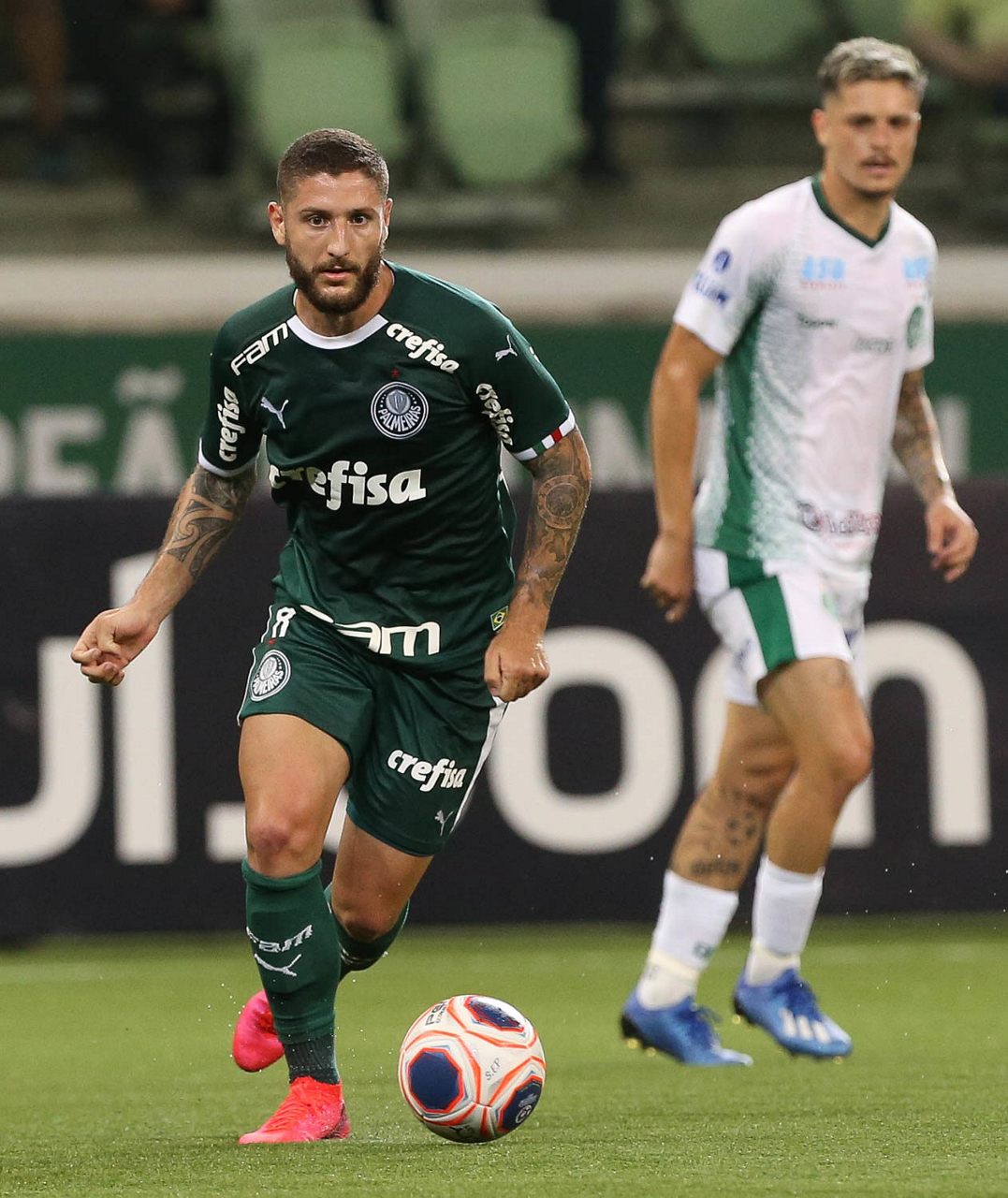 O jogador Matías Viña, da SE Palmeiras, disputa bola com o jogador Pablo, do Guarani FC, durante partida válida pela sétima rodada, do Campeonato Paulista, Série A1, na arena Allianz Parque. (Foto: Cesar Greco)