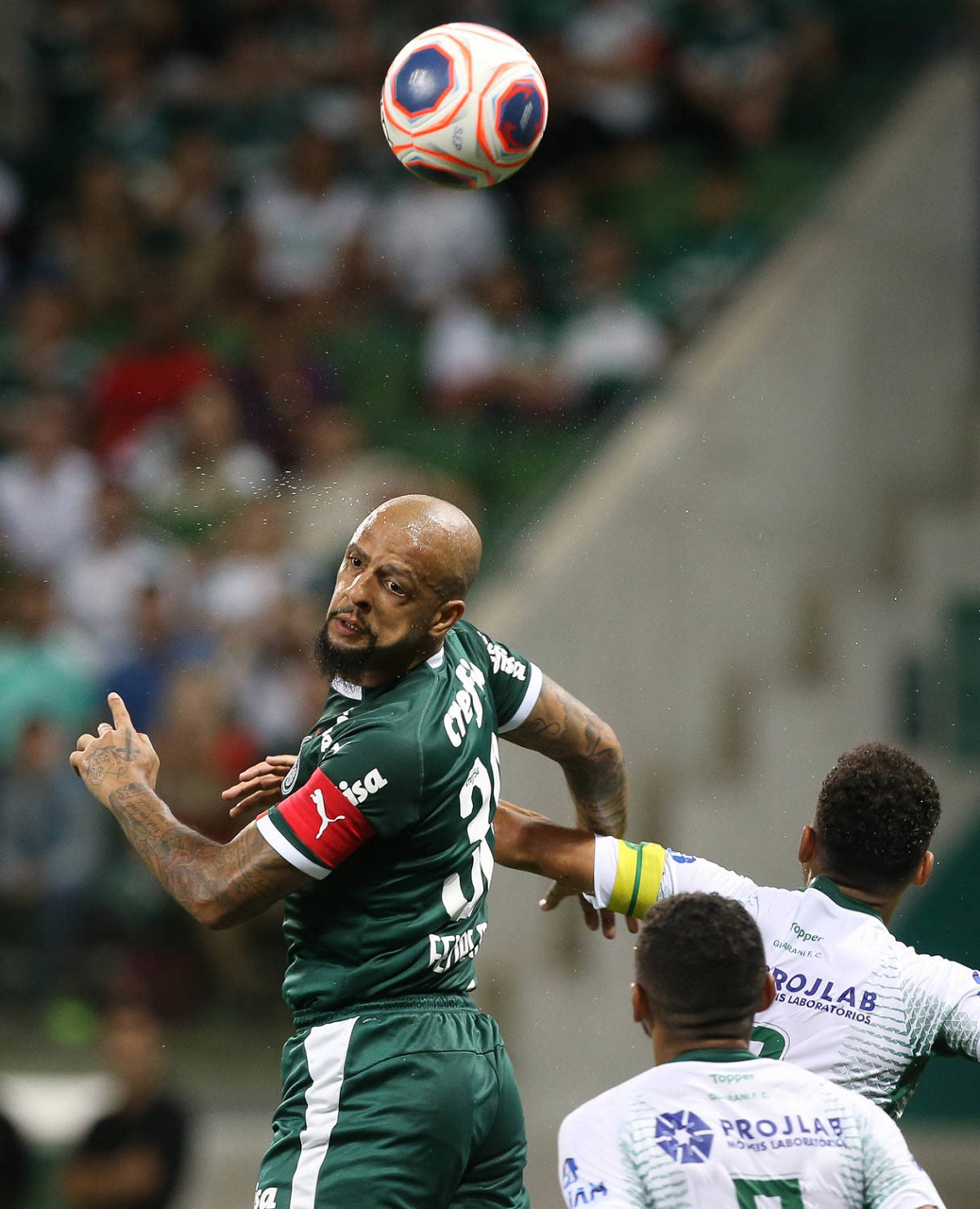 O jogador Felipe Melo, da SE Palmeiras, disputa bola com o jogador, do Guarani FC, durante partida válida pela sétima rodada, do Campeonato Paulista, Série A1, na arena Allianz Parque. (Foto: Cesar Greco)
