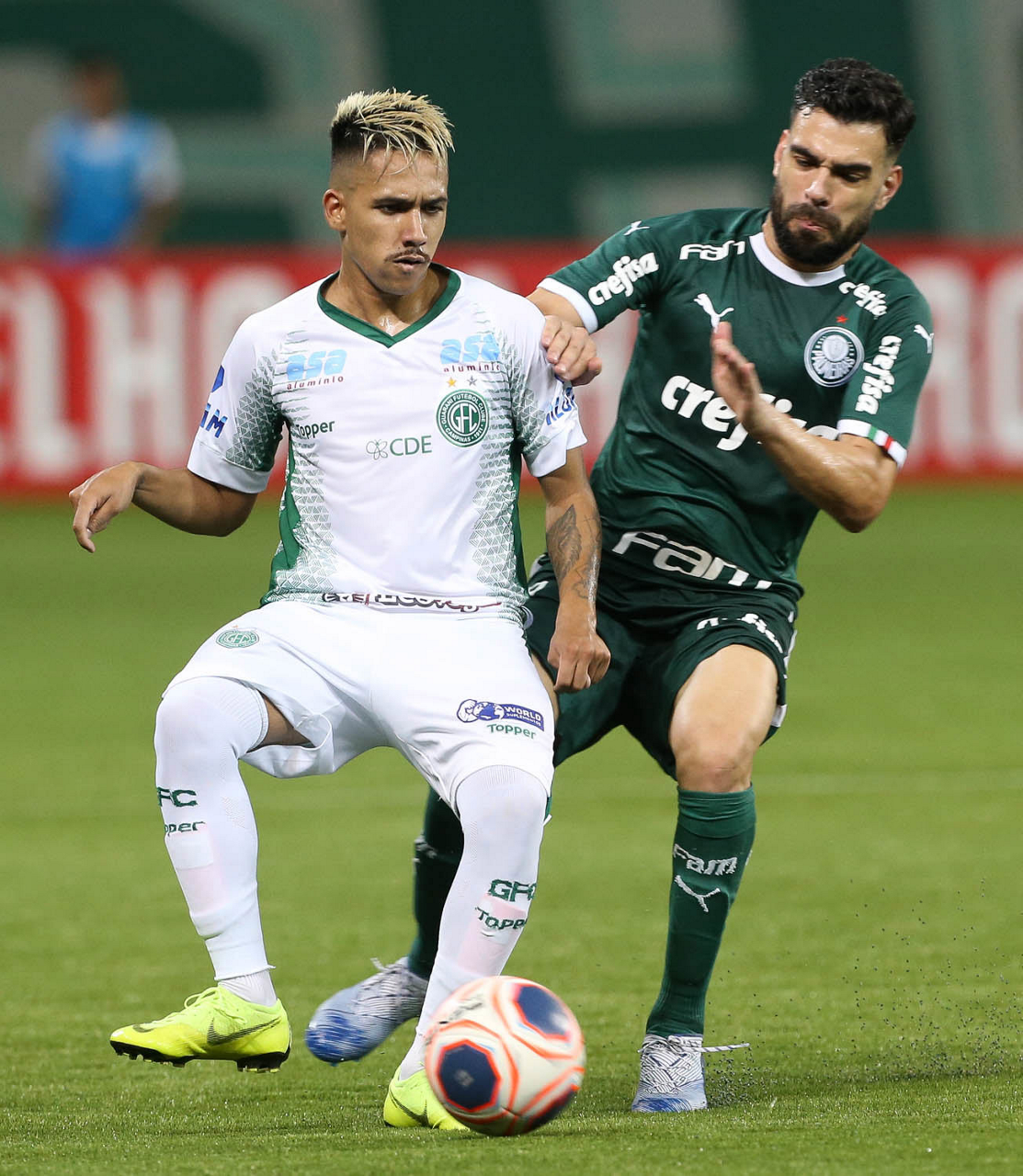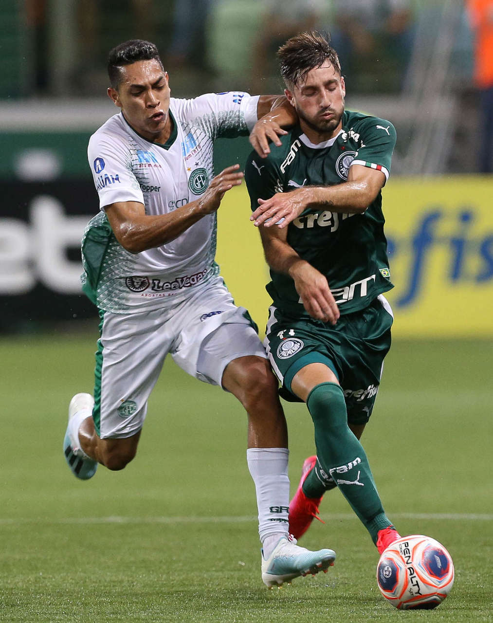 O jogador Bruno Henrique, da SE Palmeiras, disputa bola com o jogador Giovanny, do Guarani FC, durante partida válida pela sétima rodada, do Campeonato Paulista, Série A1, na arena Allianz Parque. (Foto: Cesar Greco)