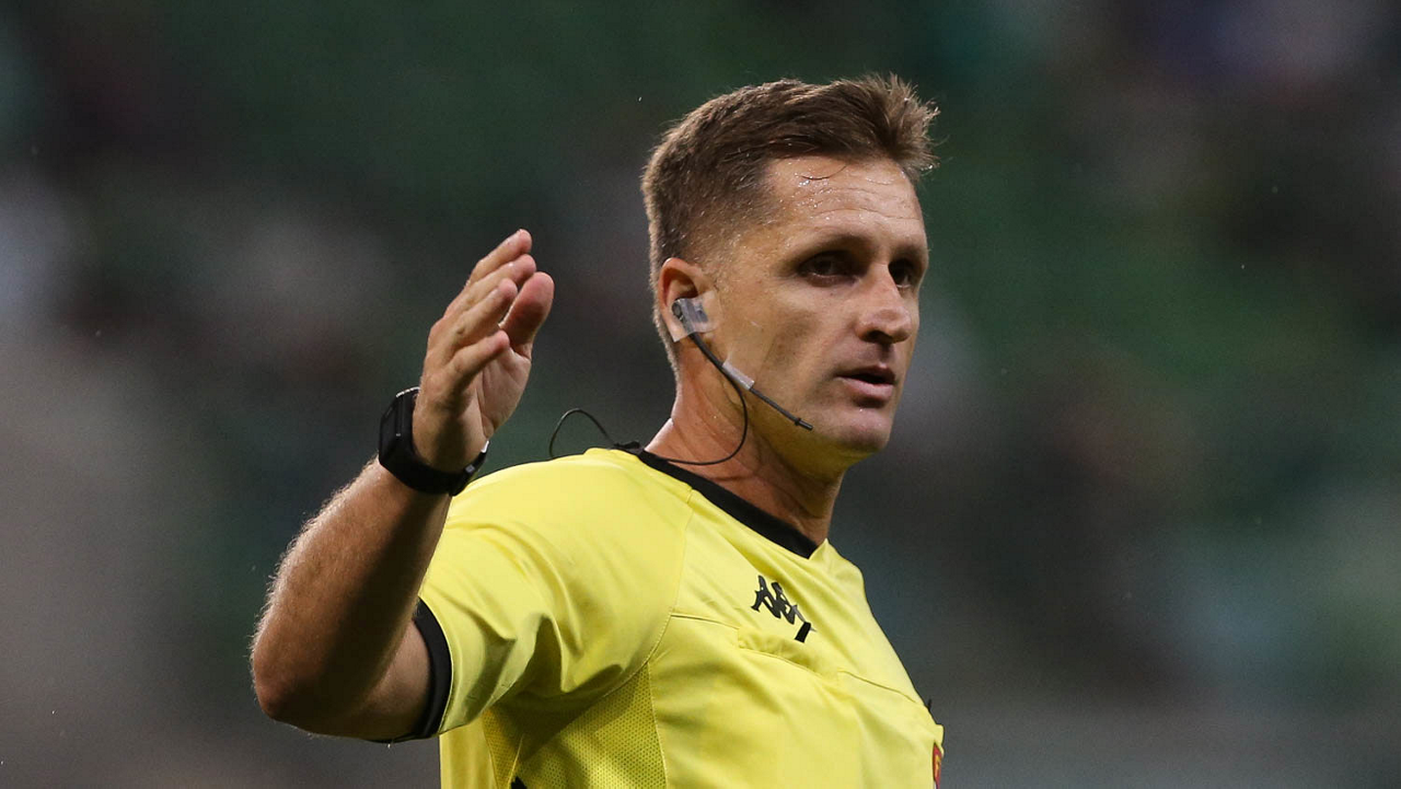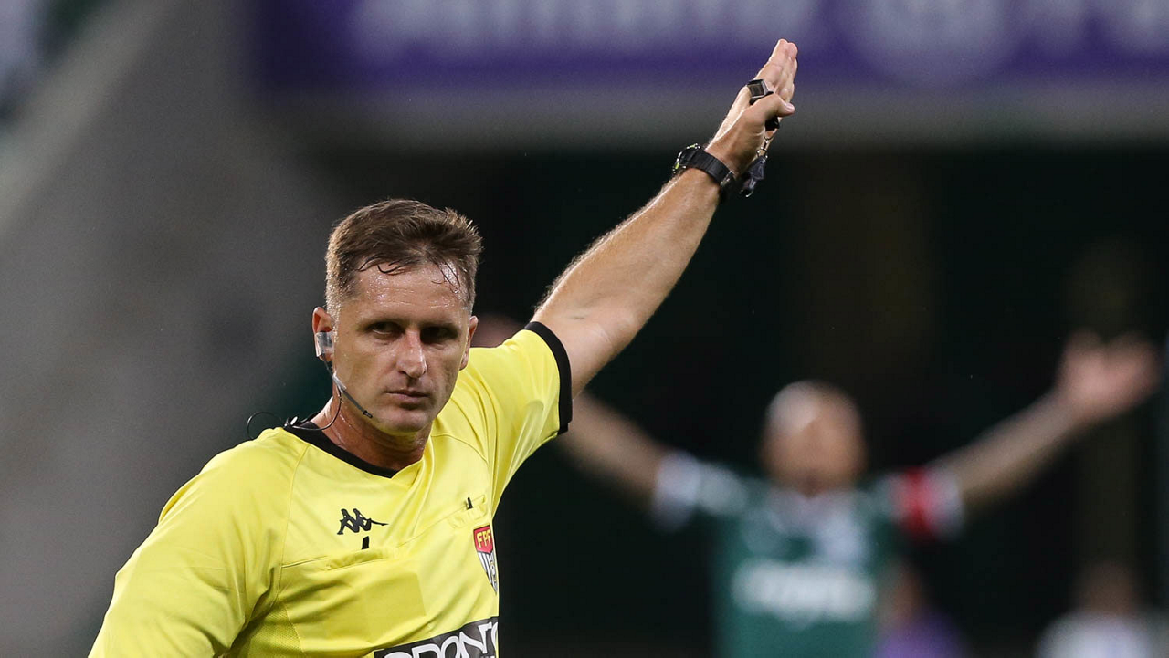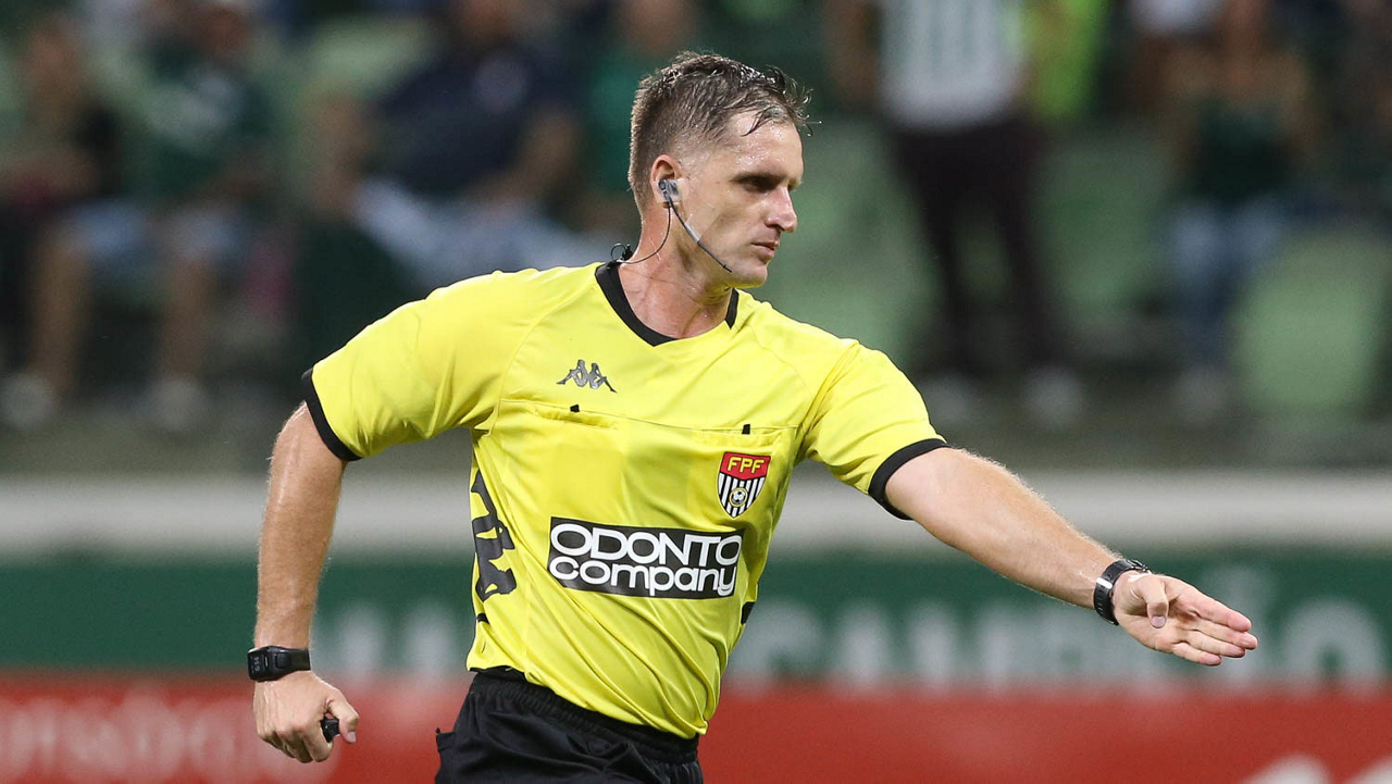 O árbitro Vinicius Furlan, do jogo entre as equipes da SE Palmeiras e Guarani FC, durante partida válida pela sétima rodada, do Campeonato Paulista, Série A1, na arena Allianz Parque. (Foto: Cesar Greco)