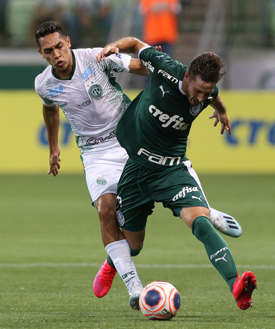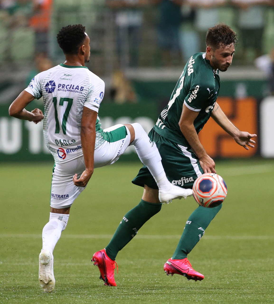 O jogador Bruno Henrique, da SE Palmeiras, disputa bola com o jogador, do Guarani FC, durante partida válida pela sétima rodada, do Campeonato Paulista, Série A1, na arena Allianz Parque. (Foto: Cesar Greco)