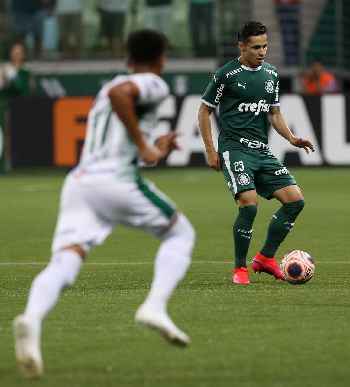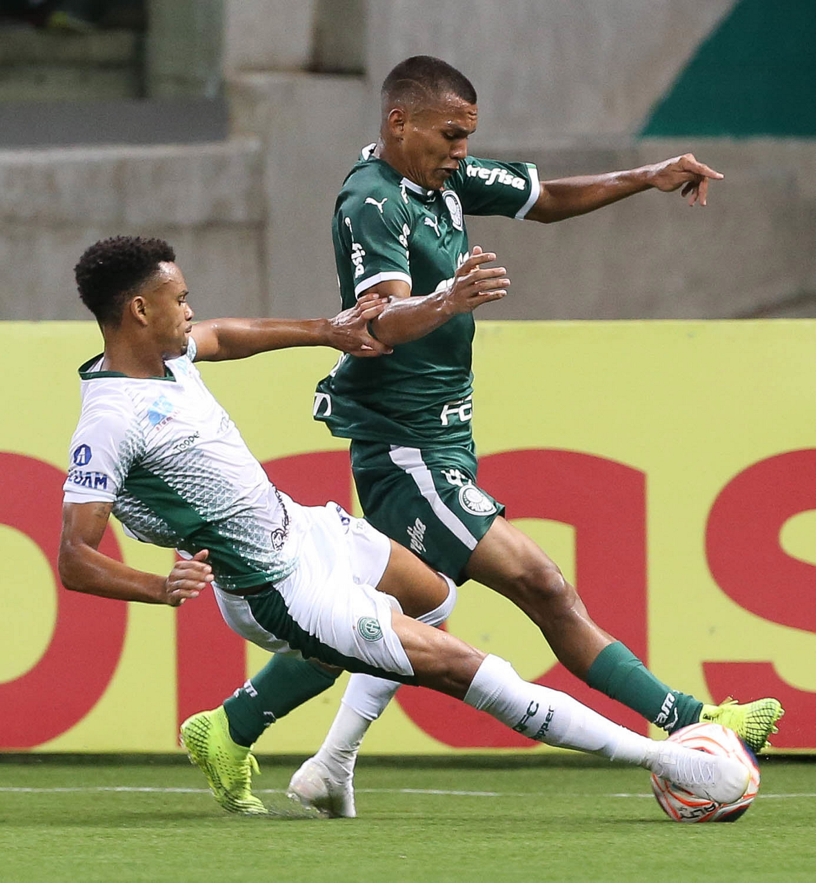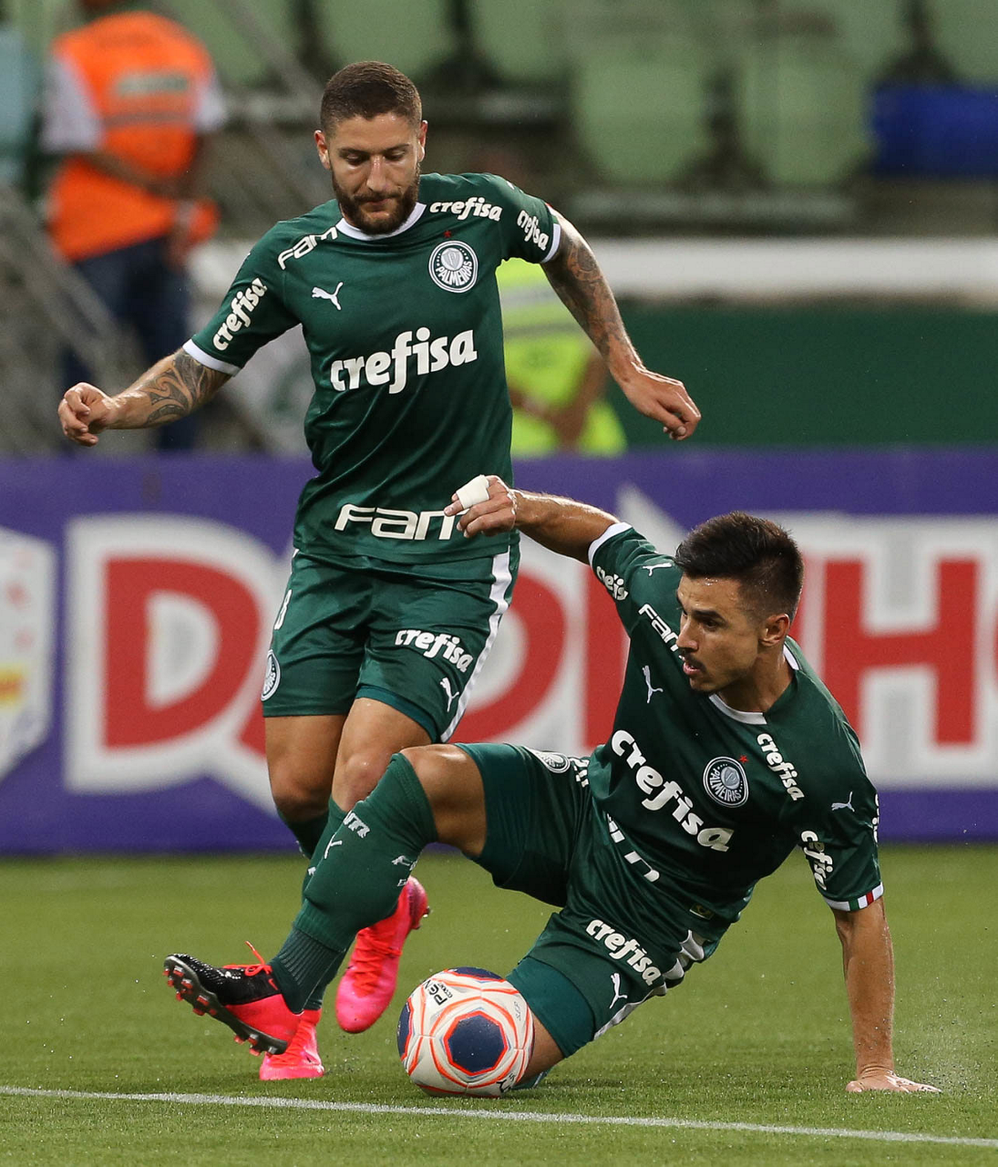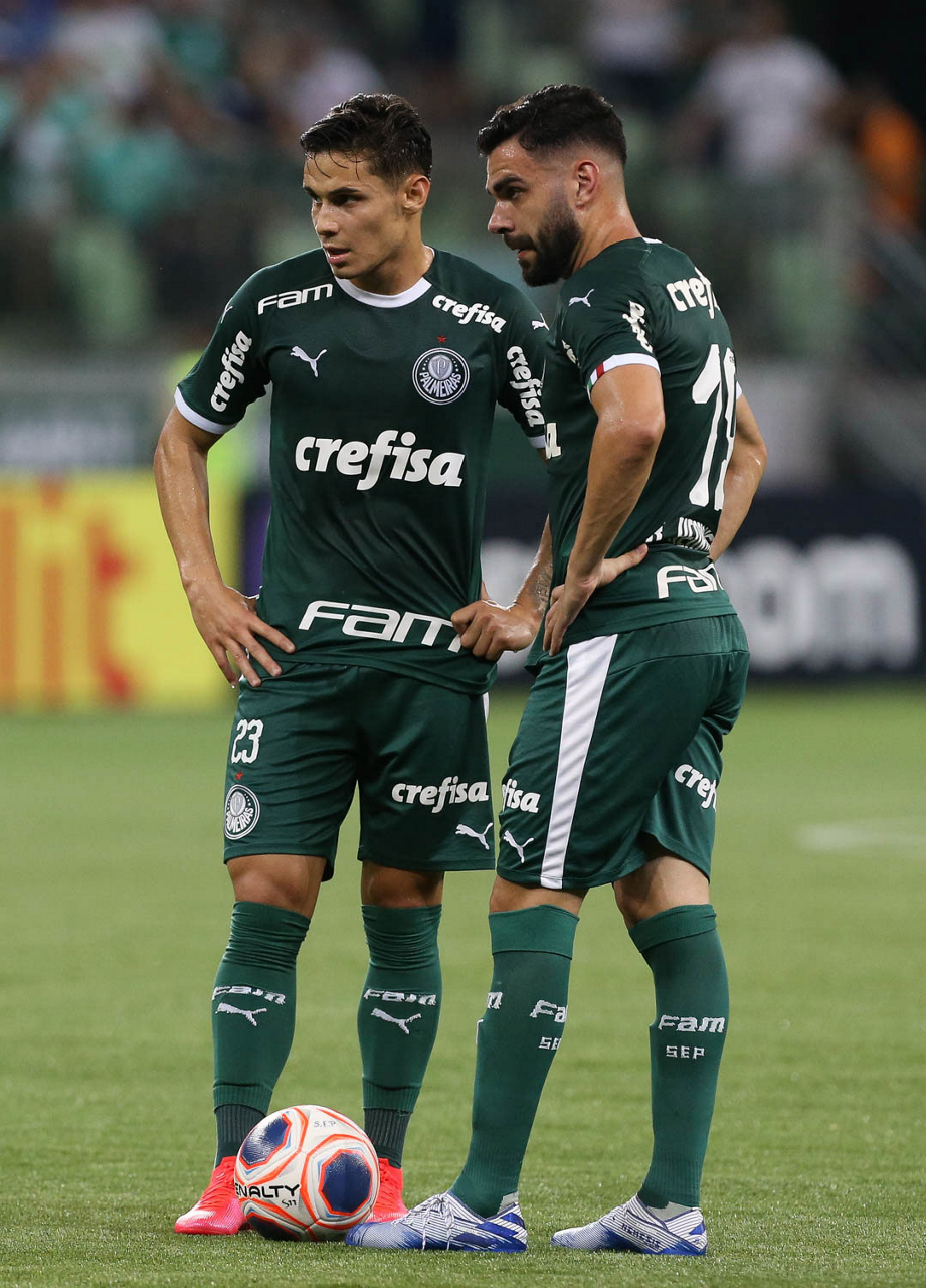 Os jogadores Raphael Veiga e Bruno Henrique (D), da SE Palmeiras, em jogo contra a equipe do Guarani FC, durante partida válida pela sétima rodada, do Campeonato Paulista, Série A1, na arena Allianz Parque. (Foto: Cesar Greco)