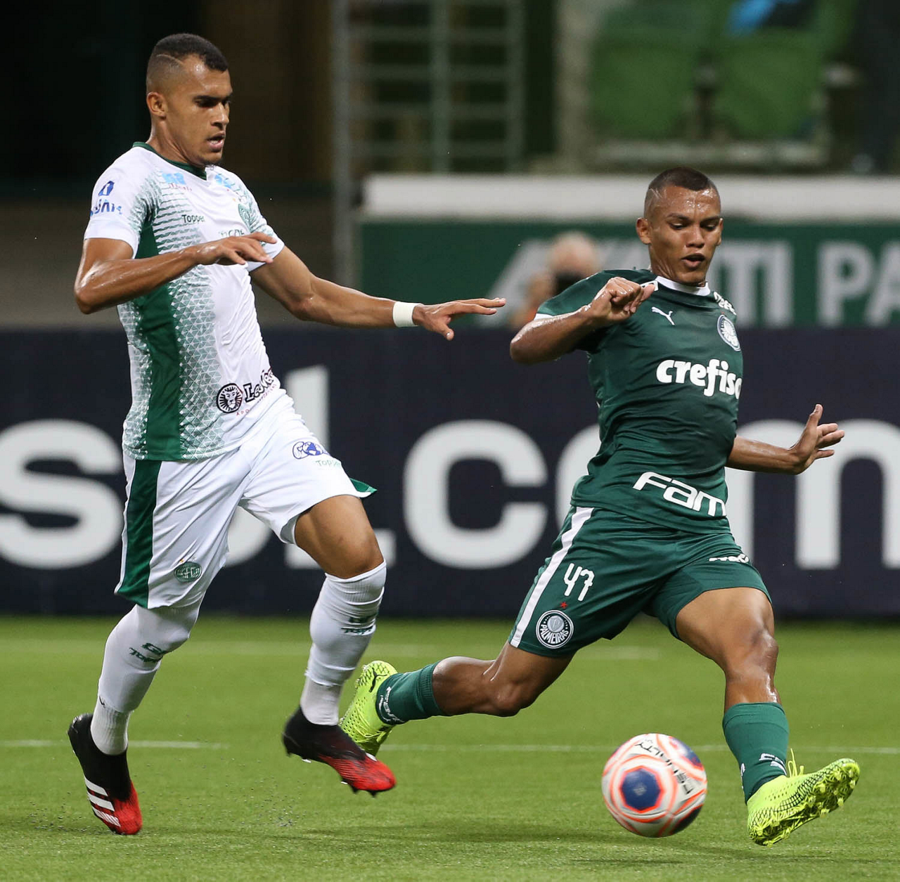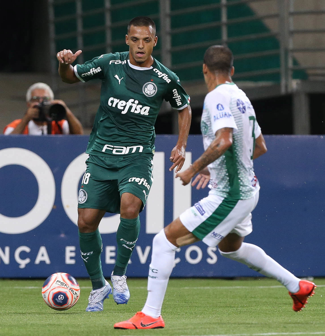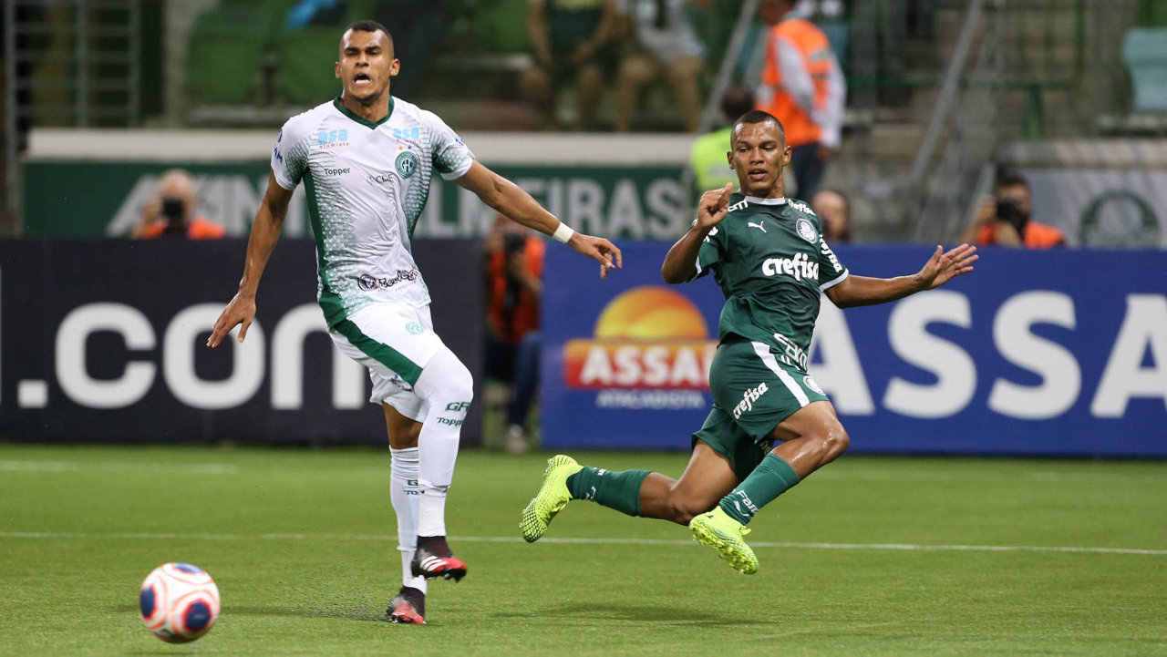 O jogador Gabriel Menino, da SE Palmeiras, disputa bola com o jogador, do Guarani FC, durante partida válida pela sétima rodada, do Campeonato Paulista, Série A1, na arena Allianz Parque. (Foto: Cesar Greco)
