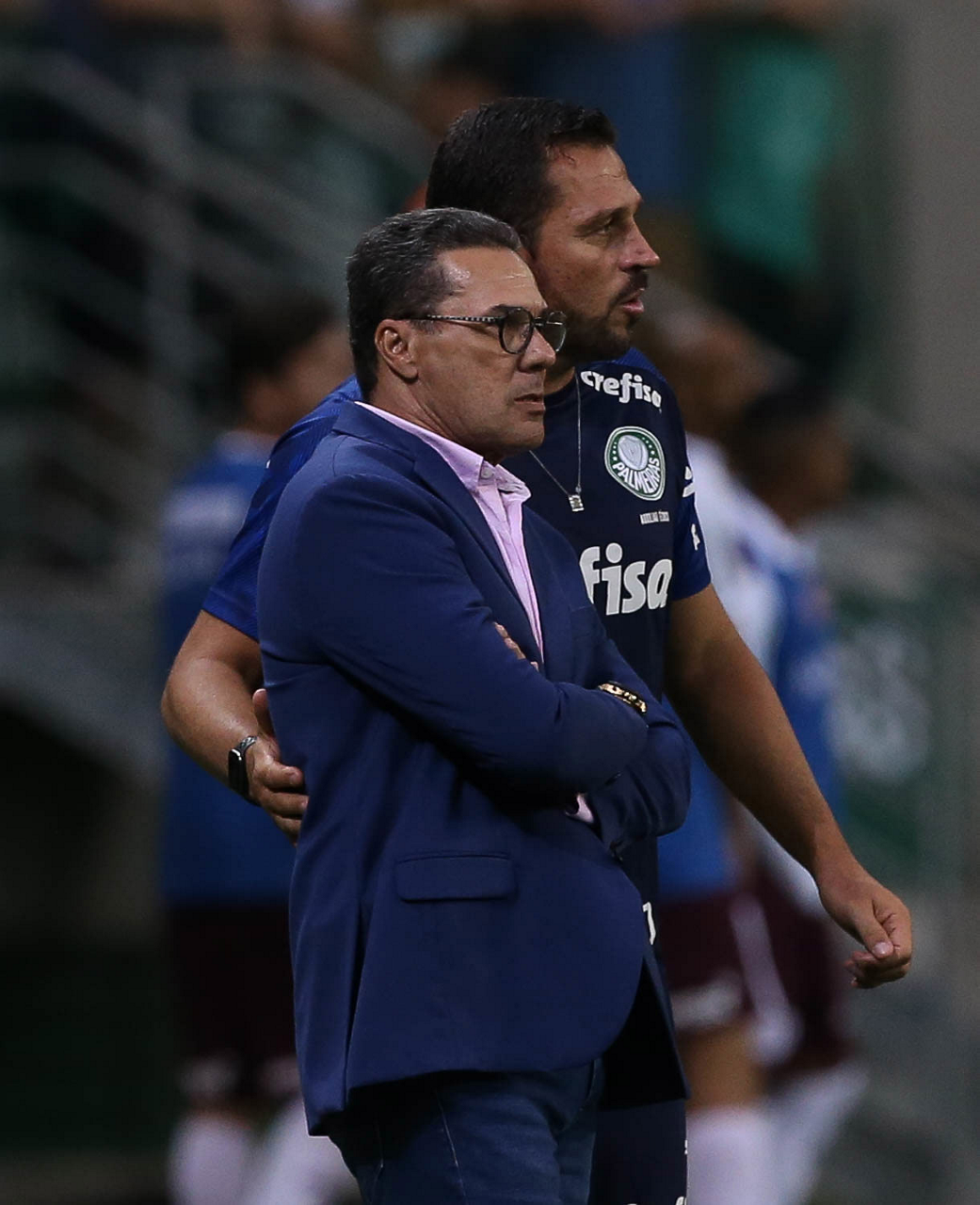 O técnico Vanderlei Luxemburgo e o auxiliar técnico Maurício Copertino (D), da SE Palmeiras, em jogo contra a equipe da A Ferroviária E, durante partida válida pela nona rodada, do Campeonato Paulista, Série A1, na arena Allianz Parque. (Foto: Cesar Greco)