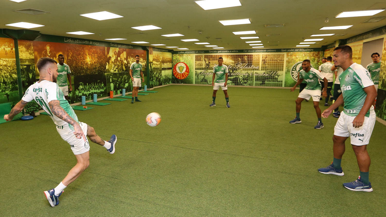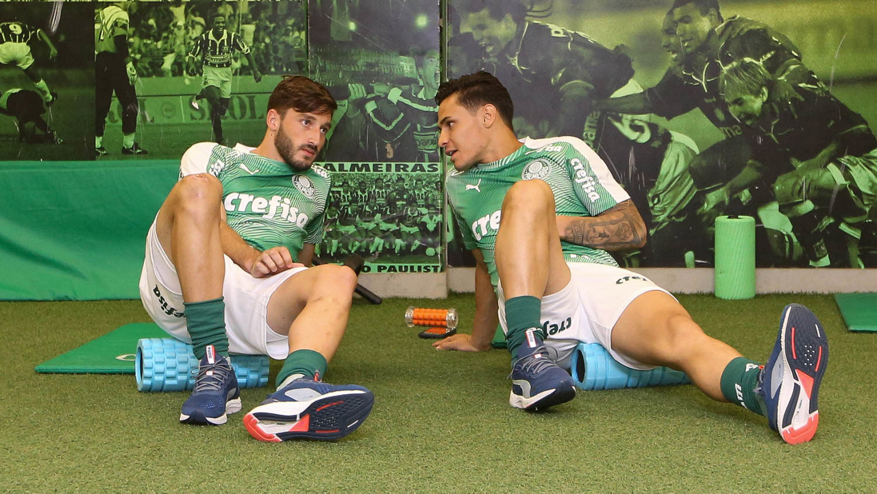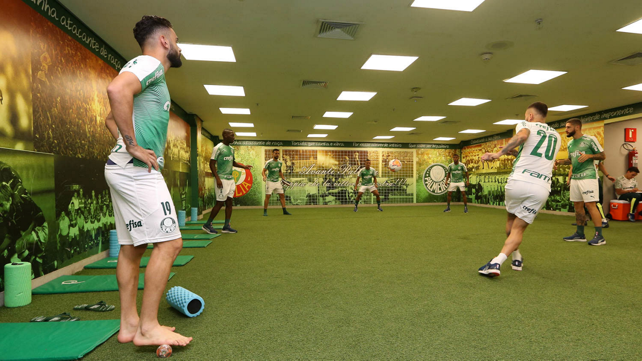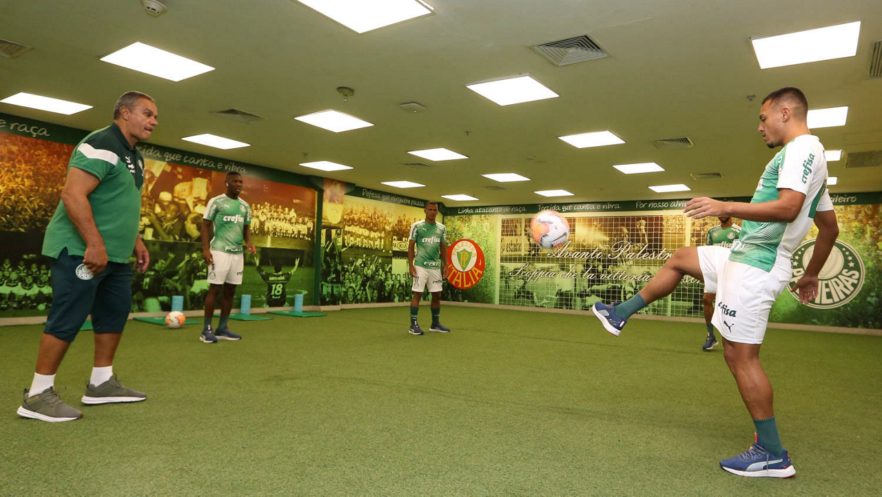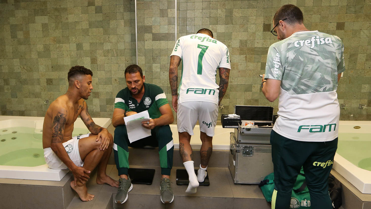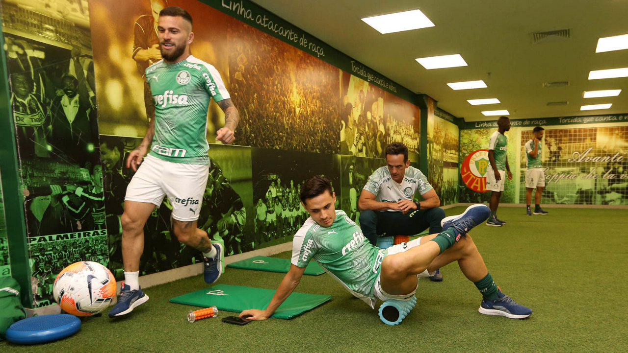 Os jogadores Marcos Rocha e Dudu (E e C), o auxiliar técnico Maurício Copertino e o fisiologista Vinicius Ponzio (E e D), da SE Palmeiras, preparam-se para o jogo contra a equipe do C Guaraní, durante partida válida pela segunda rodada, fase de grupos, da Copa Conmebol Libertadores, na arena Allianz Parque. (Foto: Cesar Greco)