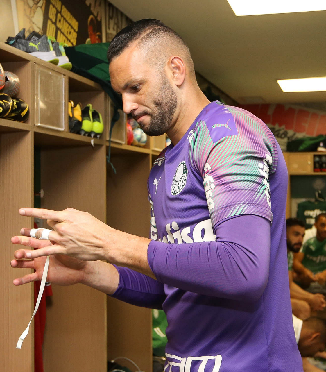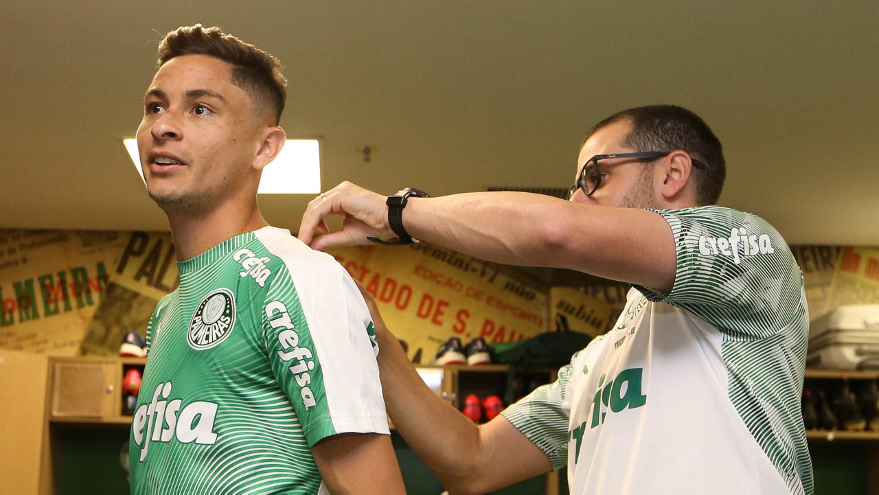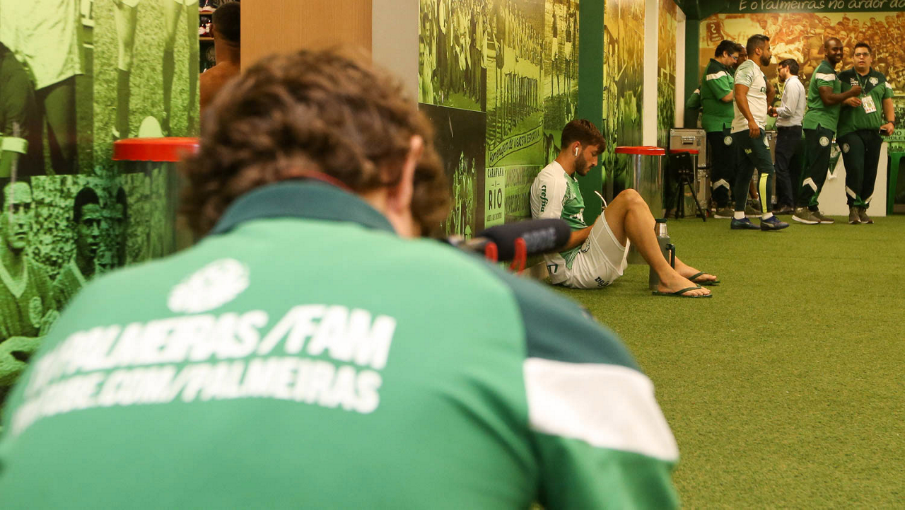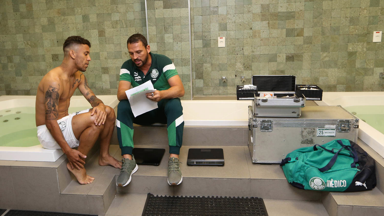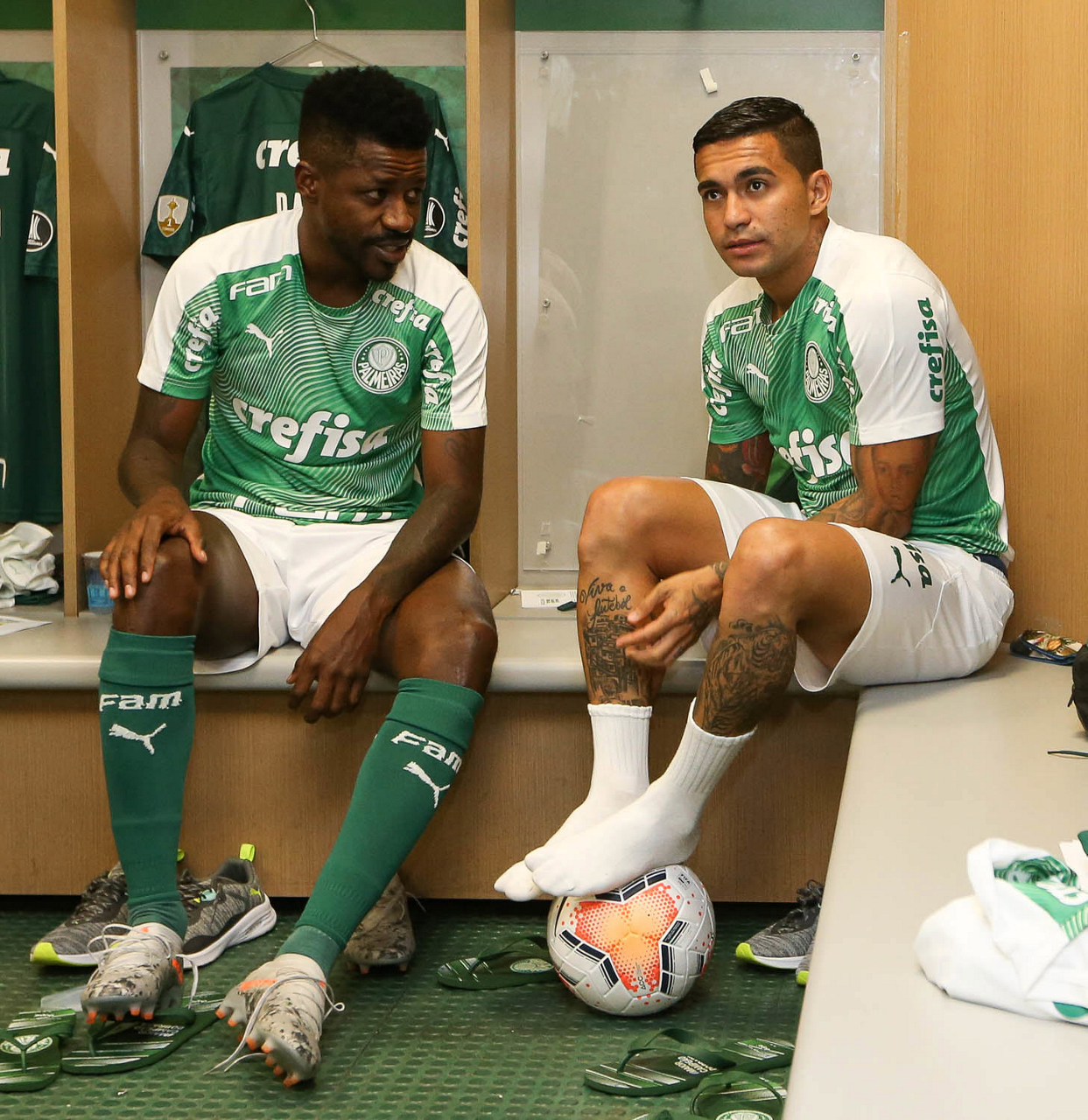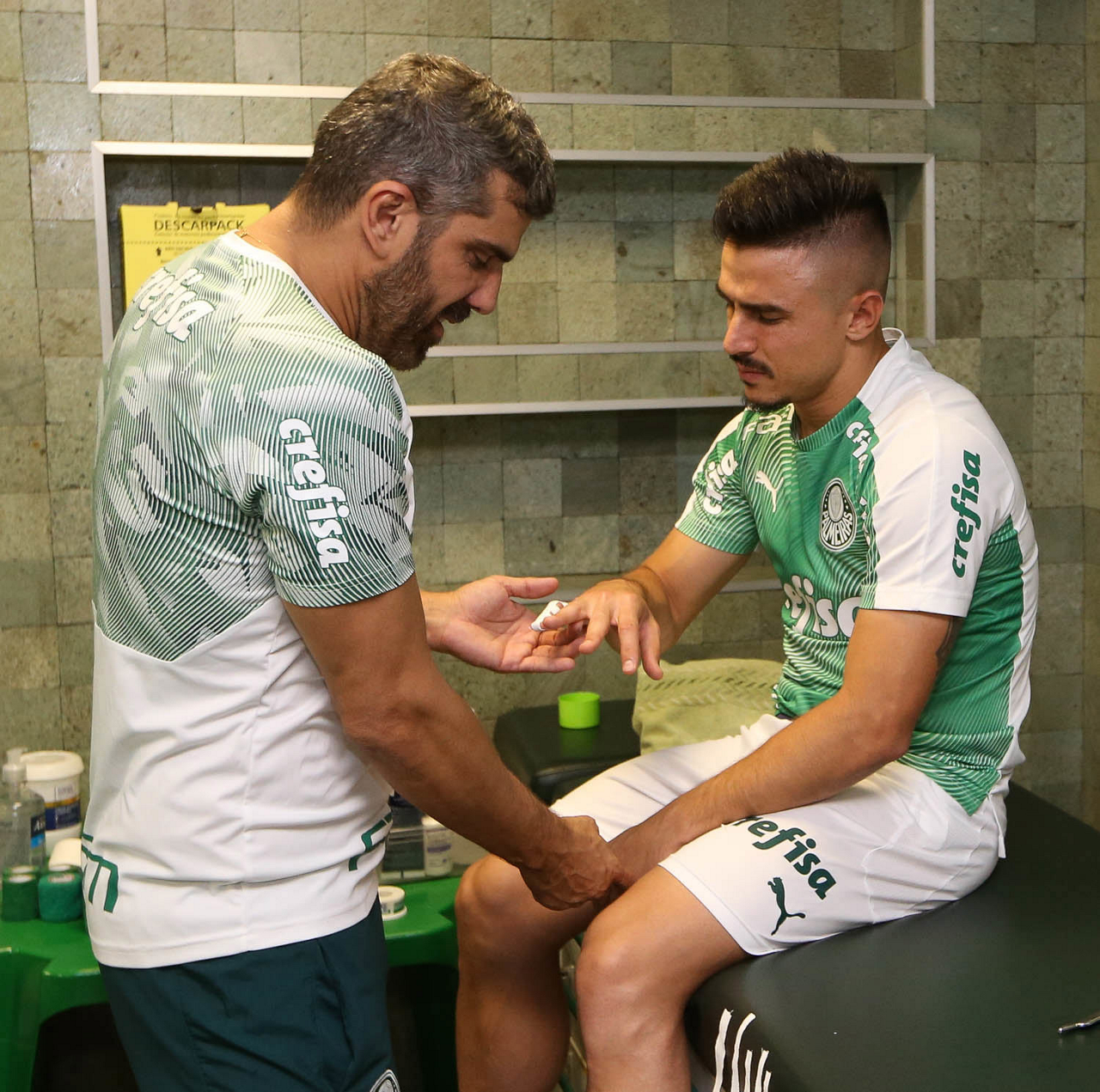 Os jogadores Marcos Rocha e Dudu (E e C), o auxiliar técnico Maurício Copertino e o fisiologista Vinicius Ponzio (E e D), da SE Palmeiras, preparam-se para o jogo contra a equipe do C Guaraní, durante partida válida pela segunda rodada, fase de grupos, da Copa Conmebol Libertadores, na arena Allianz Parque. (Foto: Cesar Greco)