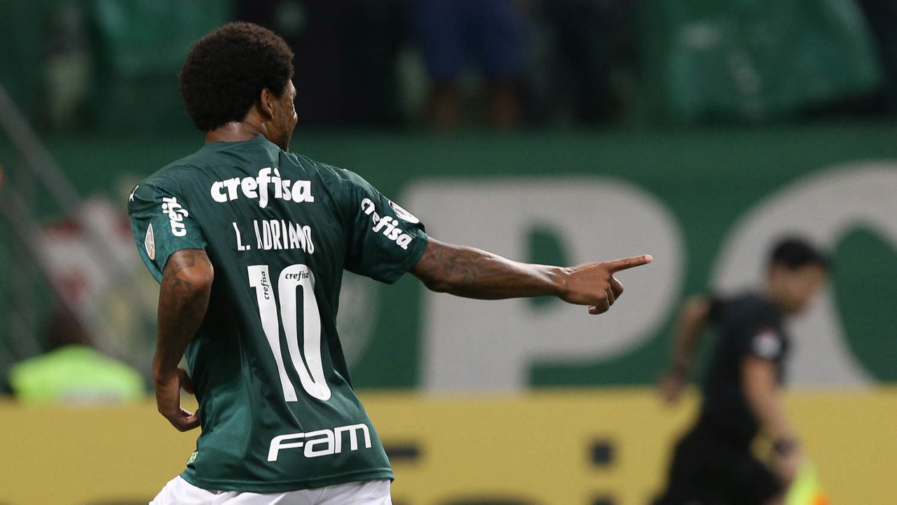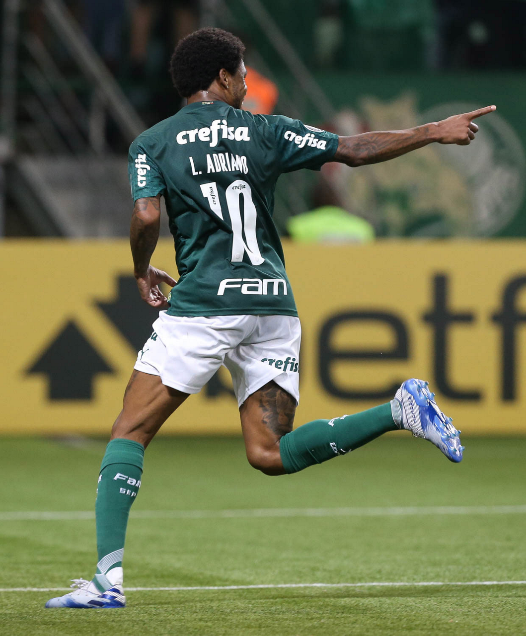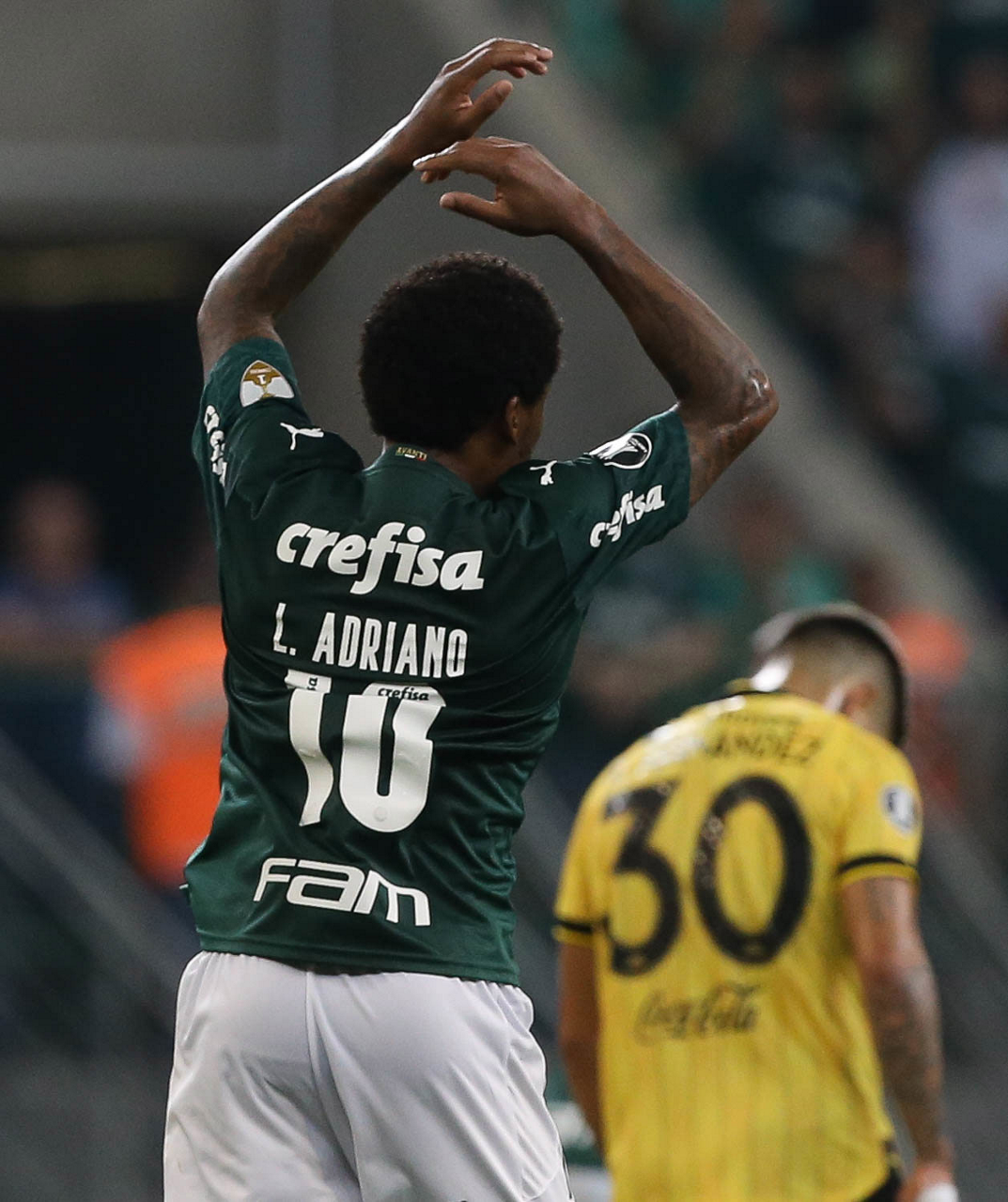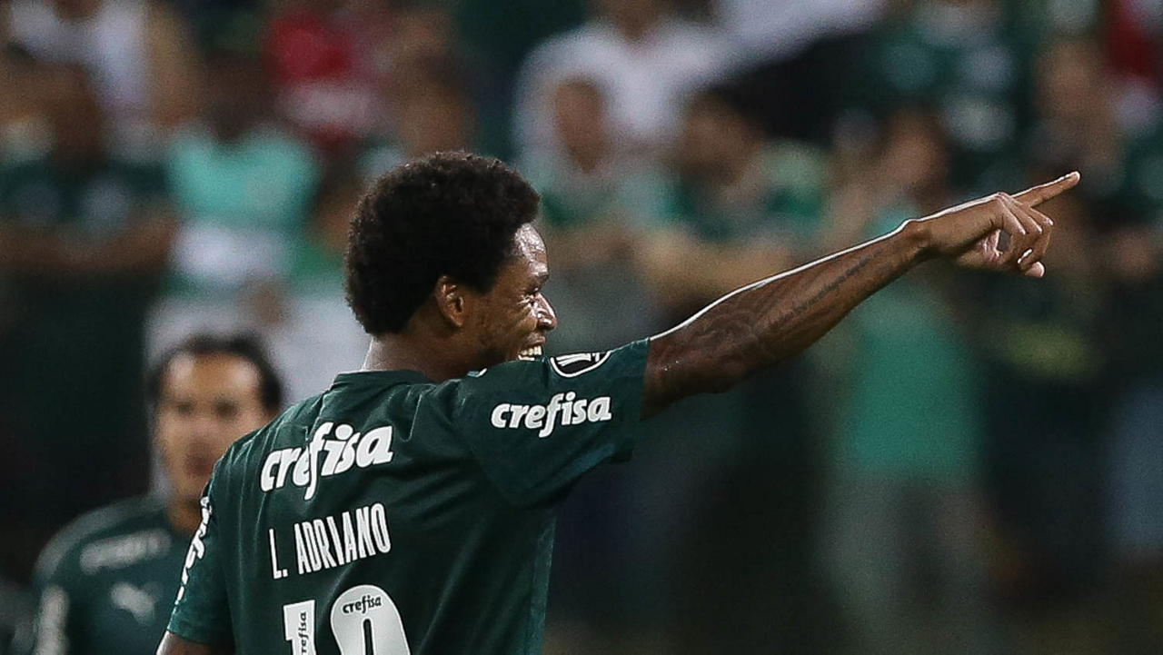 O jogador Luiz Adriano, da SE Palmeiras, comemora seu gol contra a equipe do C Guaraní, durante partida válida pela segunda rodada, fase de grupos, da Copa Conmebol Libertadores, na arena Allianz Parque. (Foto: Cesar Greco)