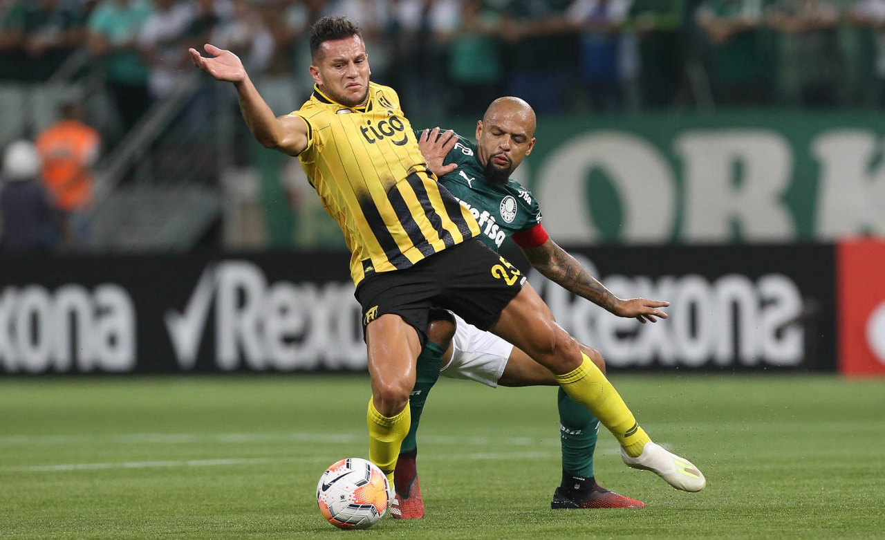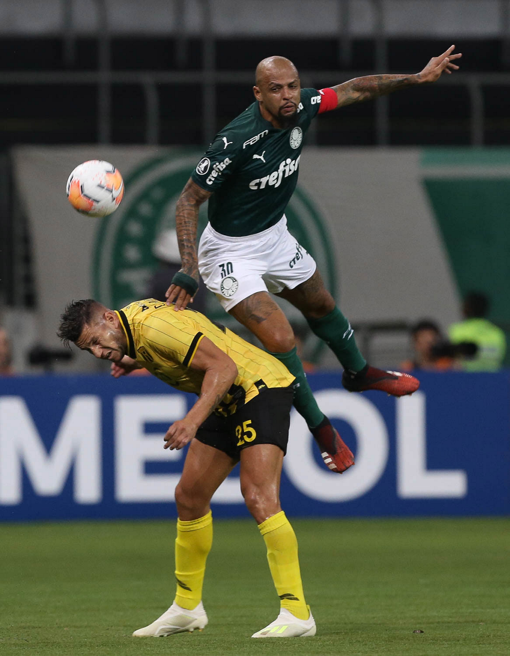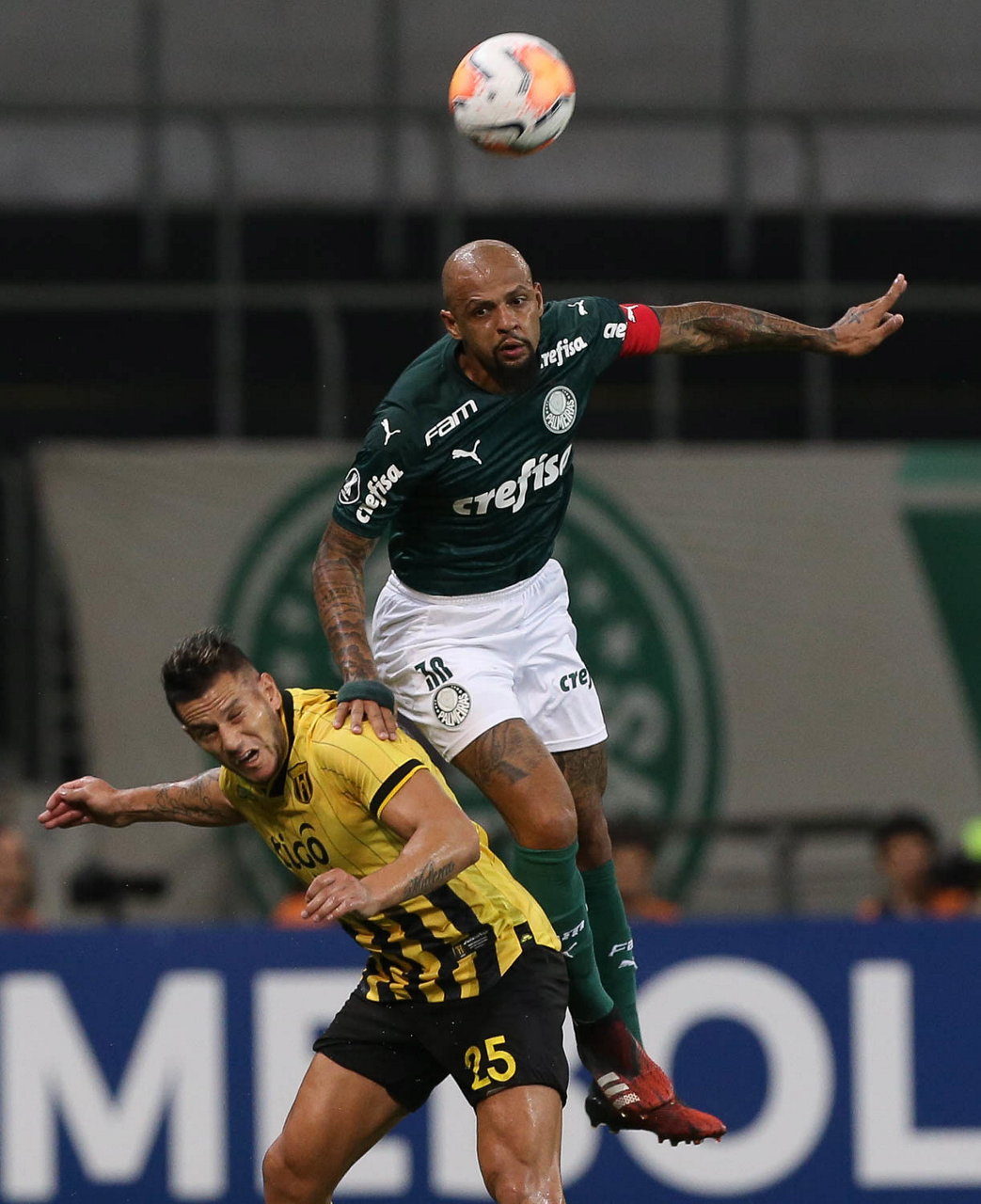 O jogador Felipe Melo, da SE Palmeiras, disputa bola com o jogador Raúl Bobadilla, do C Guaraní, durante partida válida pela segunda rodada, fase de grupos, da Copa Conmebol Libertadores, na arena Allianz Parque. (Foto: Cesar Greco)