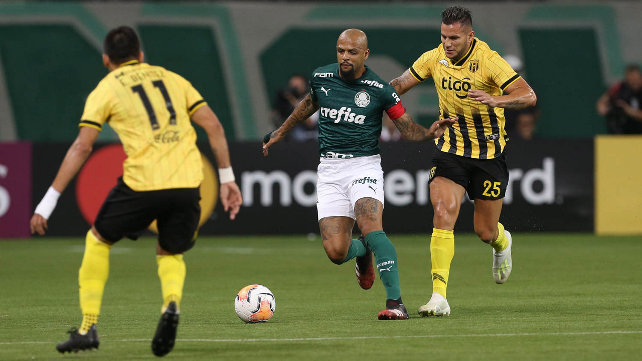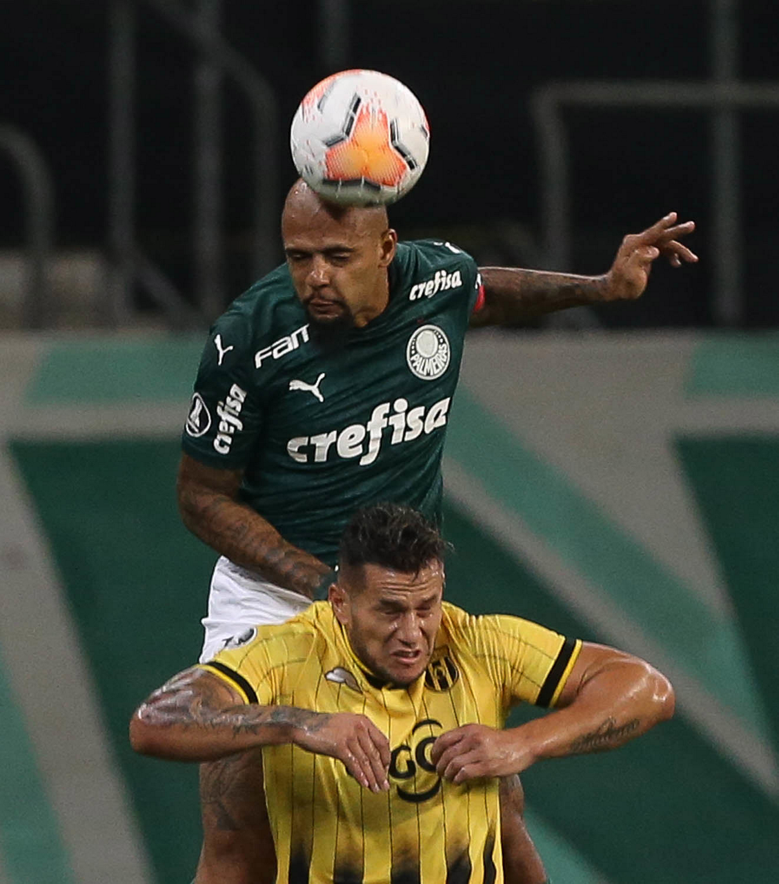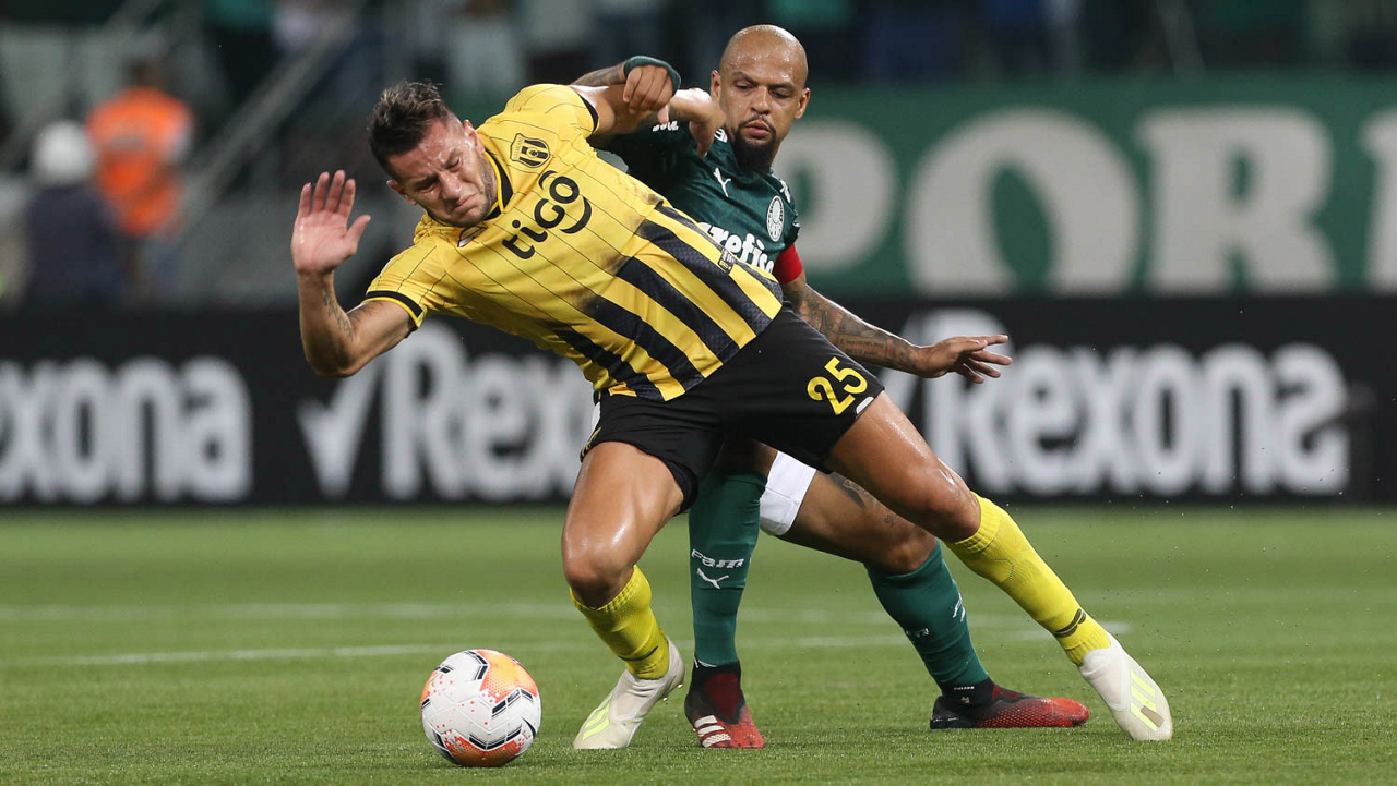 O jogador Felipe Melo, da SE Palmeiras, disputa bola com o jogador Raúl Bobadilla, do C Guaraní, durante partida válida pela segunda rodada, fase de grupos, da Copa Conmebol Libertadores, na arena Allianz Parque. (Foto: Cesar Greco)