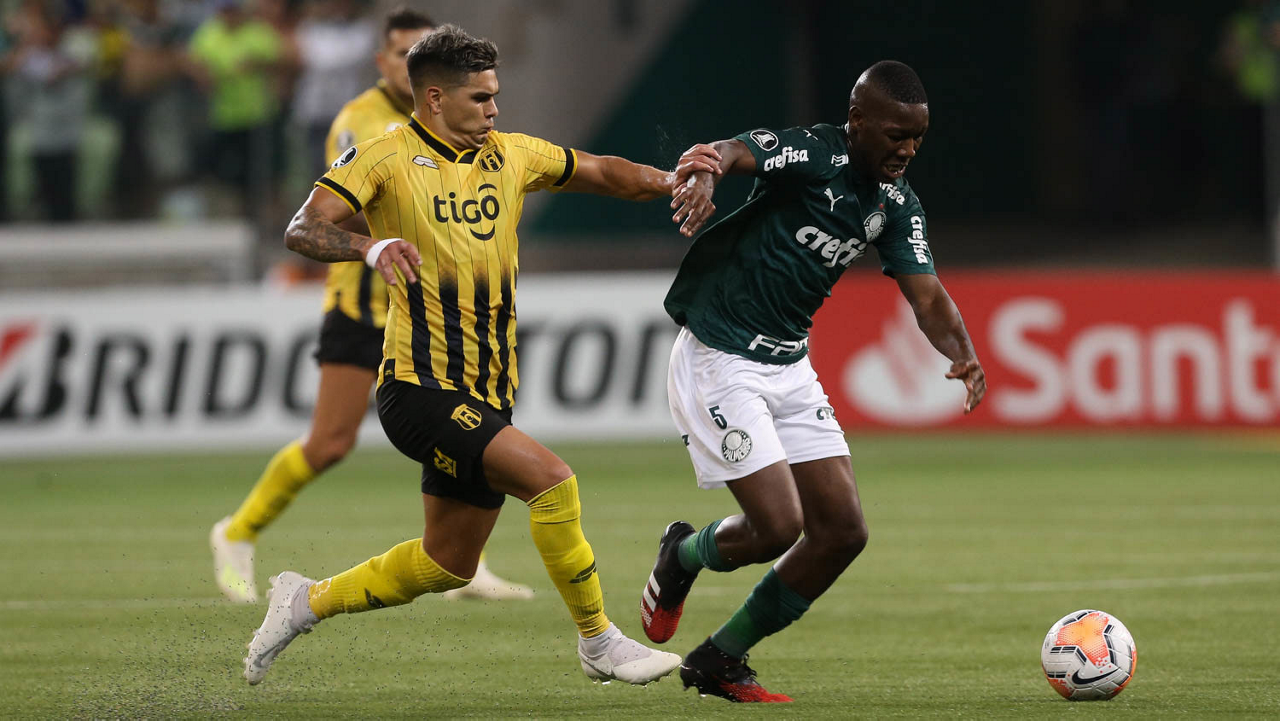 O jogador Patrick de Paula, da SE Palmeiras, disputa bola com o jogador Ángel Benítez, do C Guaraní, durante partida válida pela segunda rodada, fase de grupos, da Copa Conmebol Libertadores, na arena Allianz Parque. (Foto: Cesar Greco)