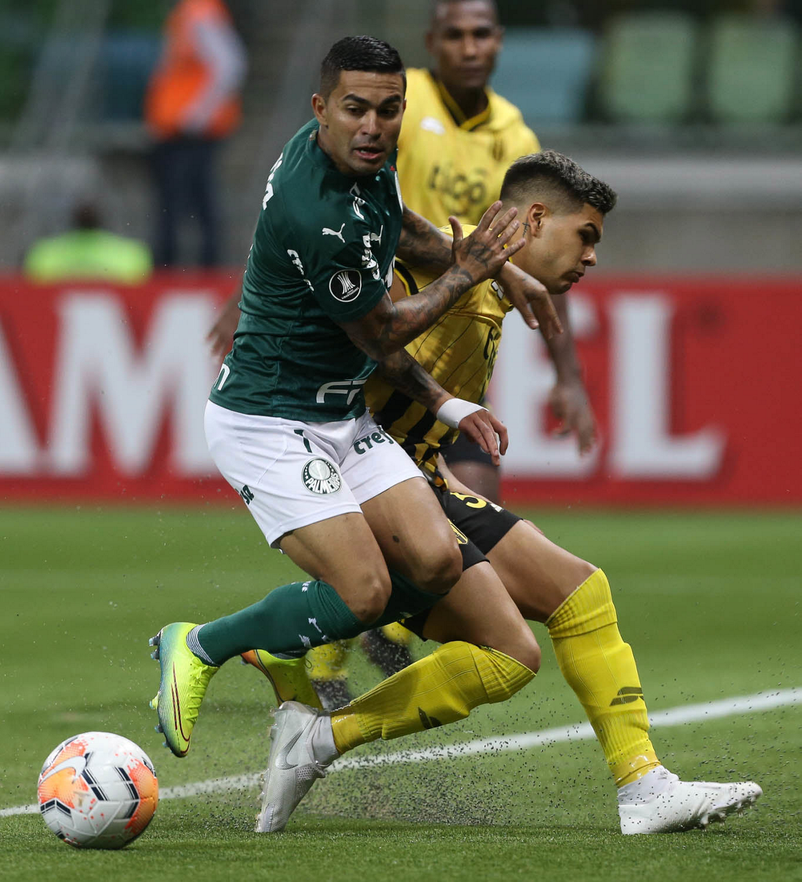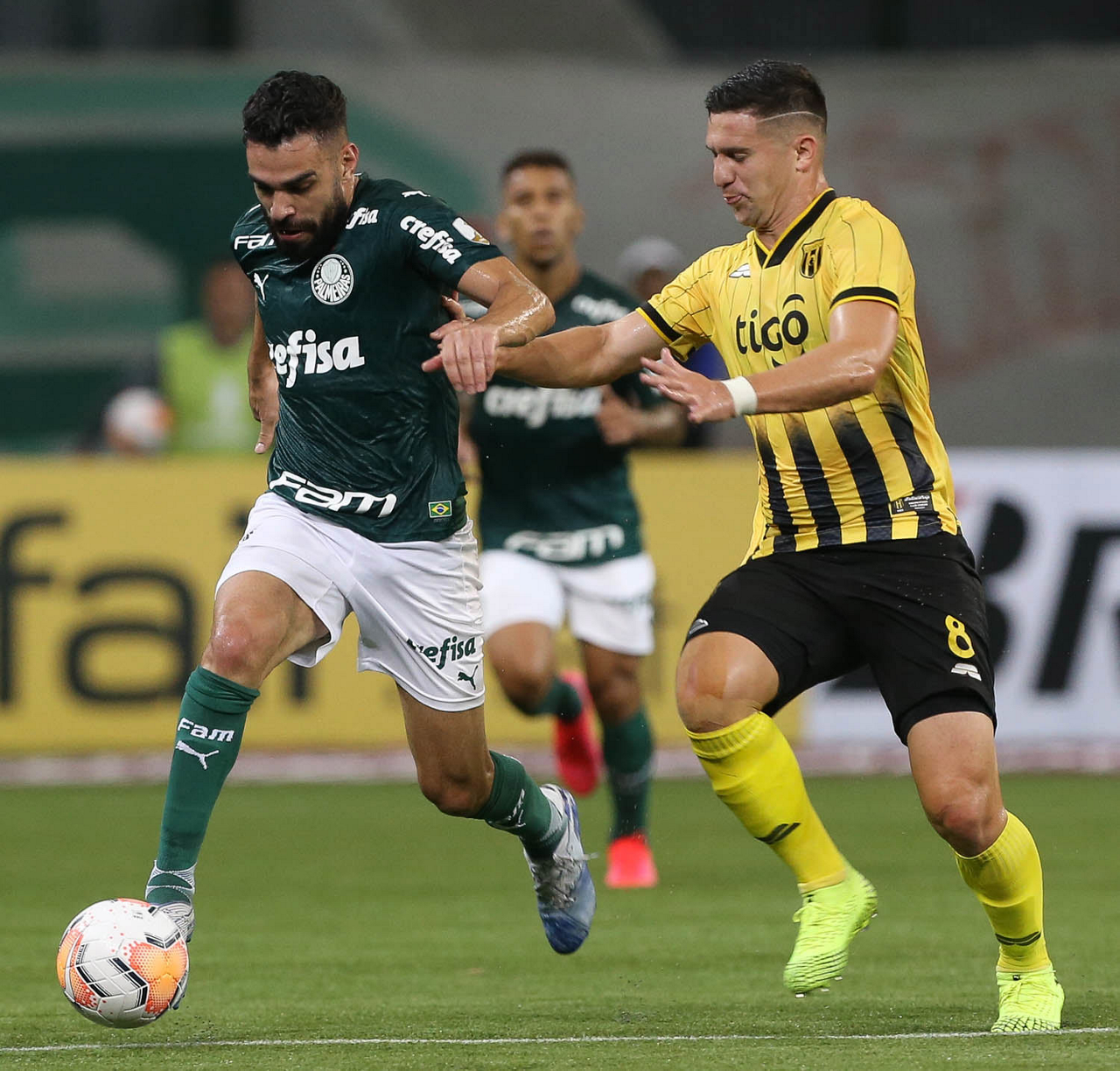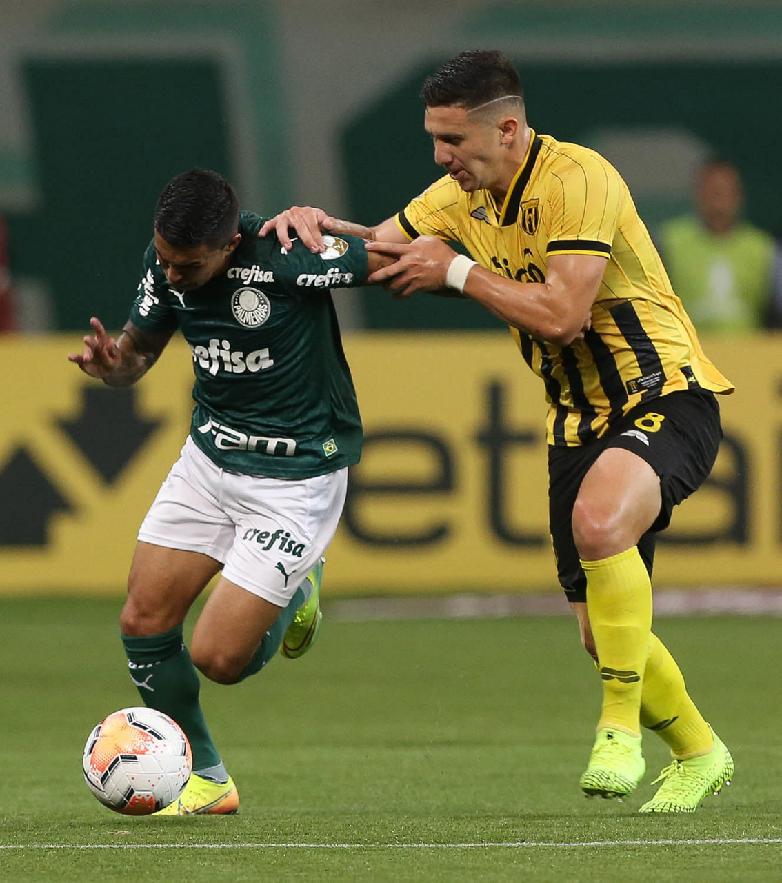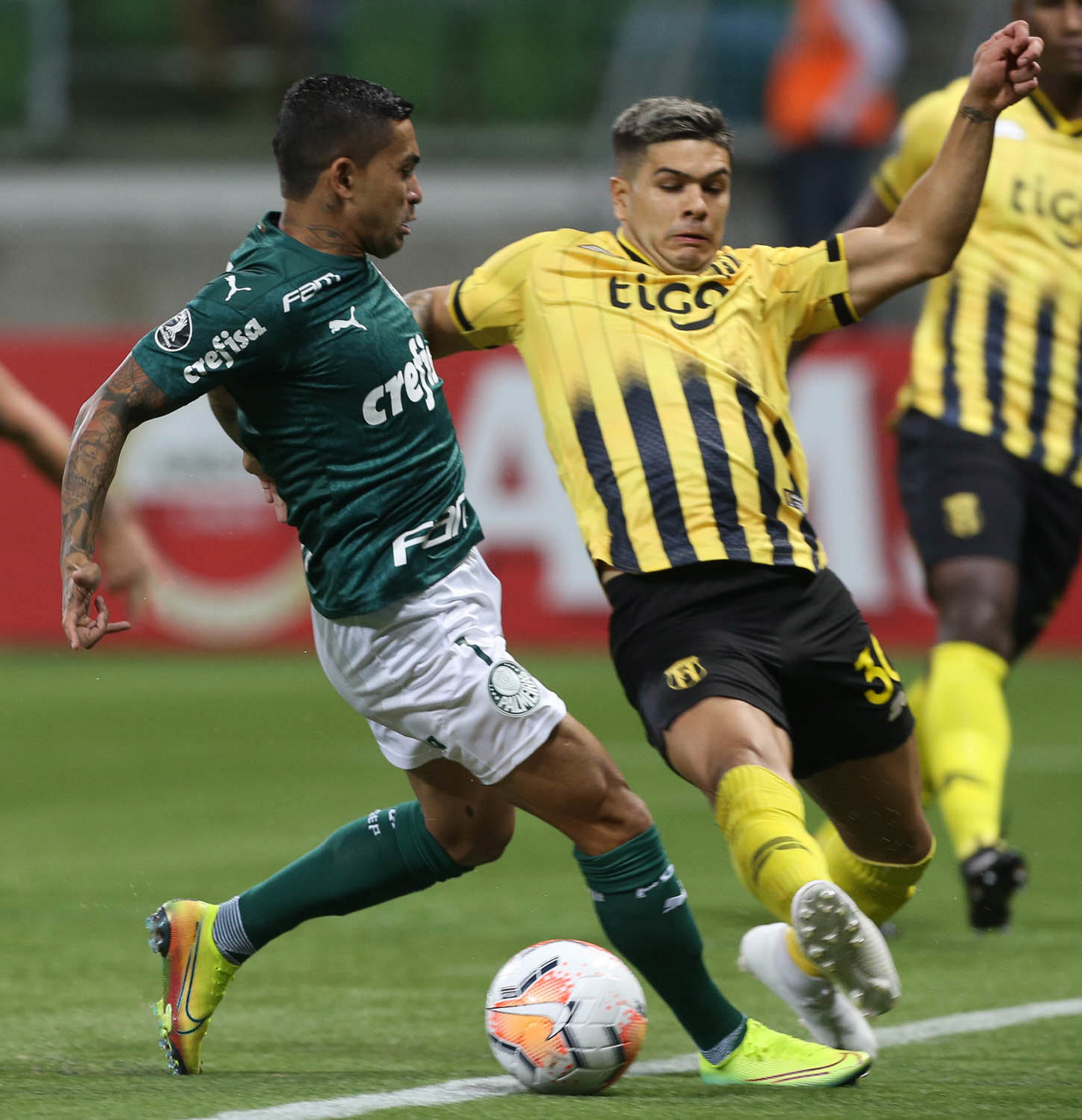 O jogador Dudu, da SE Palmeiras, disputa bola com o jogador, do C Guaraní, durante partida válida pela segunda rodada, fase de grupos, da Copa Conmebol Libertadores, na arena Allianz Parque. (Foto: Cesar Greco)