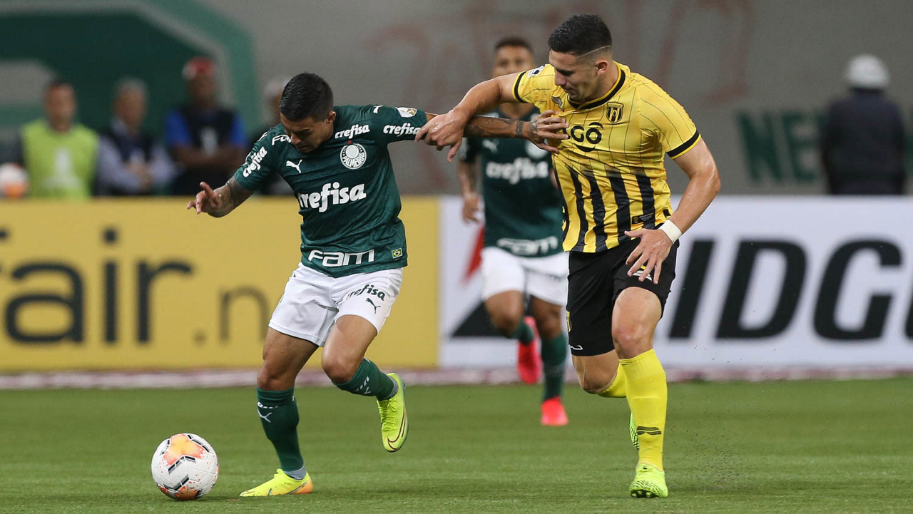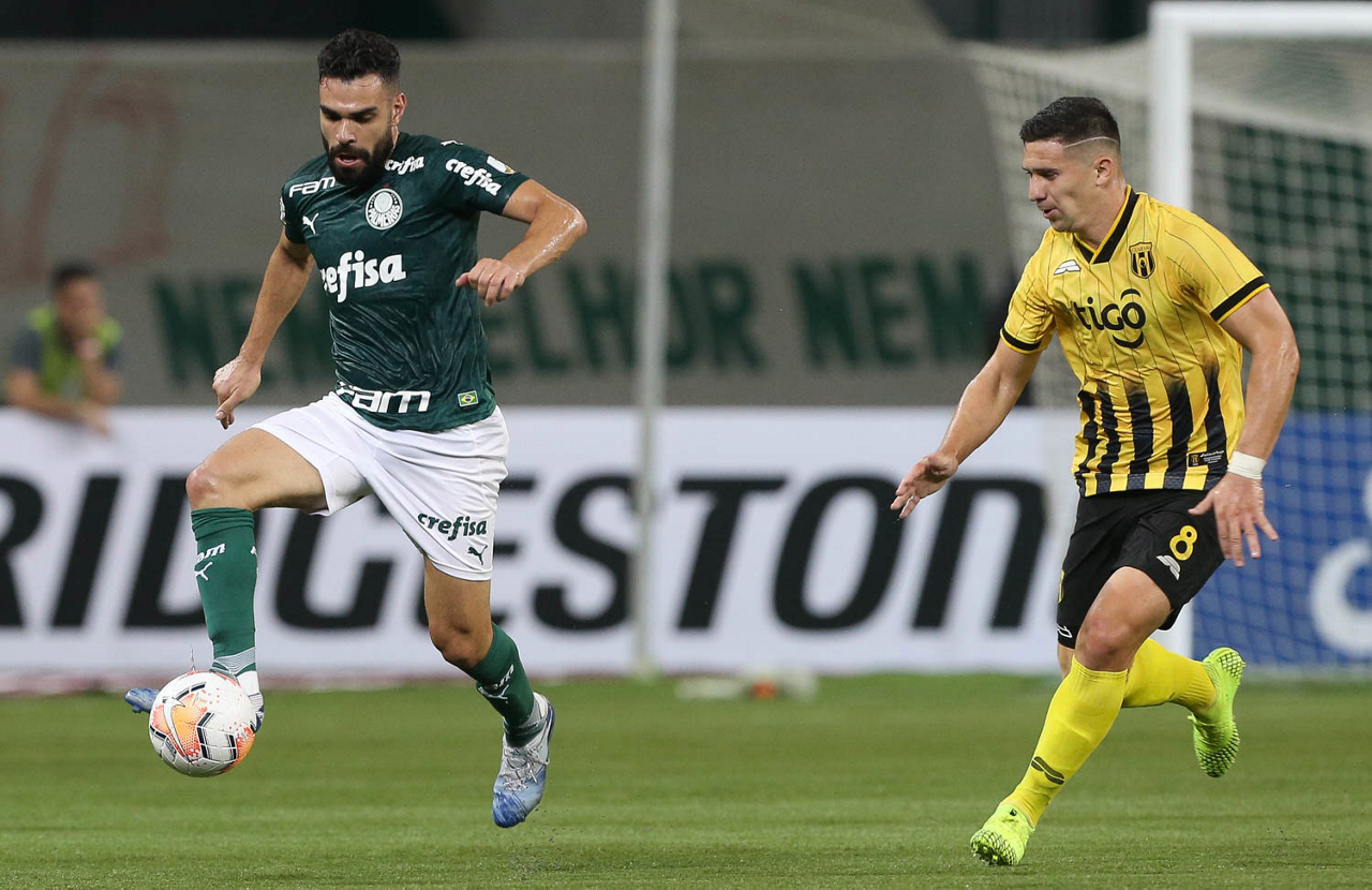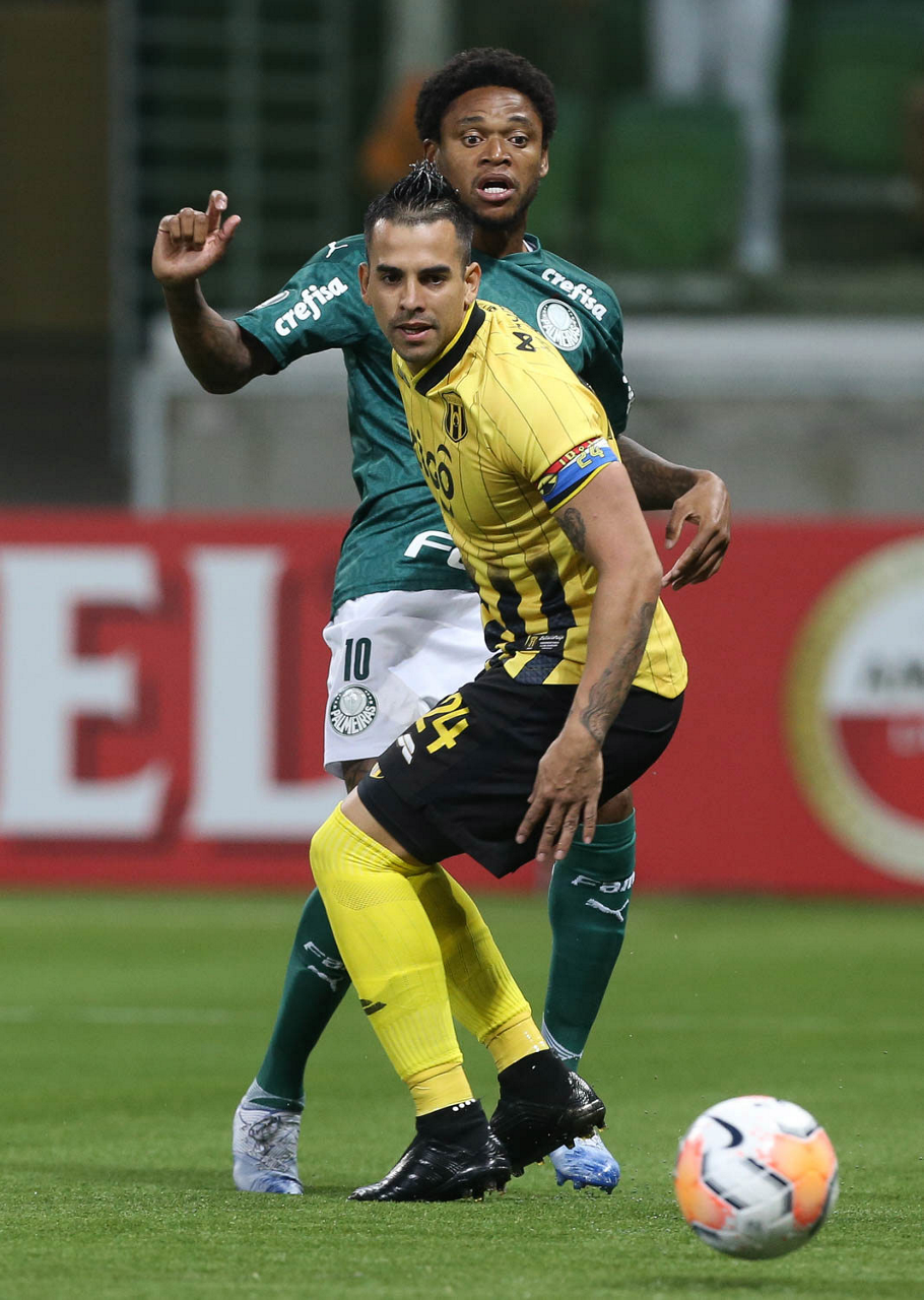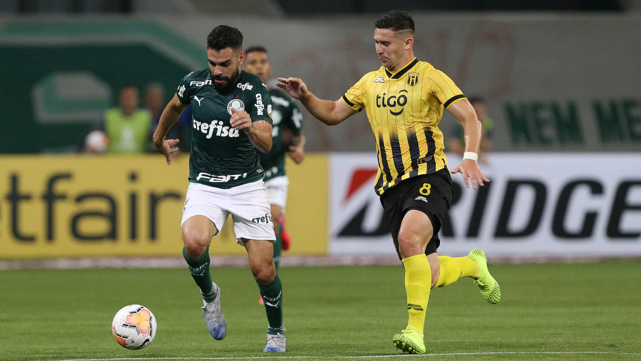 O jogador Dudu, da SE Palmeiras, disputa bola com o jogador, do C Guaraní, durante partida válida pela segunda rodada, fase de grupos, da Copa Conmebol Libertadores, na arena Allianz Parque. (Foto: Cesar Greco)