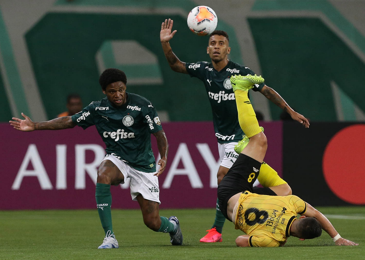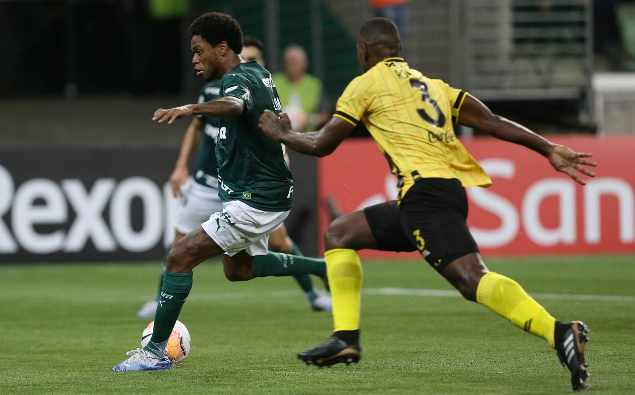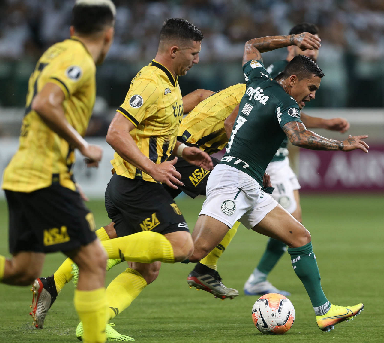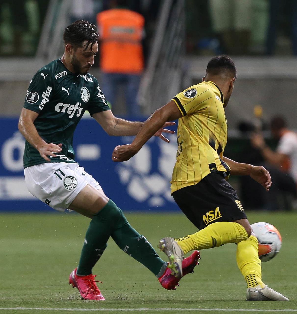 O jogador Dudu, da SE Palmeiras, disputa bola com o jogador, do C Guaraní, durante partida válida pela segunda rodada, fase de grupos, da Copa Conmebol Libertadores, na arena Allianz Parque. (Foto: Cesar Greco)