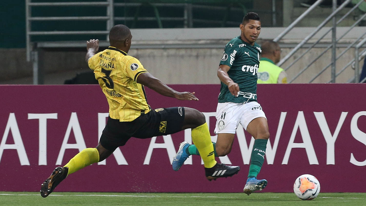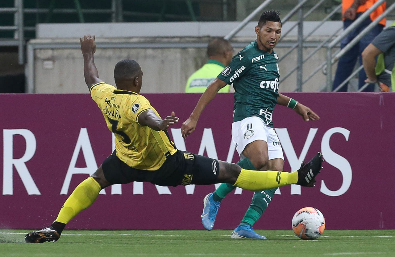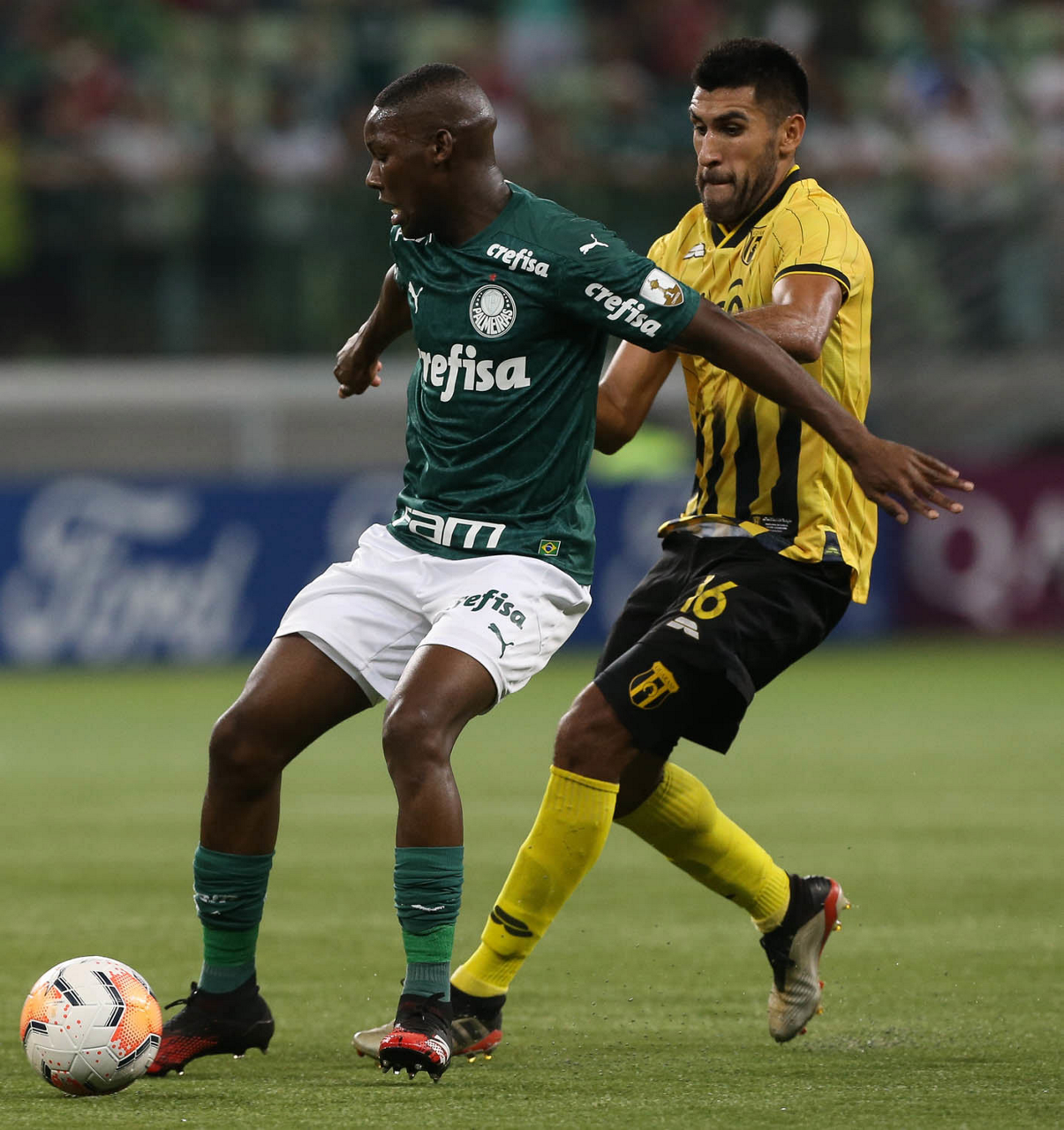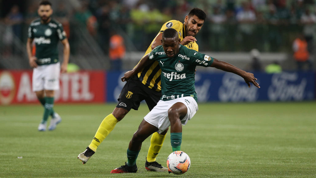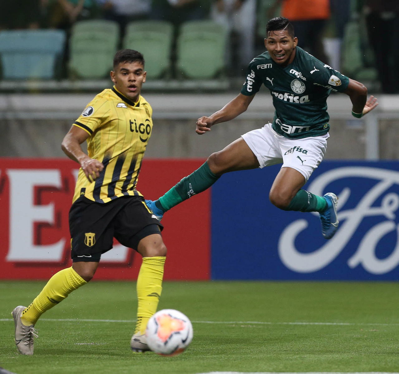 O jogador Rony, da SE Palmeiras, disputa bola com o jogador Jhohan Romaña, do C Guaraní, durante partida válida pela segunda rodada, fase de grupos, da Copa Conmebol Libertadores, na arena Allianz Parque. (Foto: Cesar Greco)