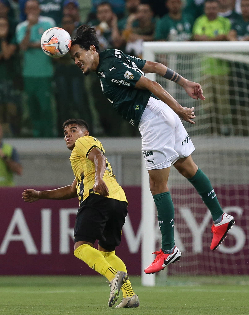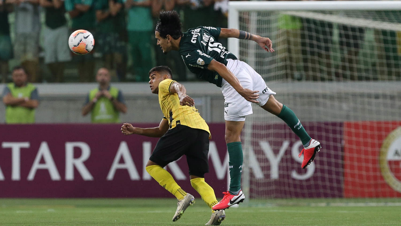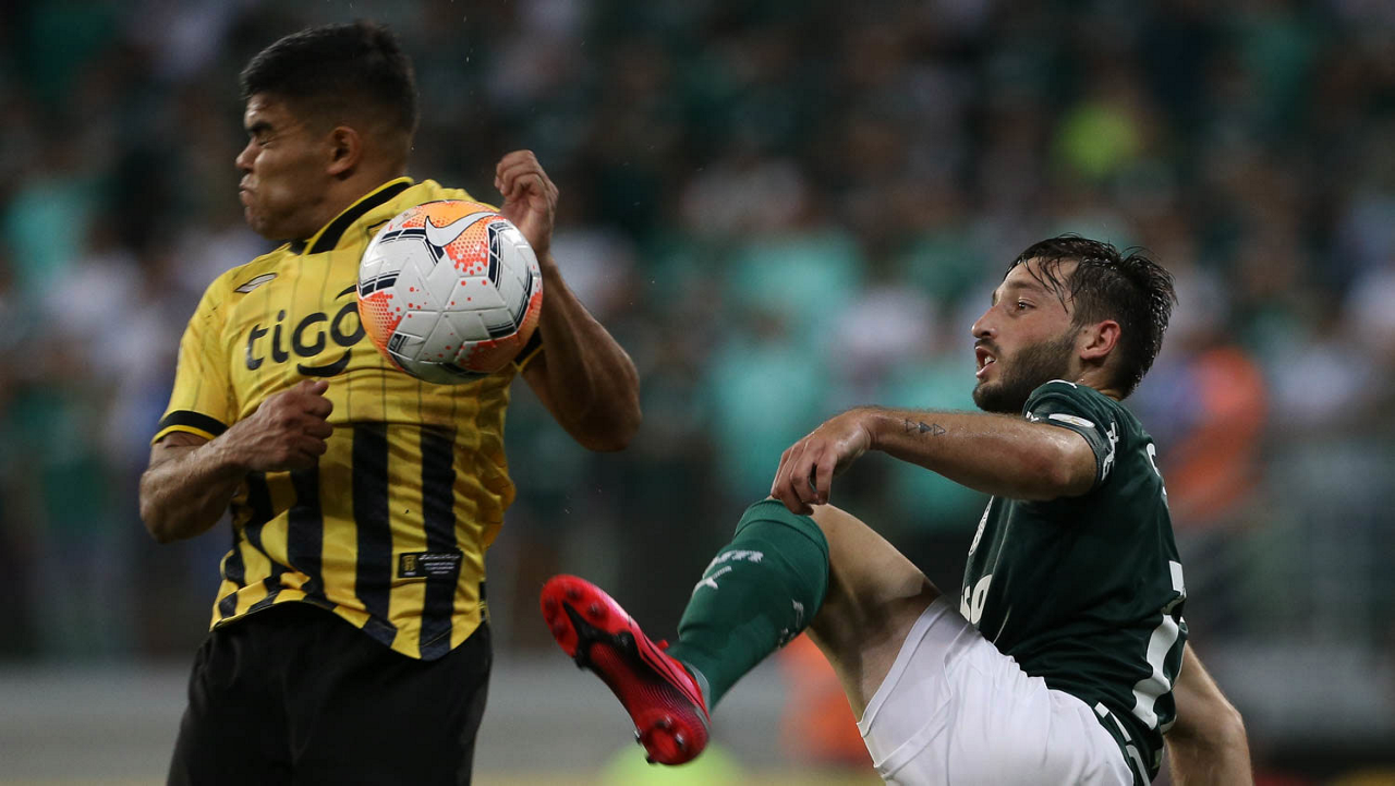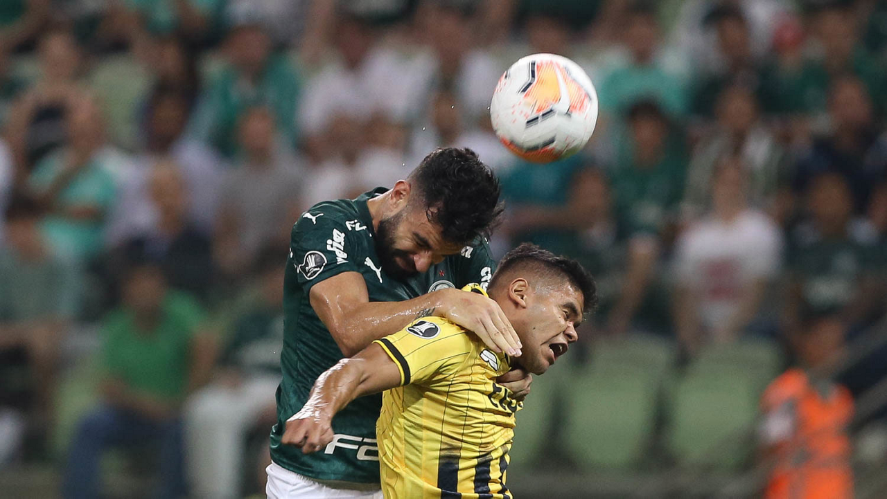 O jogador Gustavo Gómez, da SE Palmeiras, disputa bola com o jogador, do C Guaraní, durante partida válida pela segunda rodada, fase de grupos, da Copa Conmebol Libertadores, na arena Allianz Parque. (Foto: Cesar Greco)