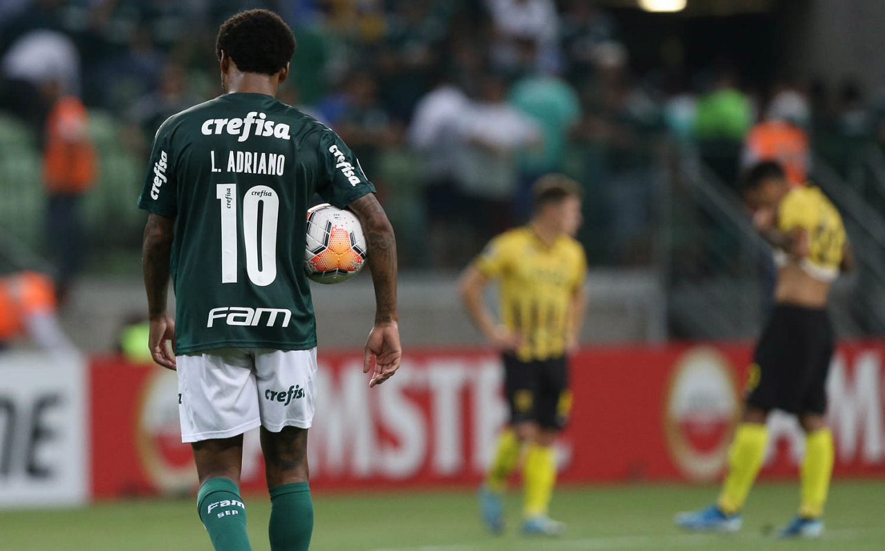 O jogador Luiz Adriano, da SE Palmeiras, sai com a bola do jogo após término da partida contra a equipe do C Guaraní, durante partida válida pela segunda rodada, fase de grupos, da Copa Conmebol Libertadores, na arena Allianz Parque. (Foto: Cesar Greco)